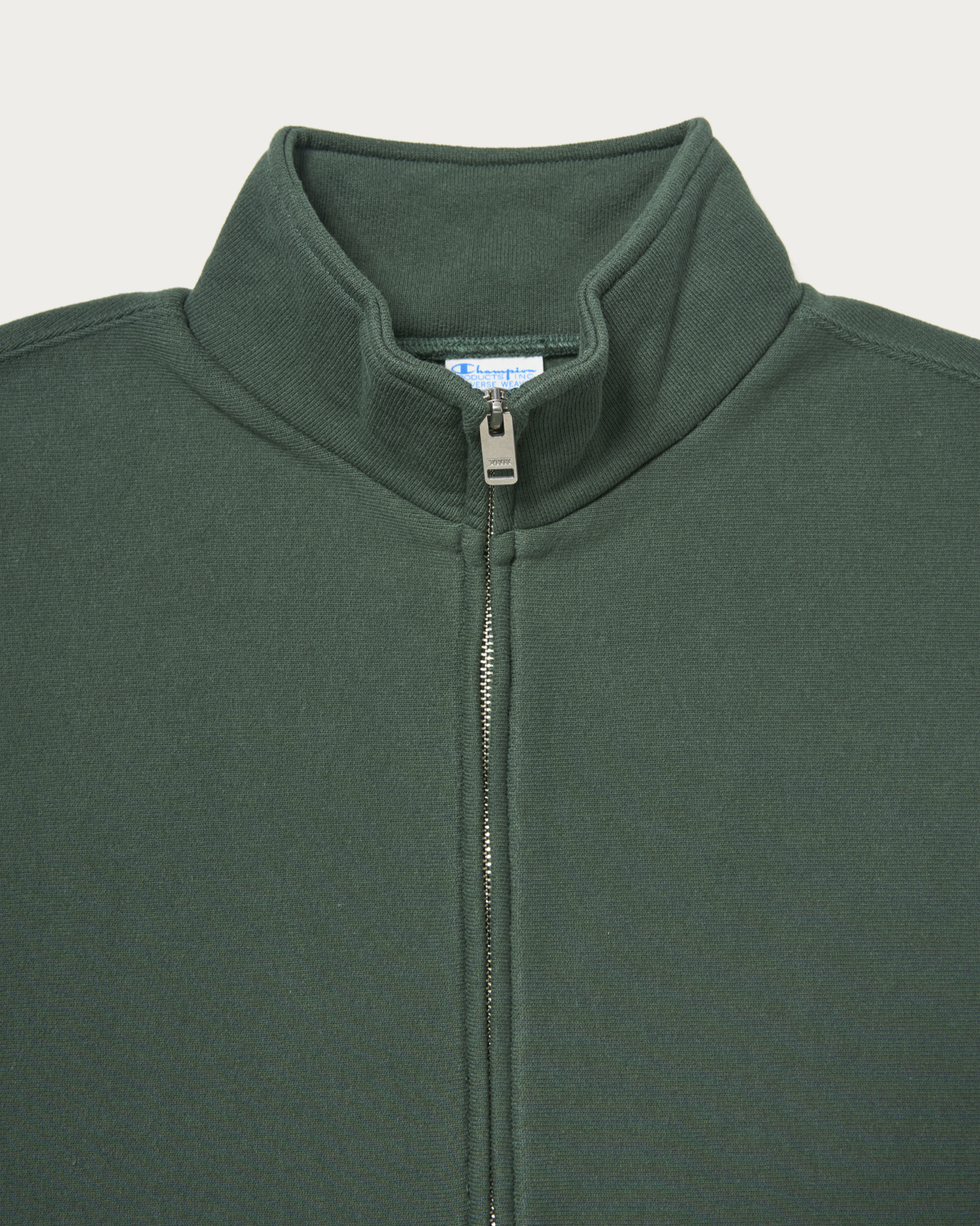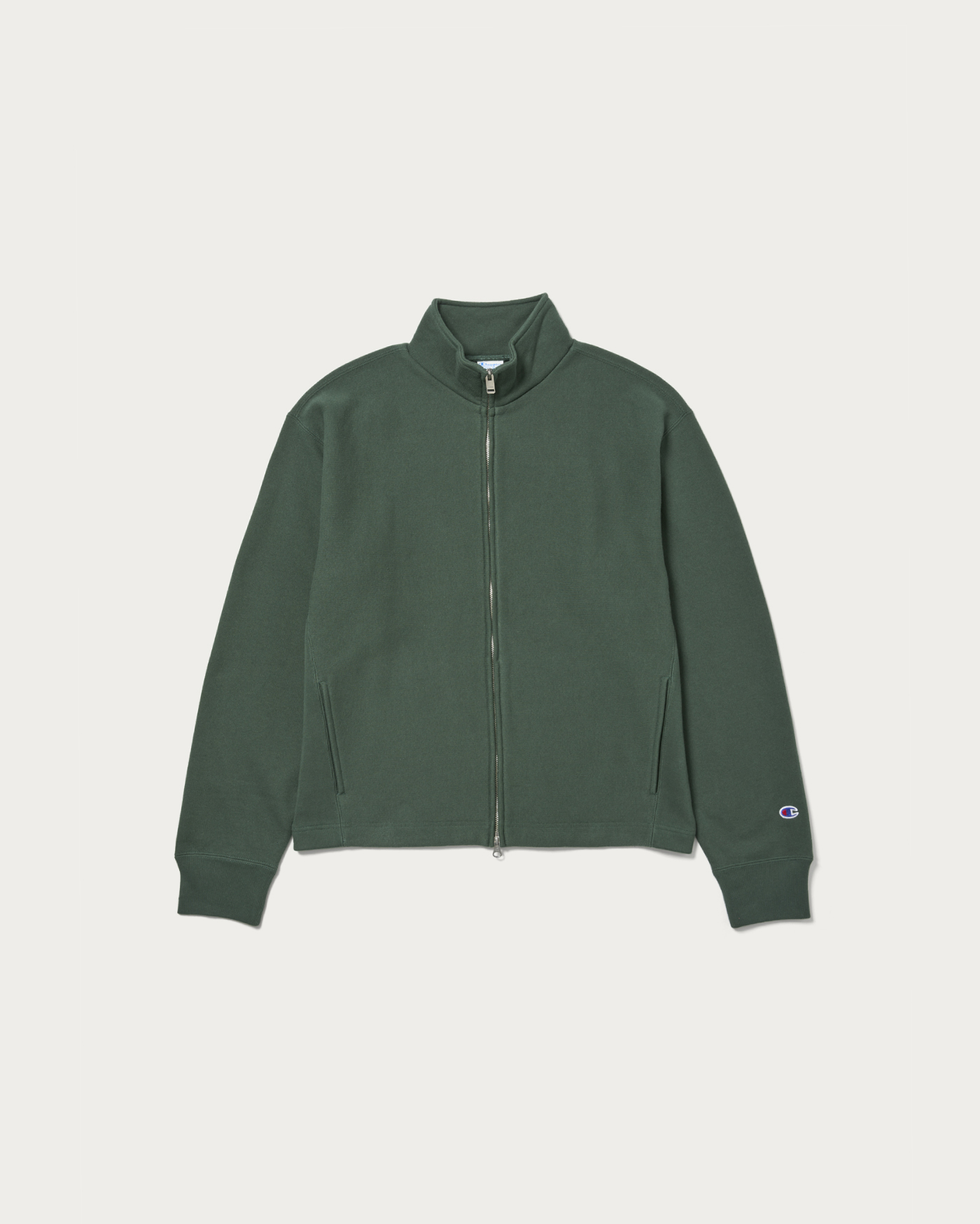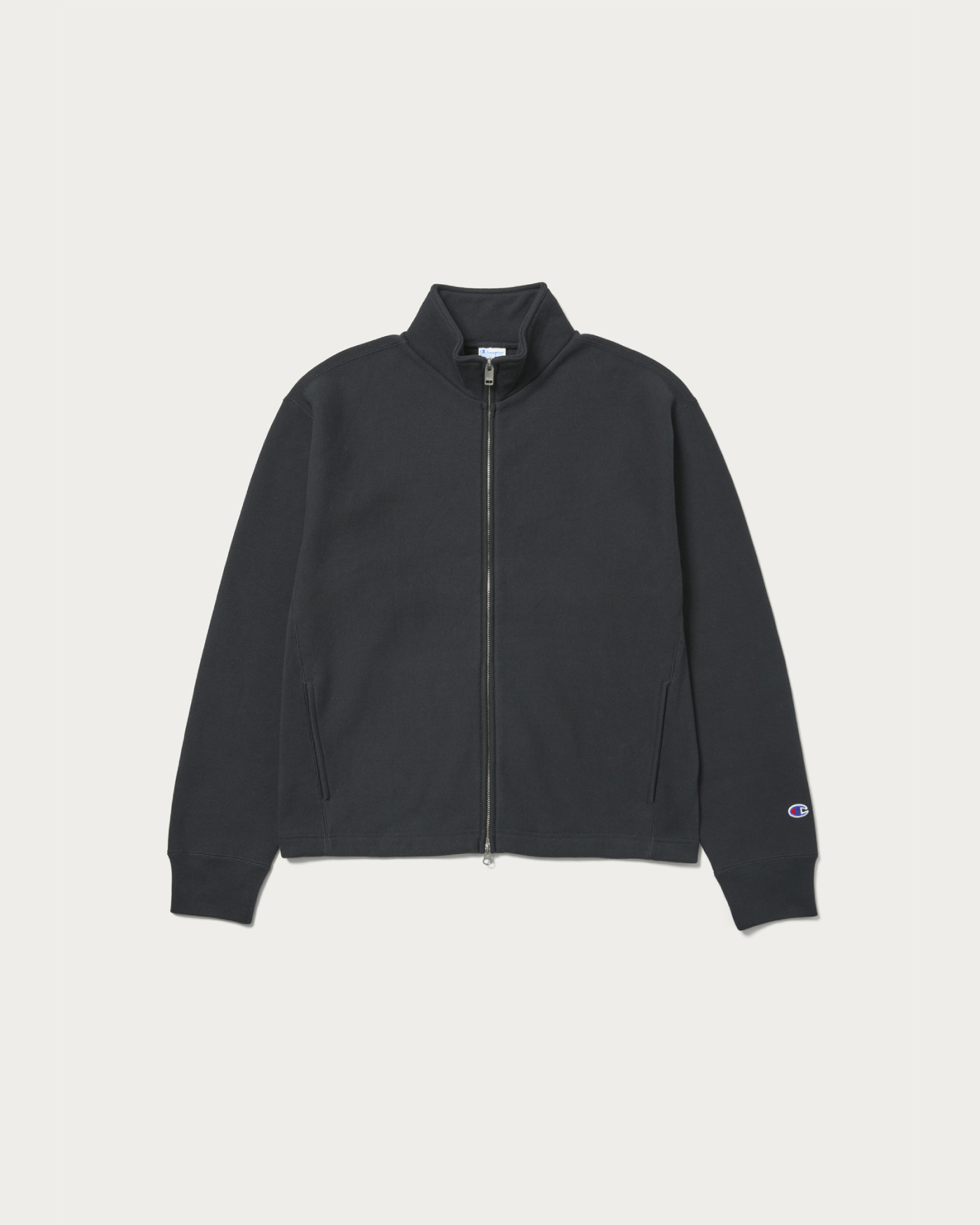 〈チャンピオン〉の定番素材である11.5ozテリーフリース(裏起毛)を使用したフルジップ仕様のスタンドカラースウェット。短めに設定した着丈や光沢のあるフロントファスナー、落ち着いた色合いがポイントです。ライトアウターとしても着られる使い勝手のよさも魅力です。