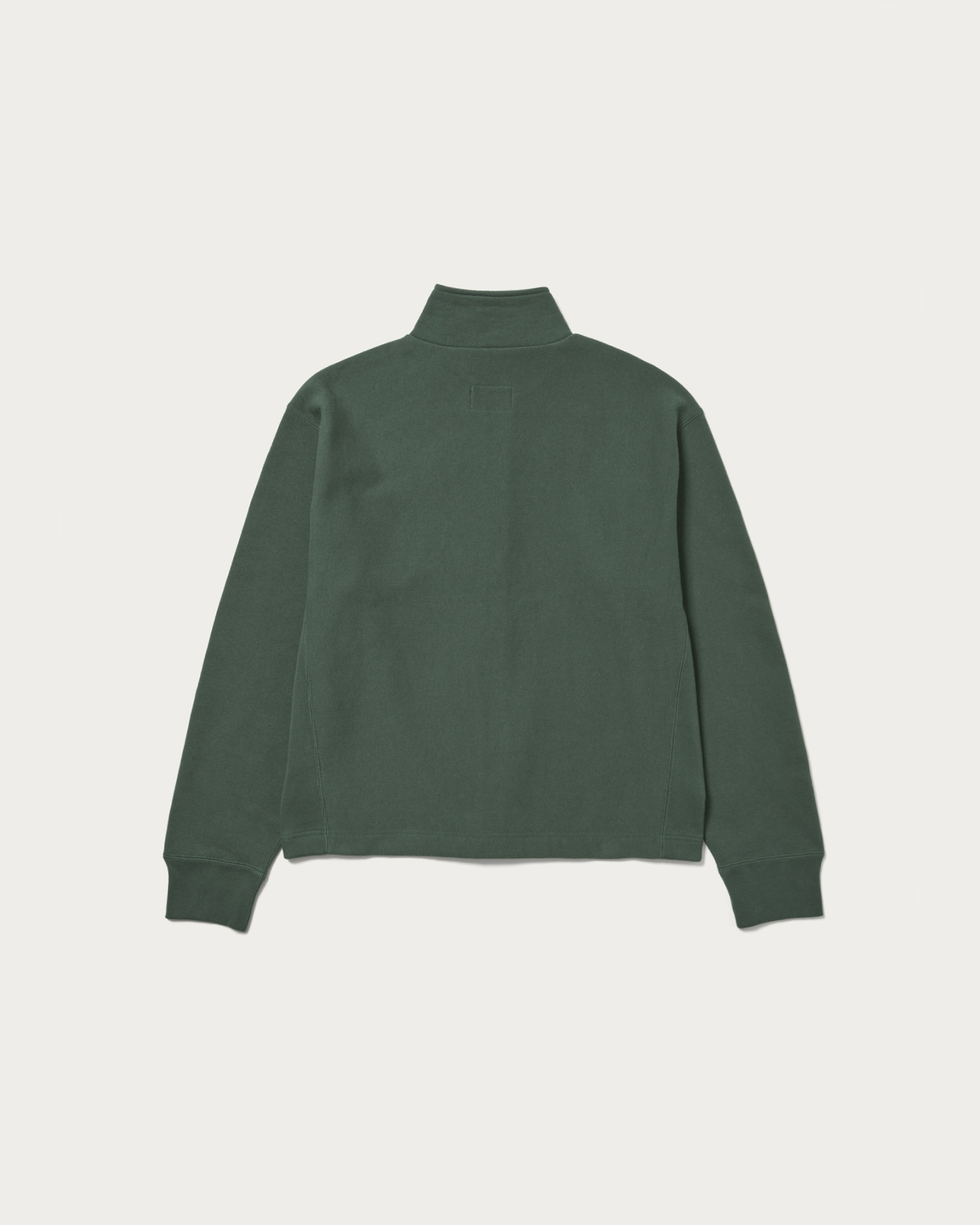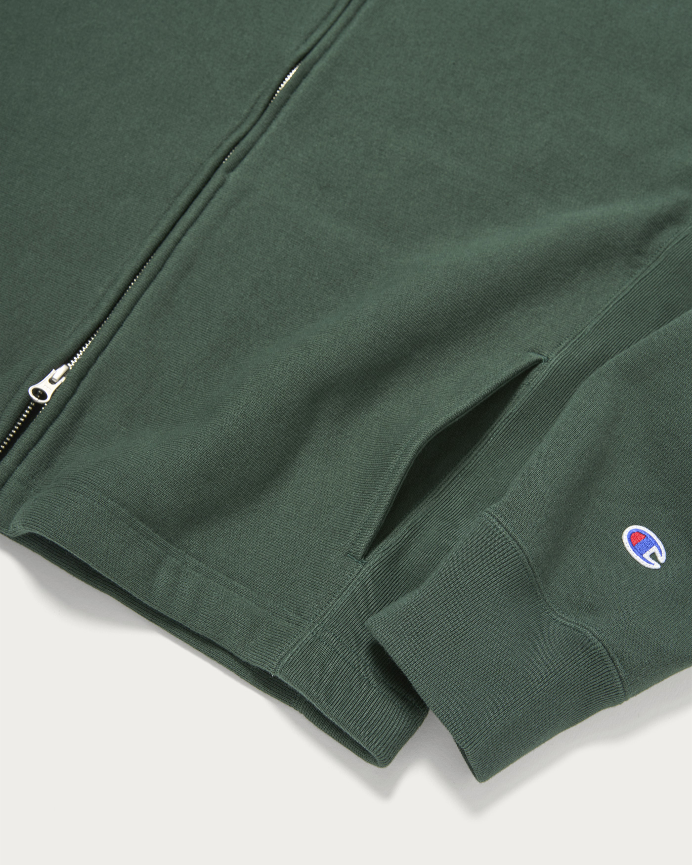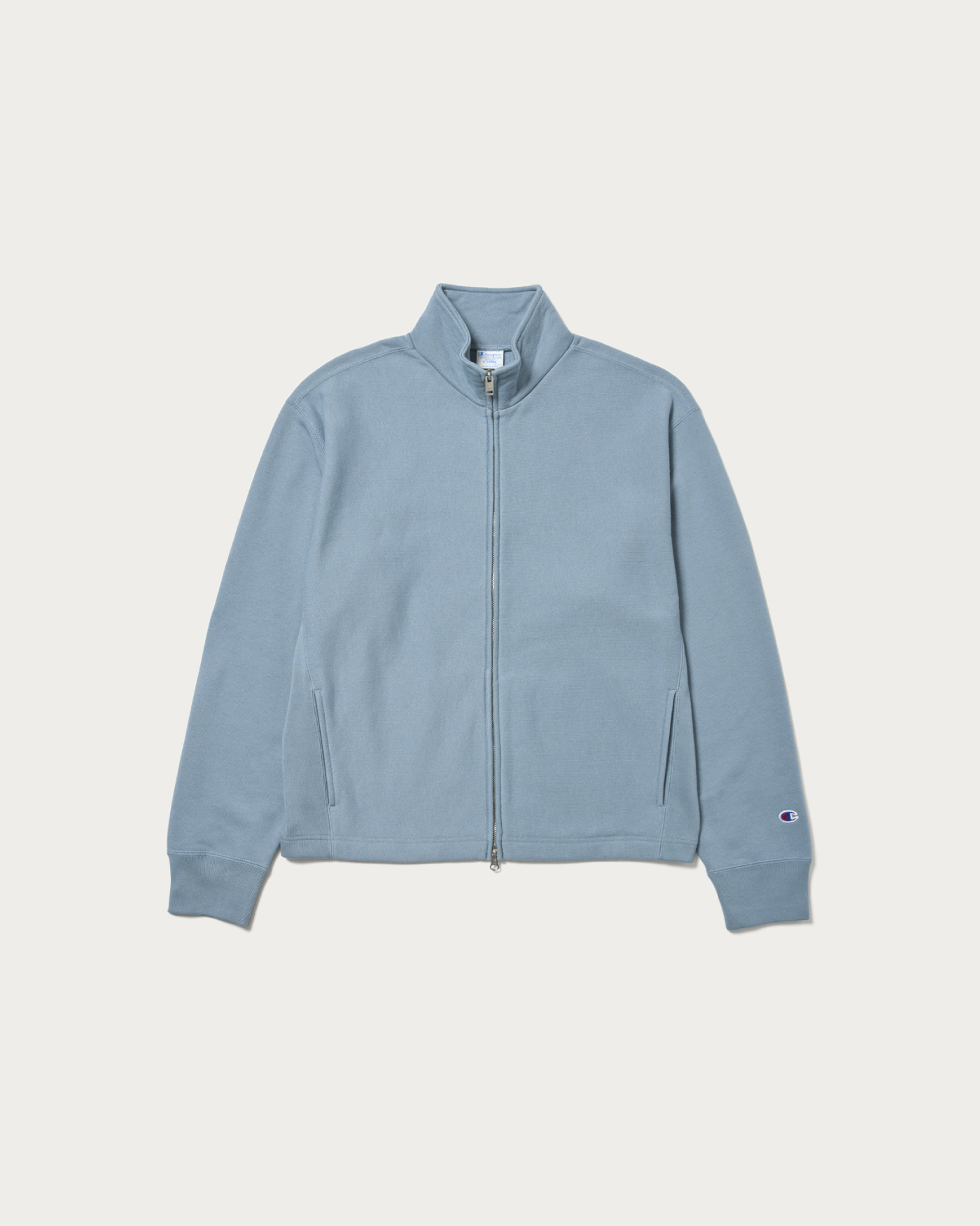 〈チャンピオン〉の定番素材である11.5ozテリーフリース(裏起毛)を使用したフルジップ仕様のスタンドカラースウェット。短めに設定した着丈や光沢のあるフロントファスナー、落ち着いた色合いがポイントです。ライトアウターとしても着られる使い勝手のよさも魅力です。