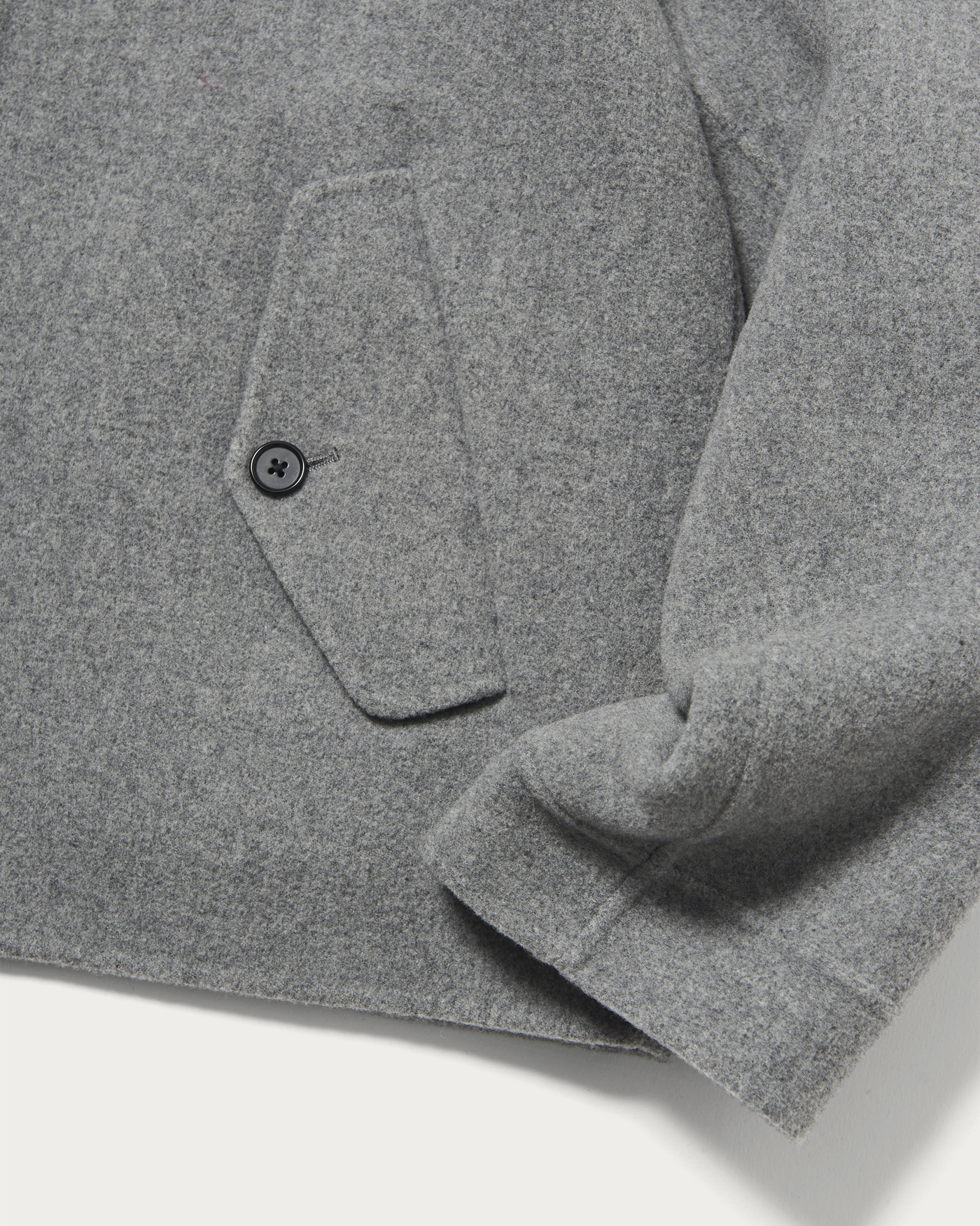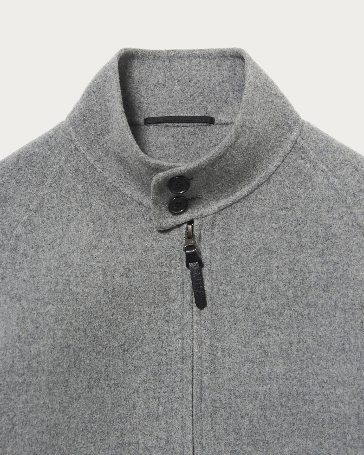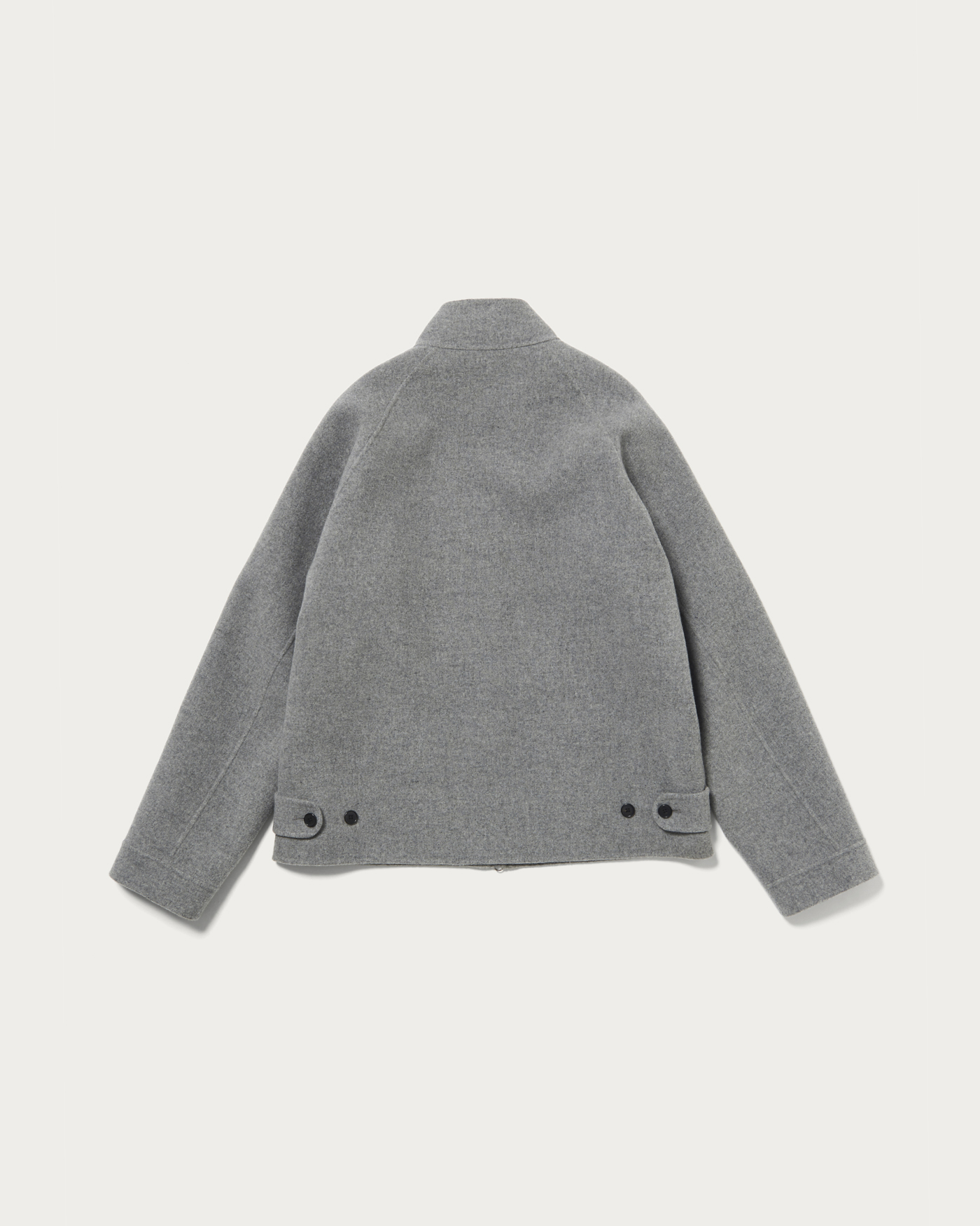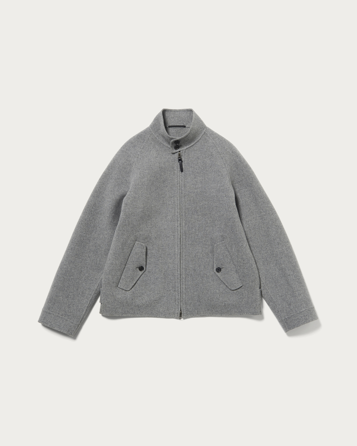 ウールカシミヤのダブルフェイス素材を使用したハリントンジャケット。リバー縫製による仕立てで、厚みがありながらも柔らかく、上品な見た目と軽やかな着心地を実現しました。腕まわりにゆとりを持たせた設計で可動域が広く、コート代わりとしても着用できる大胆なフォルムが特徴です。素材は、2枚の生地を接結して1枚に織り上げたダブルフェイス。カシミヤをブレンドすることで、ふくらみのある肉厚さとしなやかさを両立し、ベロア仕上げにより柔らかく温もりのある風合いに仕上げています。