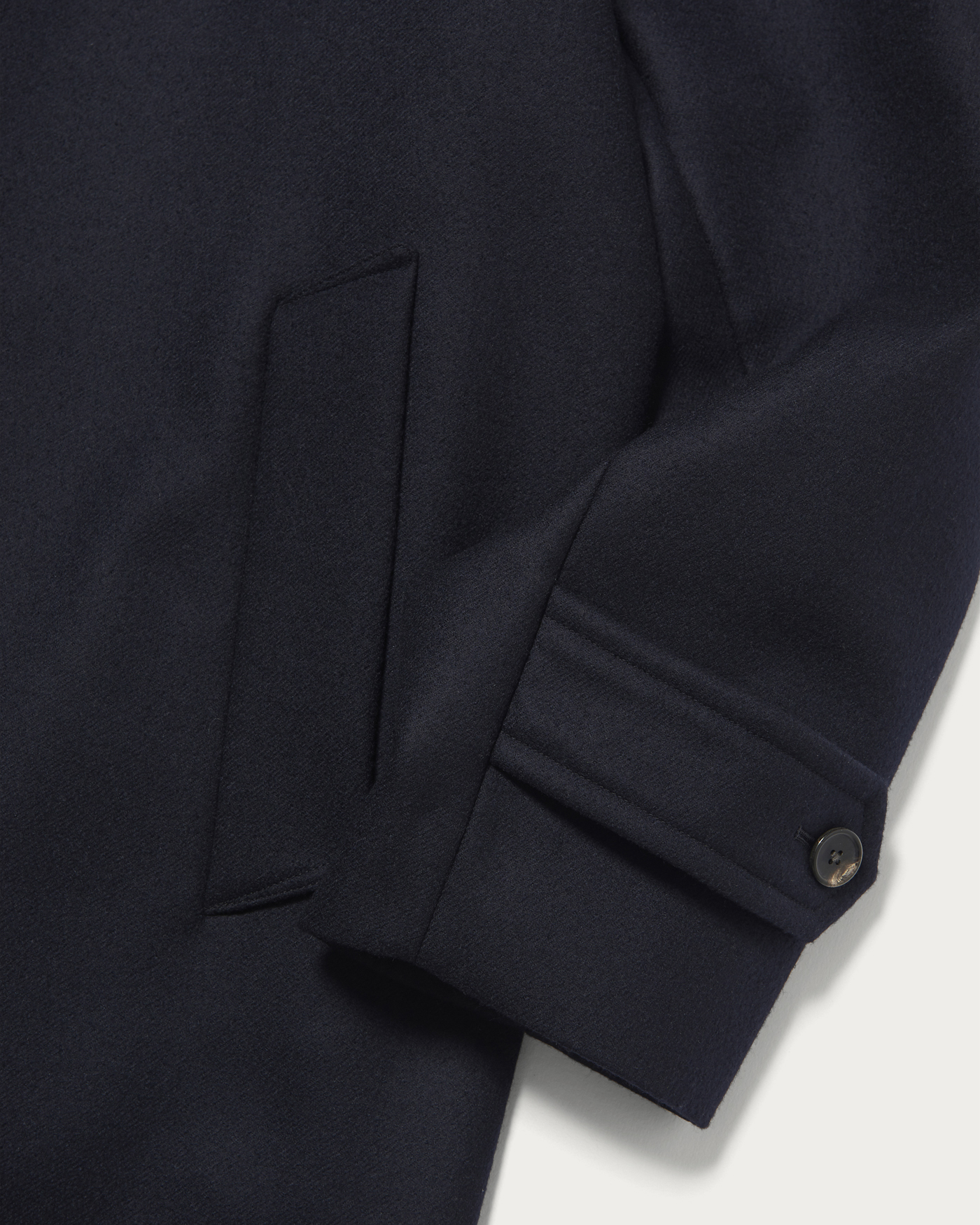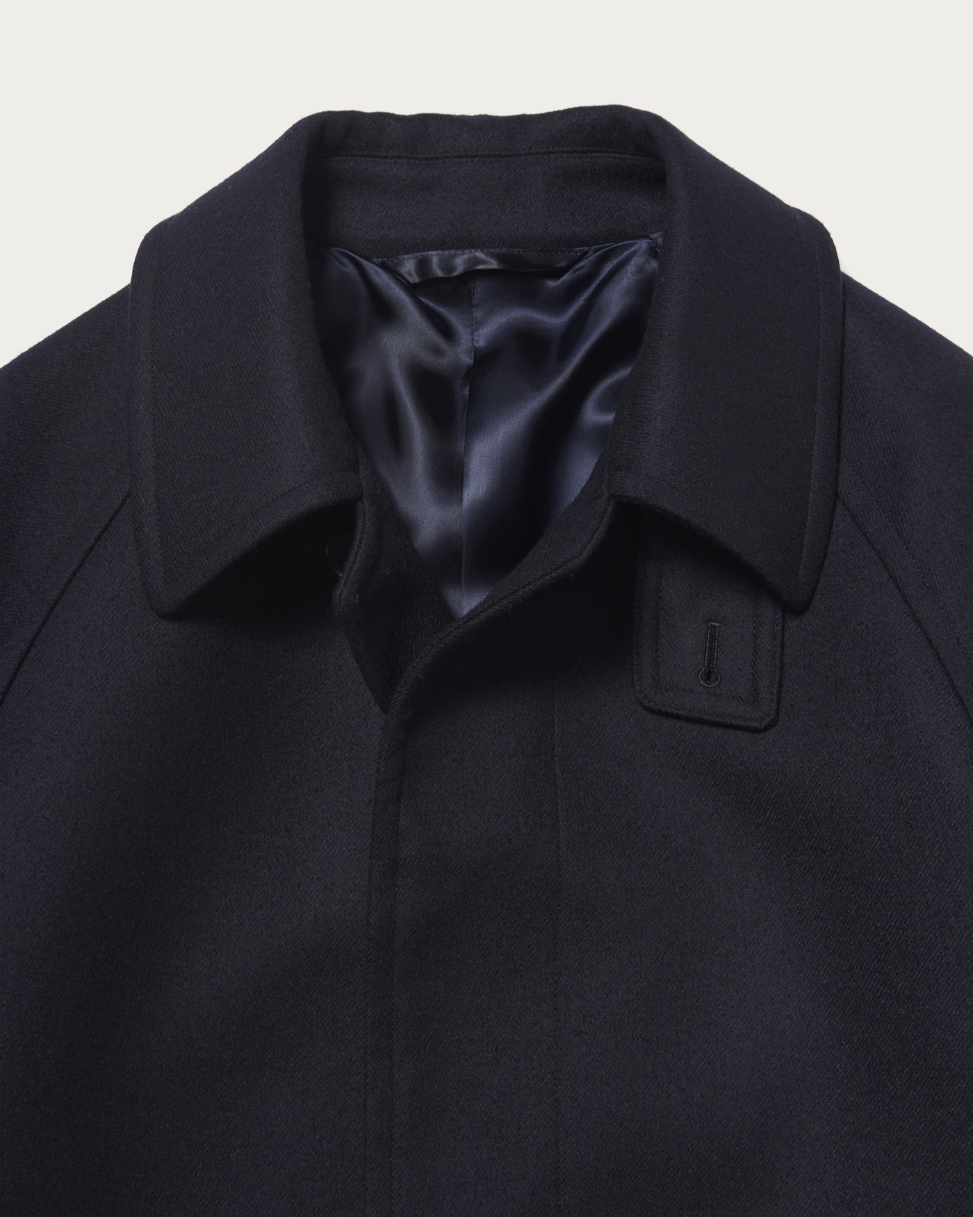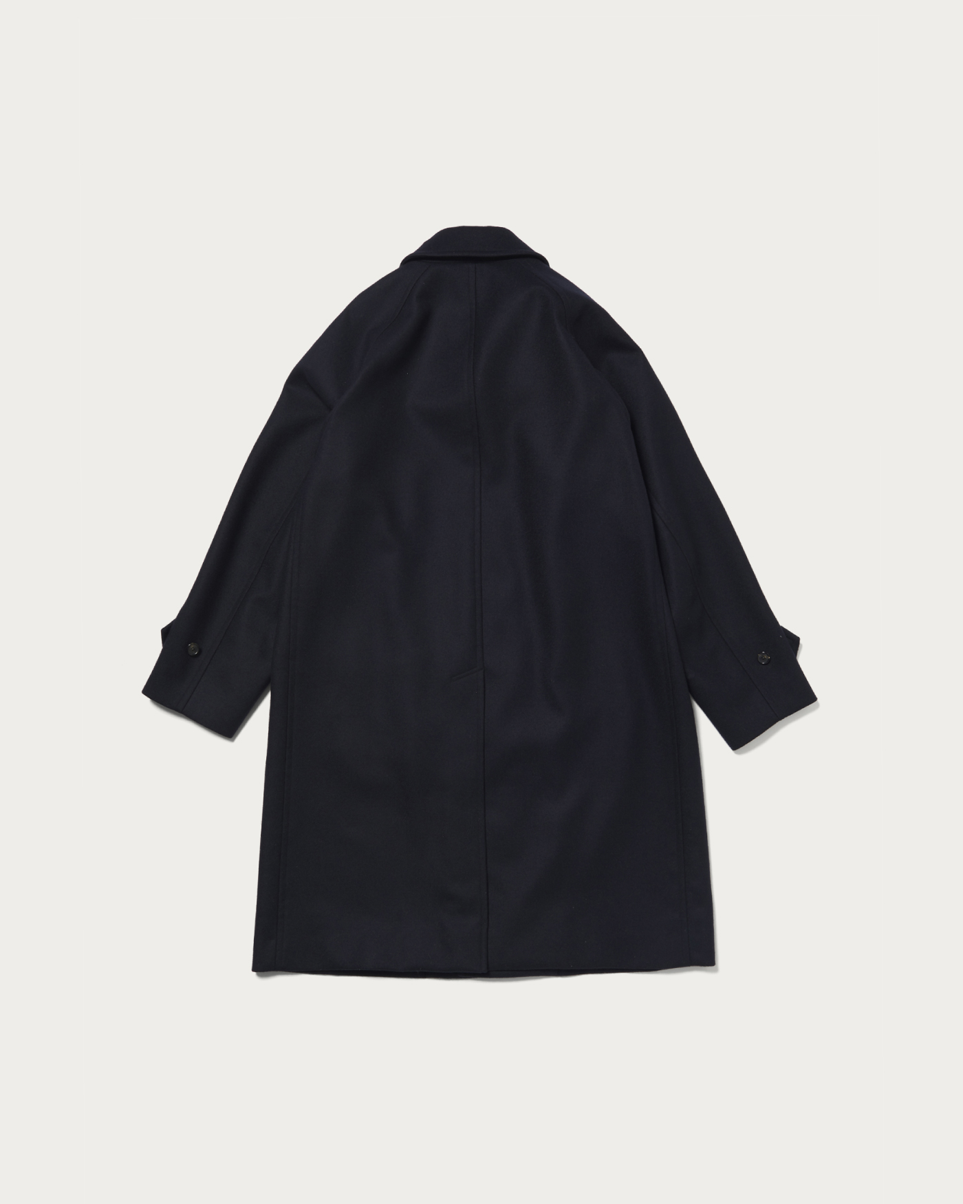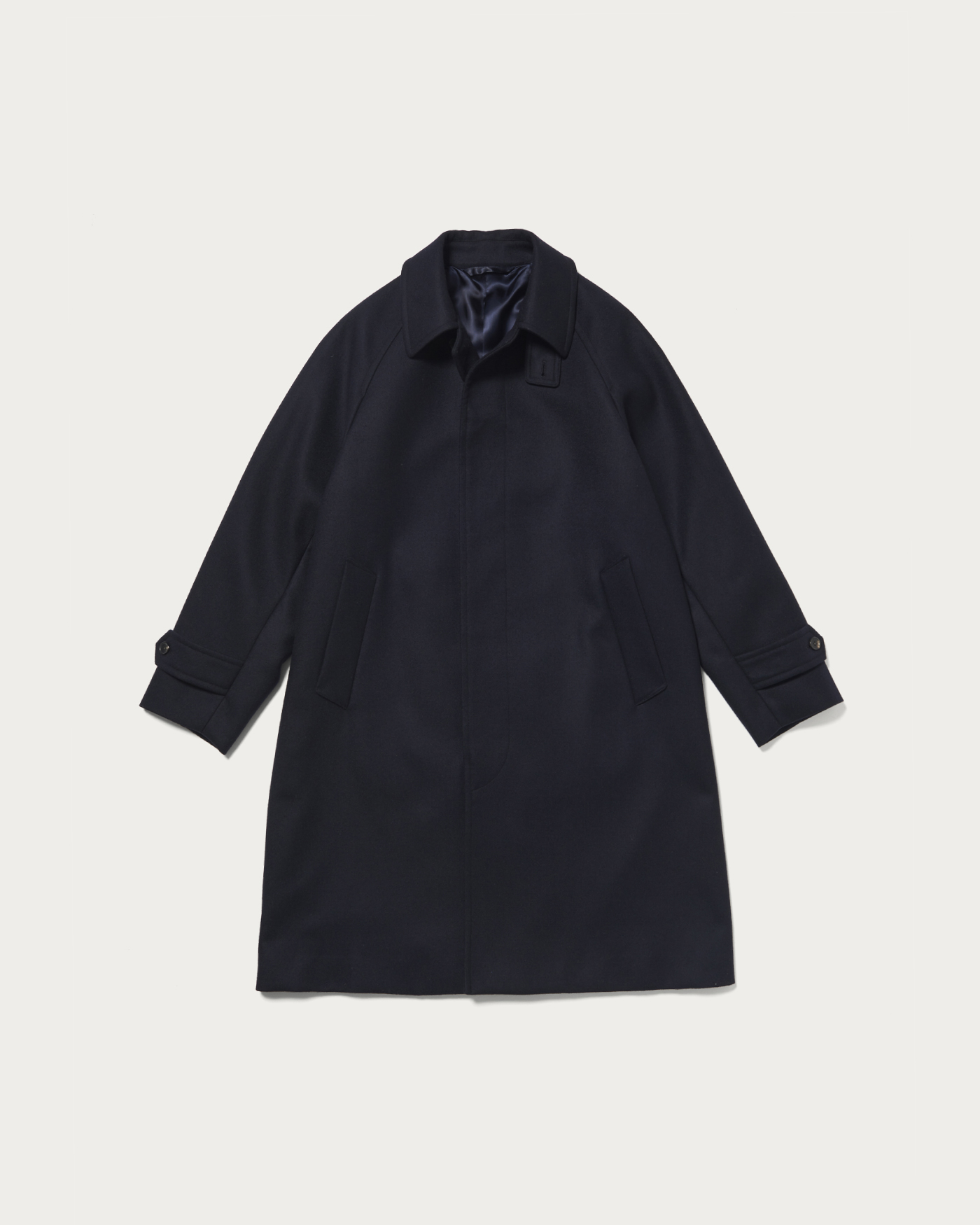 定番のバルマカーンコートを、今シーズンは風合いの良いメルトン素材でアップデート。オン・オフ問わずさまざまなシーンに対応する汎用性の高い一着です。今季は着丈をやや短く設定し、軽快な印象に。着用時の軽さと美しいドレープ感も魅力です。素材には、毛足のない上質なメルトンを採用。一般的には紡毛を用いるところを、細番手の梳毛原料で仕上げることで、自然な光沢としなやかさを実現。コシがありながらも柔らかく、軽やかな着心地に仕上げています。