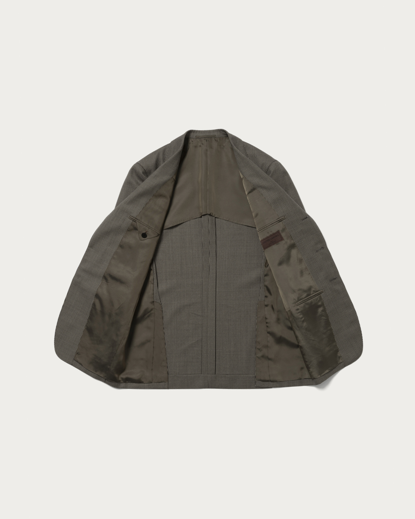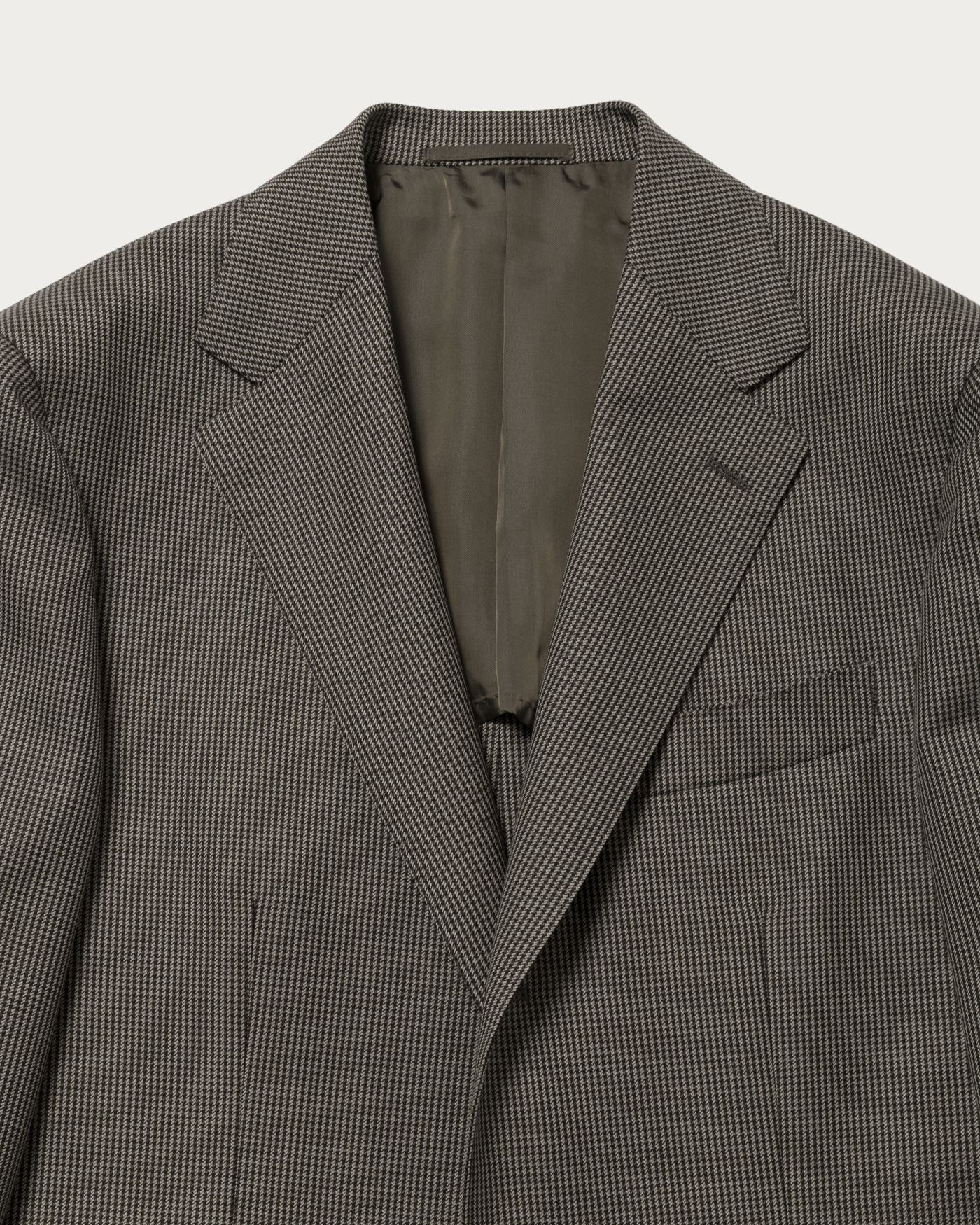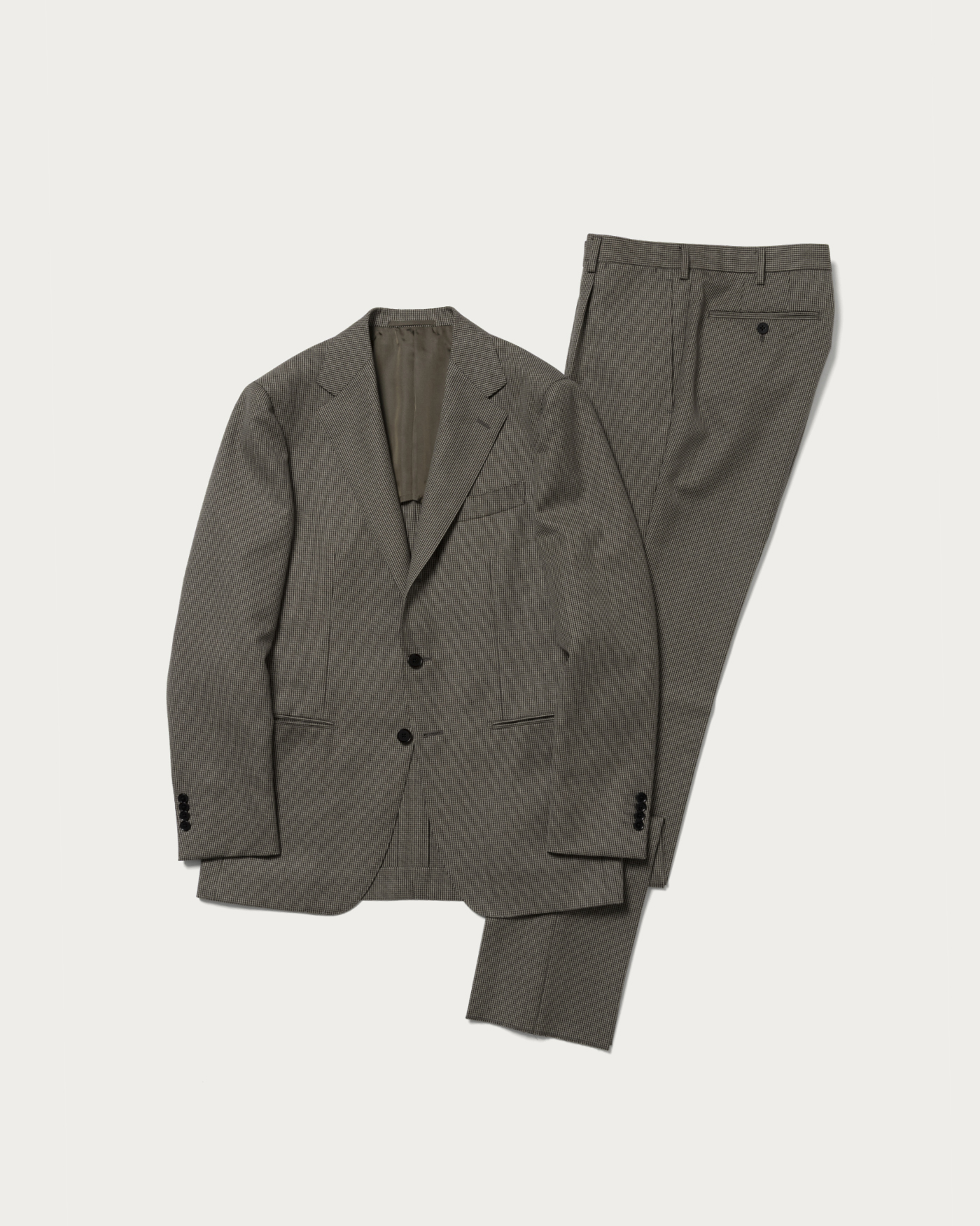 クラシックを現代的に表現したスーツ。ハウンドトゥース柄がトラディショナルで上品な印象を与えます。ジャケットは広めの肩幅と長めの着丈に、美しいウエストシェイプを備え、立体的な袖付け(マニカカミーチャ仕様)が特徴。ボトムスは深めの股上とゆとりのあるストレートラインで、ジャケットとのバランスを意識した設計です。素材は、イタリア・VBC社のクラシックレンジの中でも英国的な気質を持つオーセンティックなファブリック。仕立て映えのする生地感に加え、カントリーチェックを柔らかな配色に落とし込んだ〈UNITED ARROWS〉別注素材です。