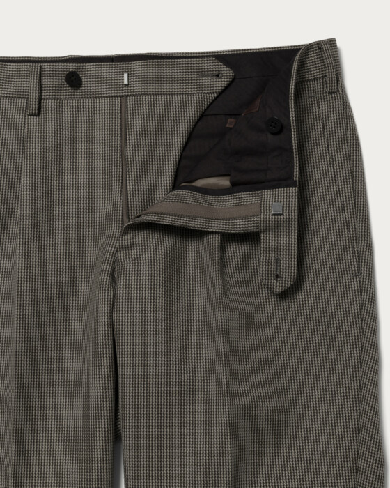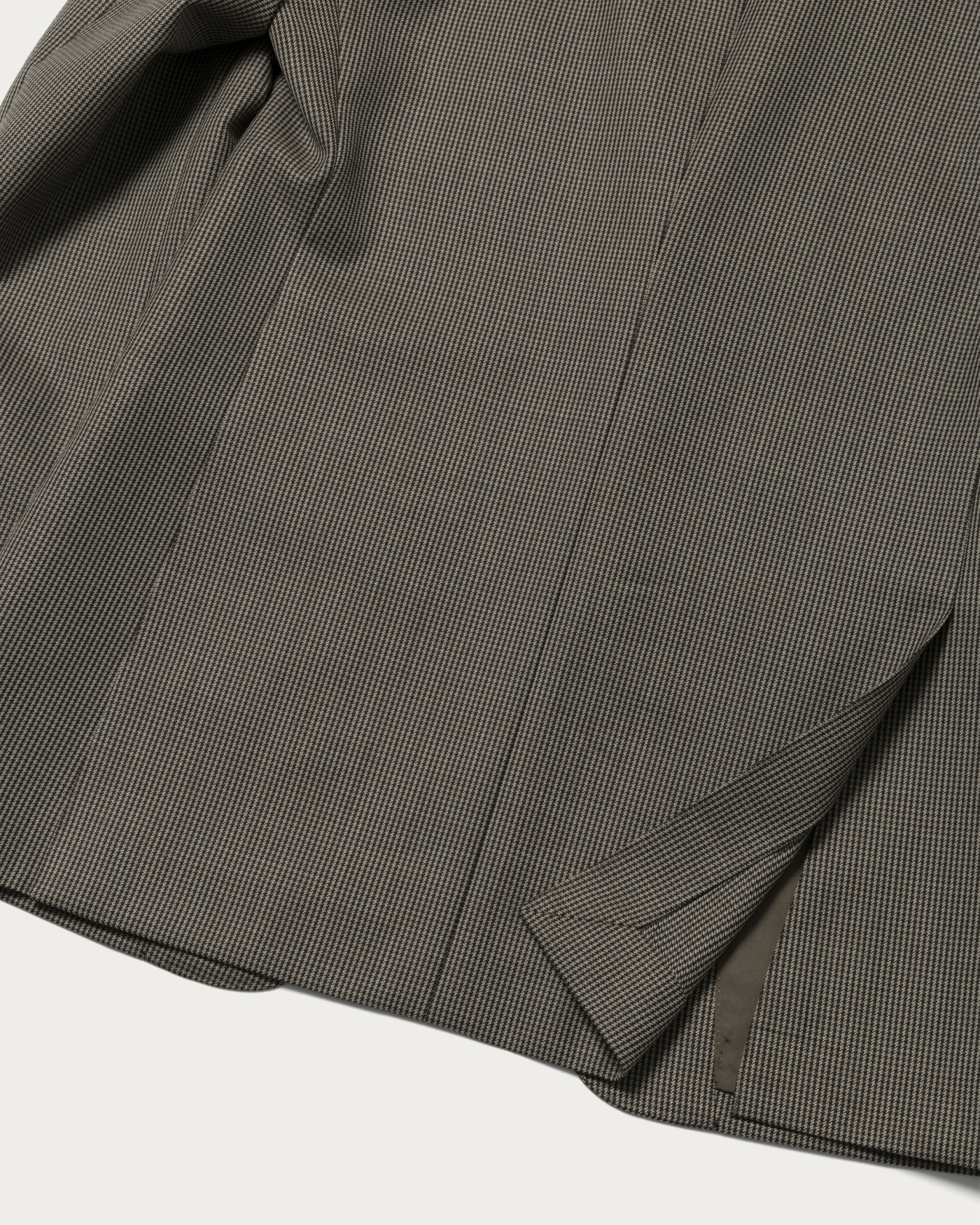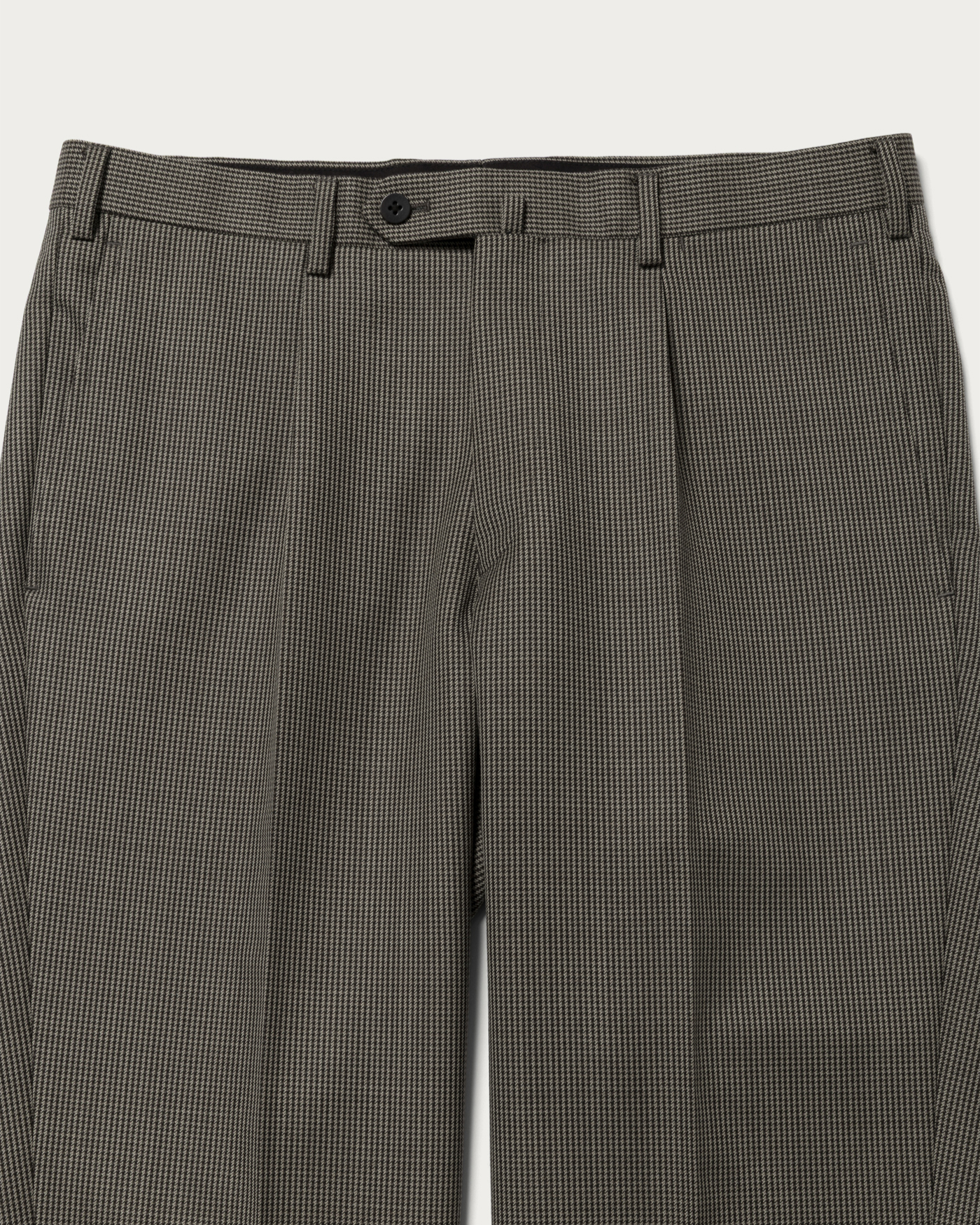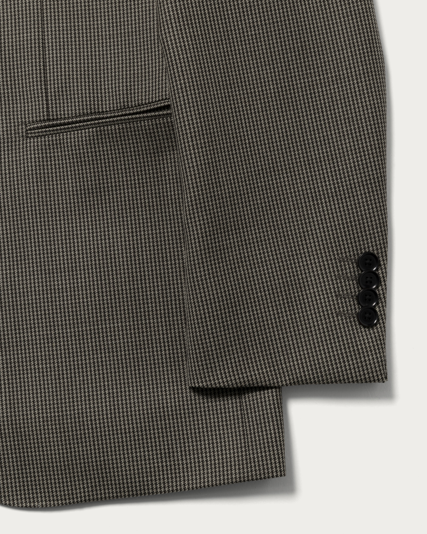 クラシックを現代的に表現したスーツ。ハウンドトゥース柄がトラディショナルで上品な印象を与えます。ジャケットは広めの肩幅と長めの着丈に、美しいウエストシェイプを備え、立体的な袖付け(マニカカミーチャ仕様)が特徴。ボトムスは深めの股上とゆとりのあるストレートラインで、ジャケットとのバランスを意識した設計です。素材は、イタリア・VBC社のクラシックレンジの中でも英国的な気質を持つオーセンティックなファブリック。仕立て映えのする生地感に加え、カントリーチェックを柔らかな配色に落とし込んだ〈UNITED ARROWS〉別注素材です。