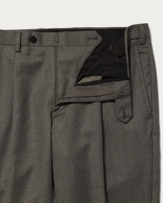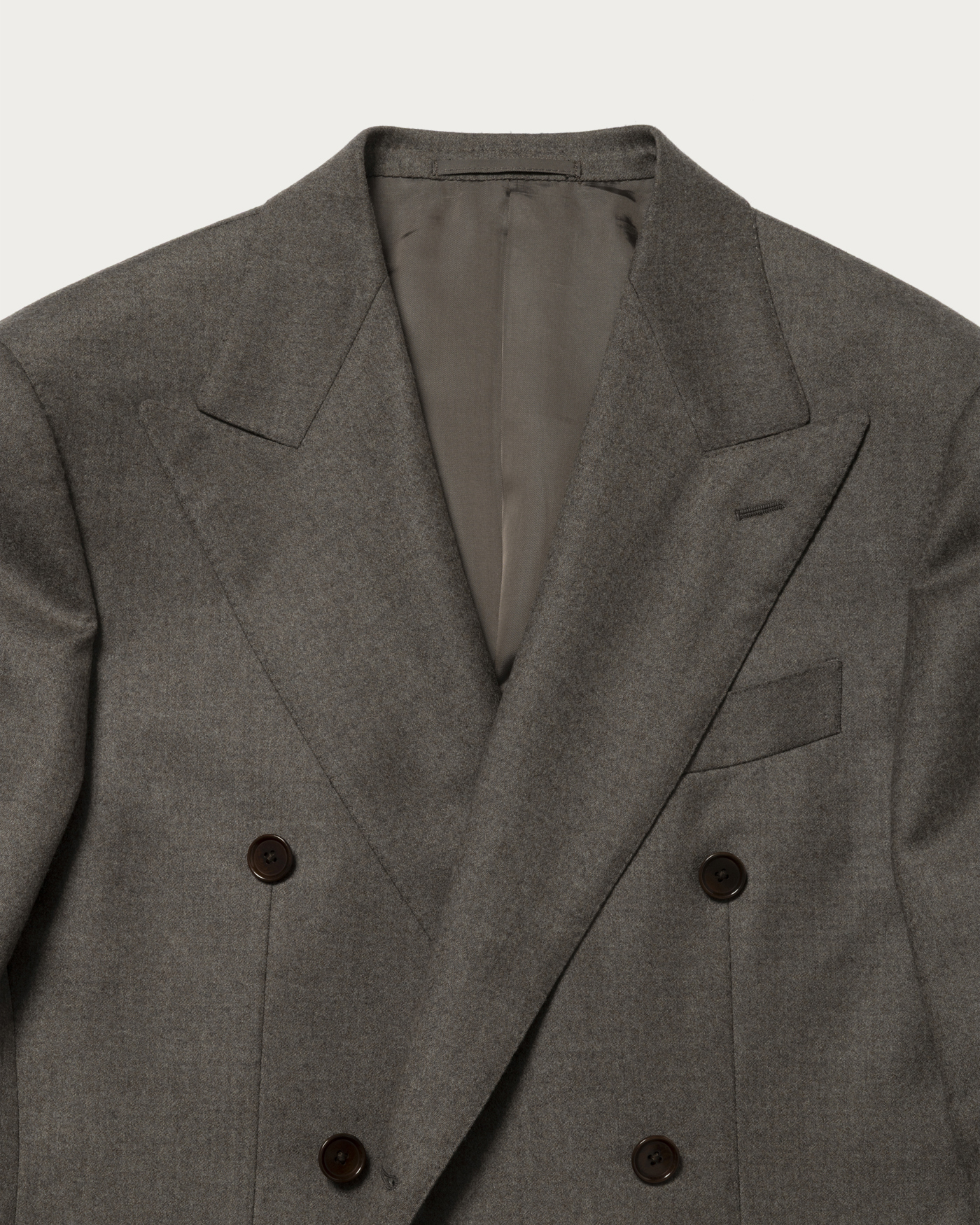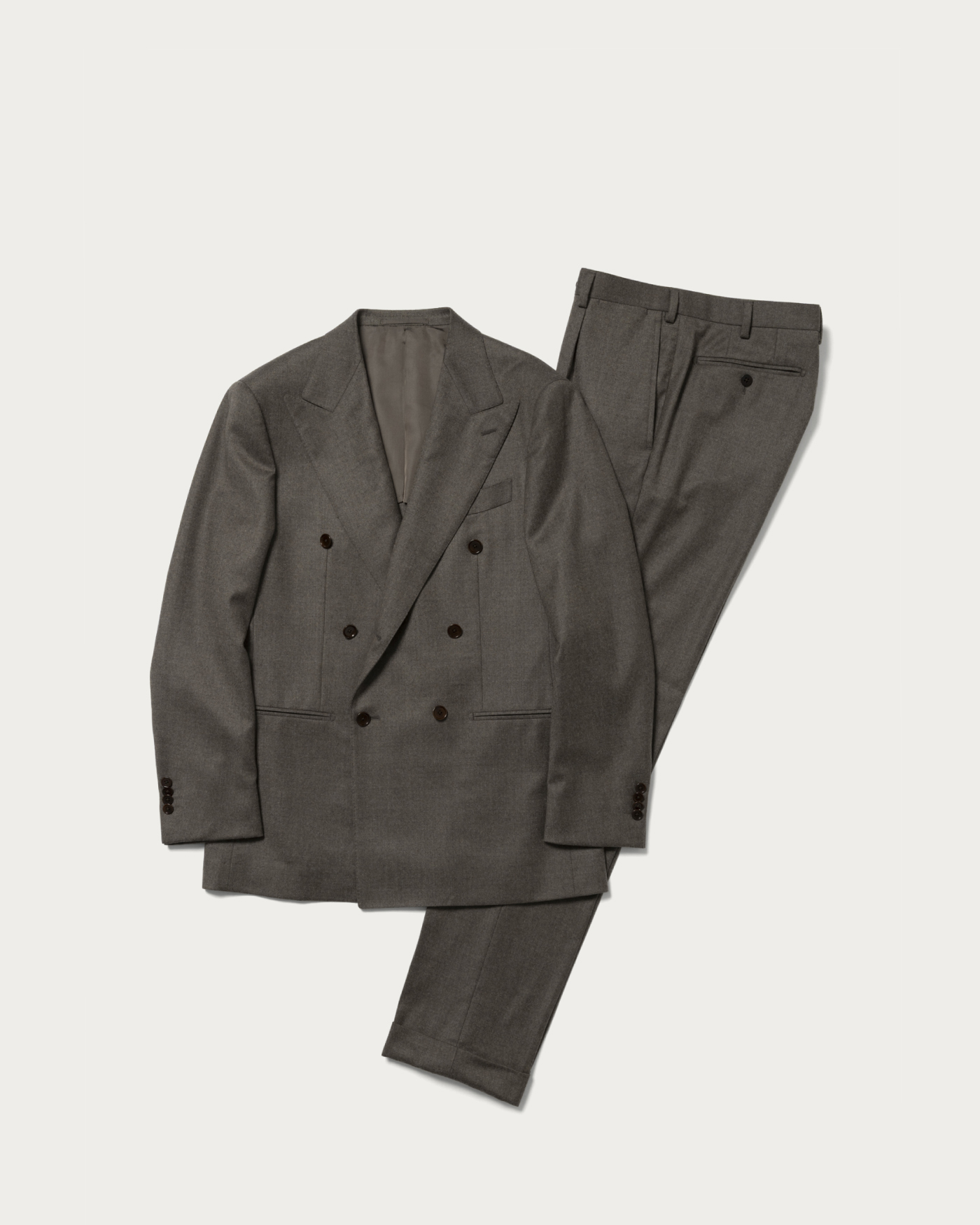 クラシックを現代に再解釈したスーツ。柔らかく優しい色味と、ふんわりとした素材感が印象的な一着です。6ボタン下掛けのダブルジャケットは、広めの肩幅と長めの着丈、美しいウエストシェイプに加え、立体的な袖付け(マニカカミーチャ仕様)が特徴。クラシックな構築感の中に、軽やかさと柔らかさが共存します。ボトムスは深めの股上とゆとりのあるストレートラインで、ジャケットとのバランスを意識した設計。素材には「Vitale Barberis Canonico」社製のライトフランネルを使用し、仕立て映えするふくらみとハリ、そして優しい肌触りを兼ね備えています。