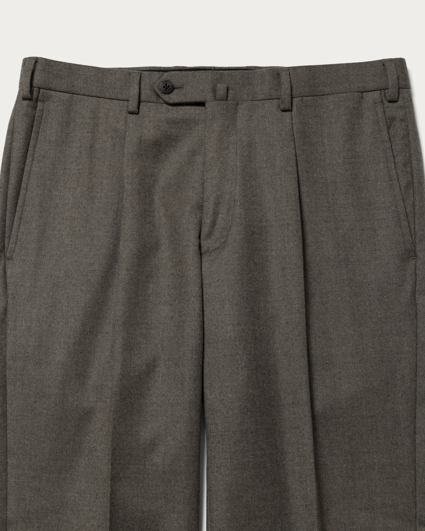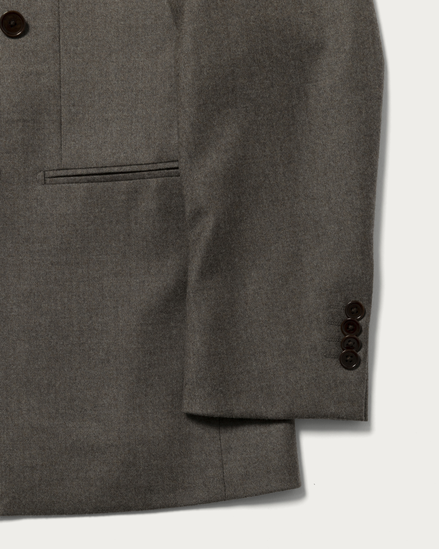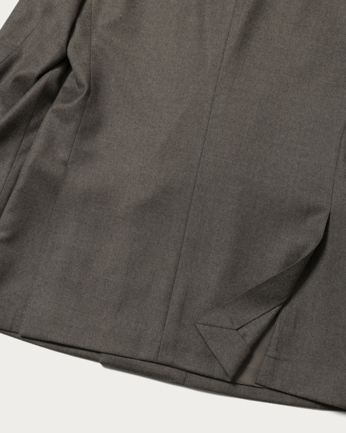 クラシックを現代に再解釈したスーツ。柔らかく優しい色味と、ふんわりとした素材感が印象的な一着です。6ボタン下掛けのダブルジャケットは、広めの肩幅と長めの着丈、美しいウエストシェイプに加え、立体的な袖付け(マニカカミーチャ仕様)が特徴。クラシックな構築感の中に、軽やかさと柔らかさが共存します。ボトムスは深めの股上とゆとりのあるストレートラインで、ジャケットとのバランスを意識した設計。素材には「Vitale Barberis Canonico」社製のライトフランネルを使用し、仕立て映えするふくらみとハリ、そして優しい肌触りを兼ね備えています。