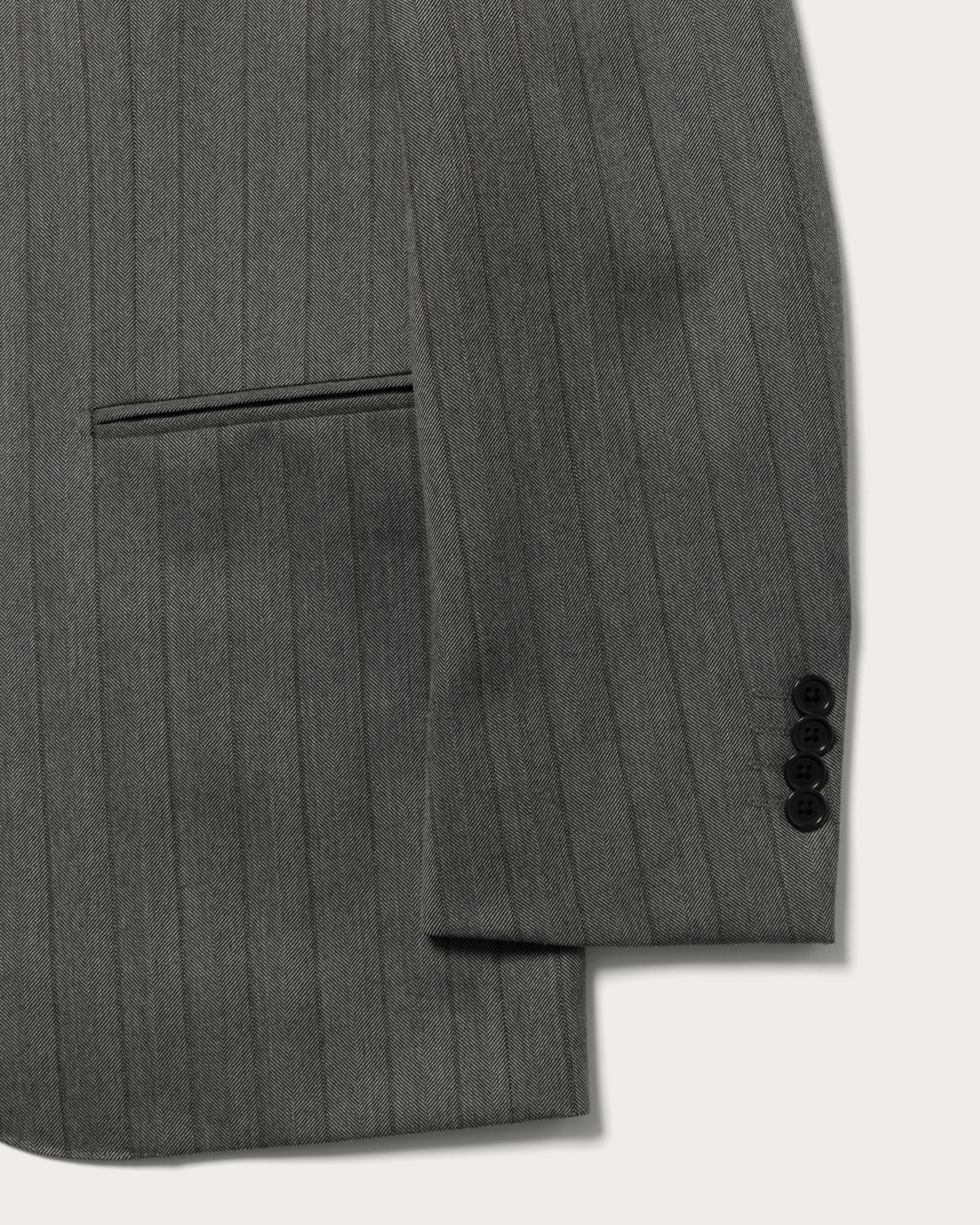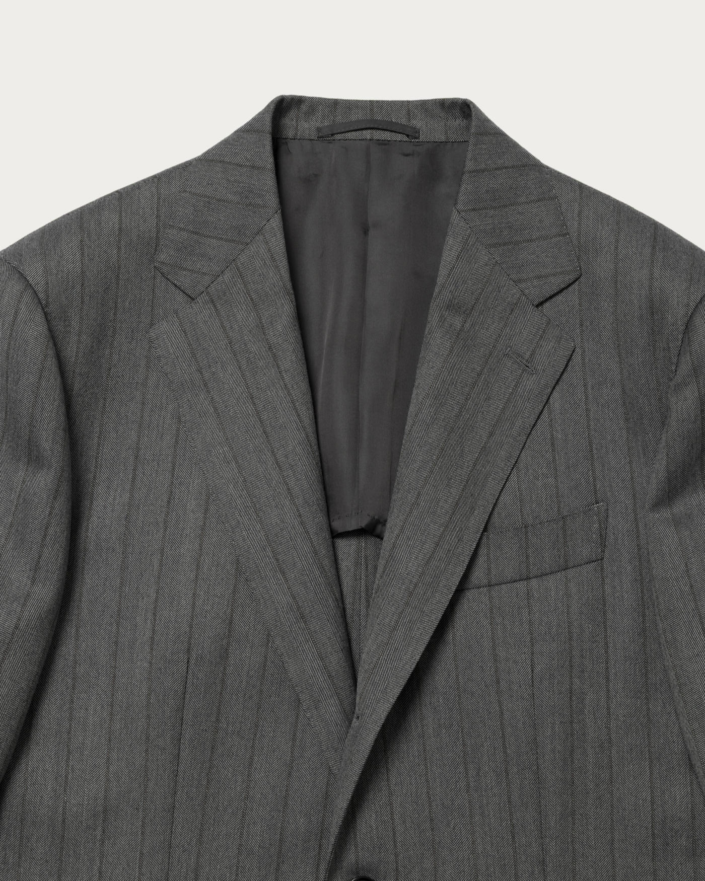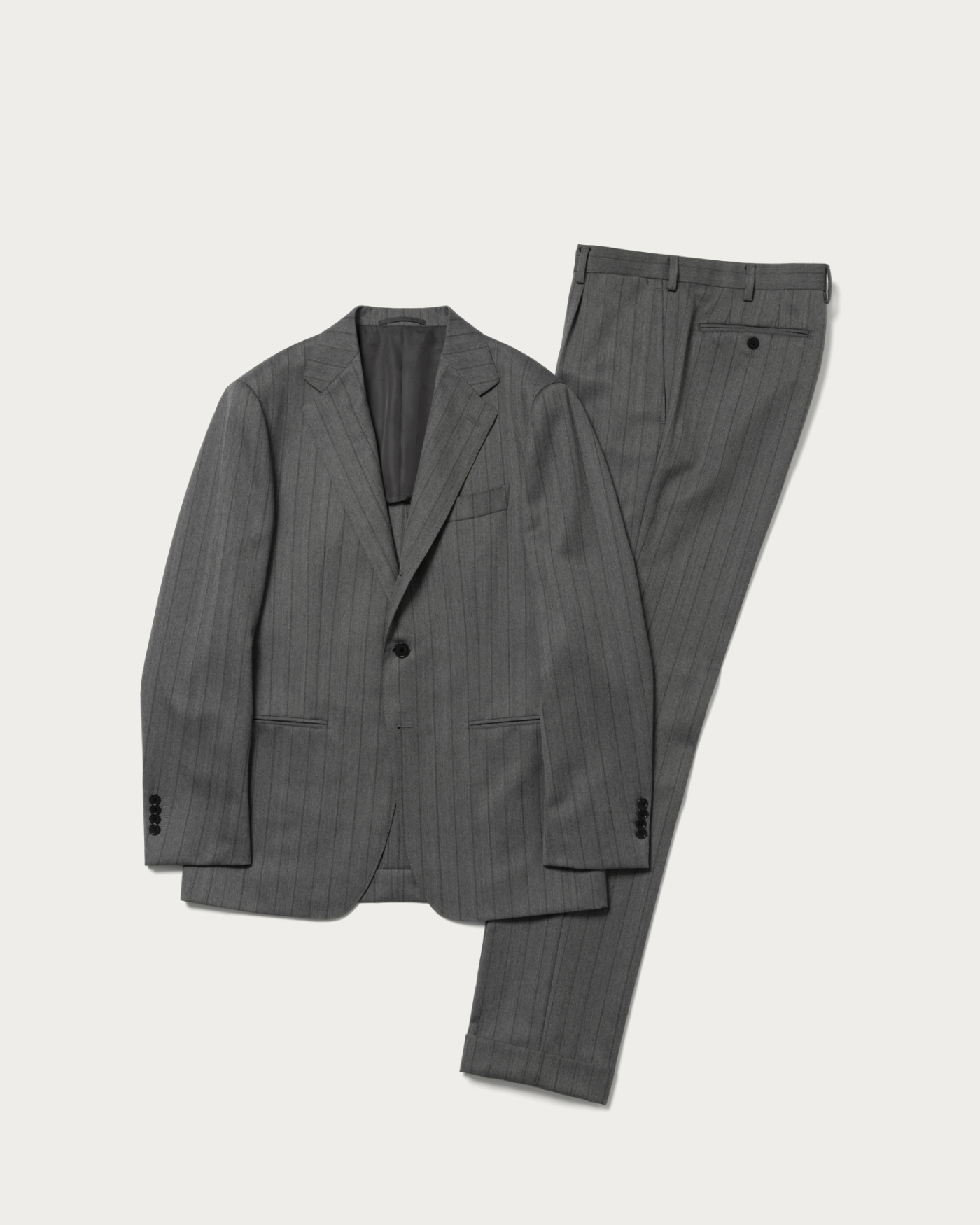 クラシックを現代的に再解釈したスーツ。奥行きのあるヘリンボーンストライプが、格調高くも柔らかな印象を与える一着です。ジャケットは広めの肩幅と長めの着丈、美しいウエストシェイプに加え、立体的な袖付け(マニカカミーチャ仕様)が特徴。構築的でありながら、軽やかな着心地を実現しています。ボトムスは深めの股上とゆとりのあるストレートラインで、ジャケットとのバランスを意識した設計。素材には「Vitale Barberis Canonico」社製のヘリンボーン生地を使用し、仕立て映えするハリとしなやかさを兼ね備えています。