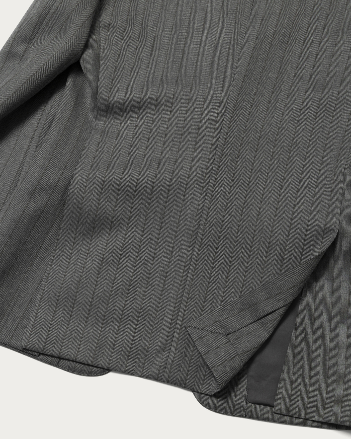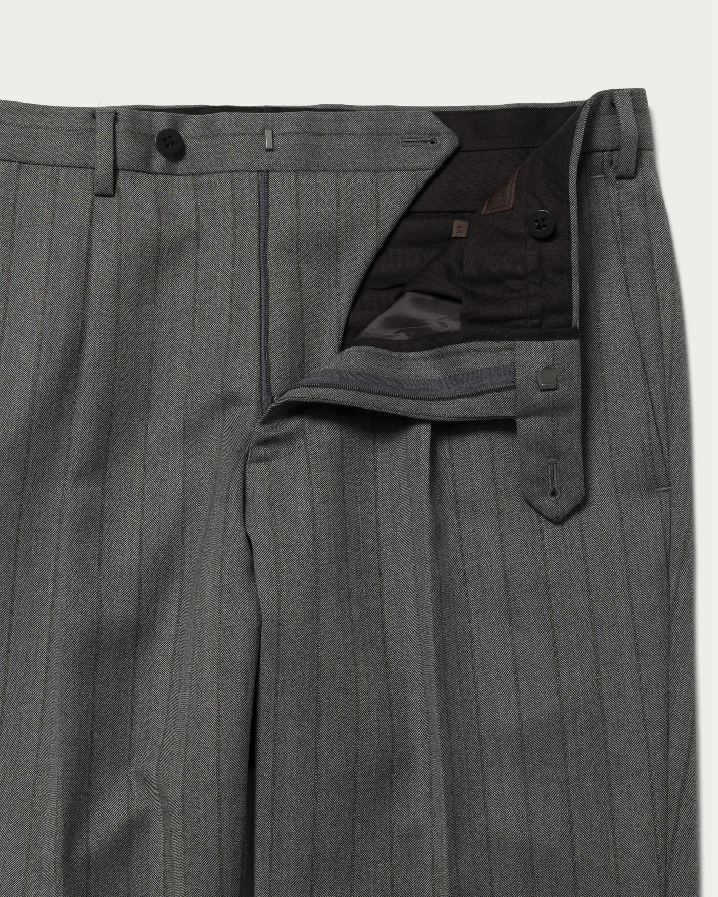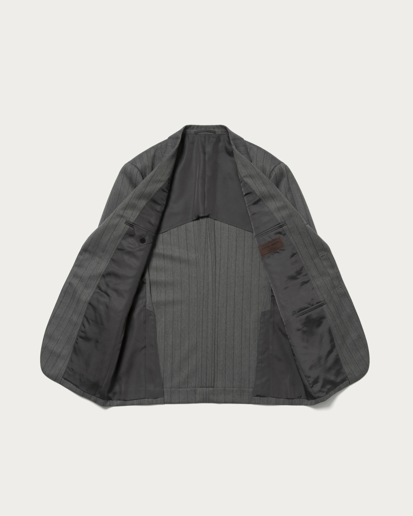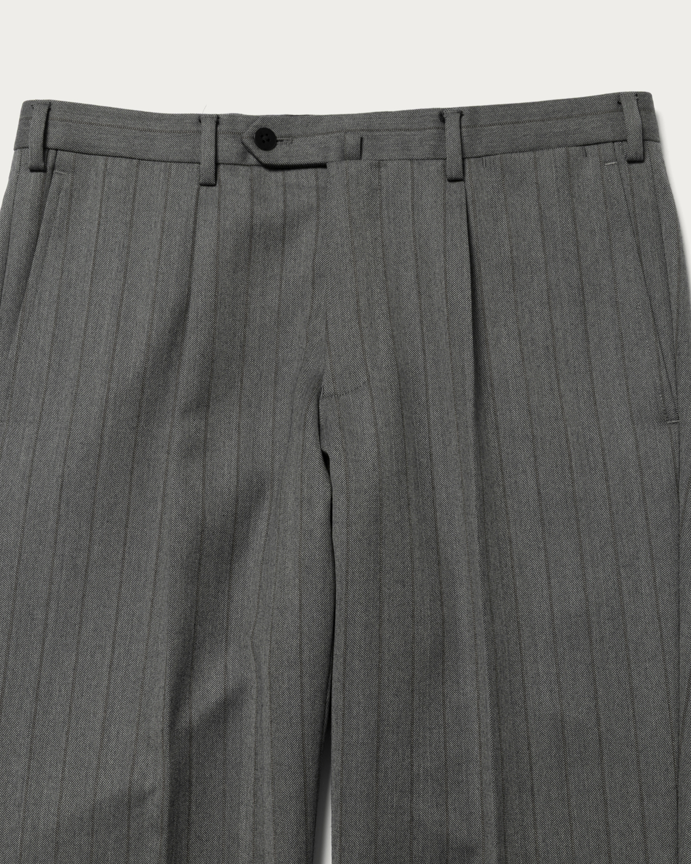 クラシックを現代的に再解釈したスーツ。奥行きのあるヘリンボーンストライプが、格調高くも柔らかな印象を与える一着です。ジャケットは広めの肩幅と長めの着丈、美しいウエストシェイプに加え、立体的な袖付け(マニカカミーチャ仕様)が特徴。構築的でありながら、軽やかな着心地を実現しています。ボトムスは深めの股上とゆとりのあるストレートラインで、ジャケットとのバランスを意識した設計。素材には「Vitale Barberis Canonico」社製のヘリンボーン生地を使用し、仕立て映えするハリとしなやかさを兼ね備えています。