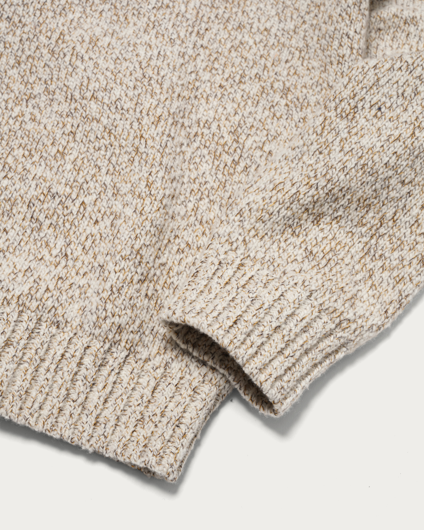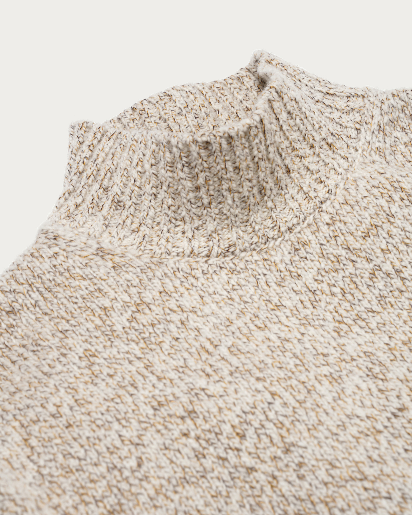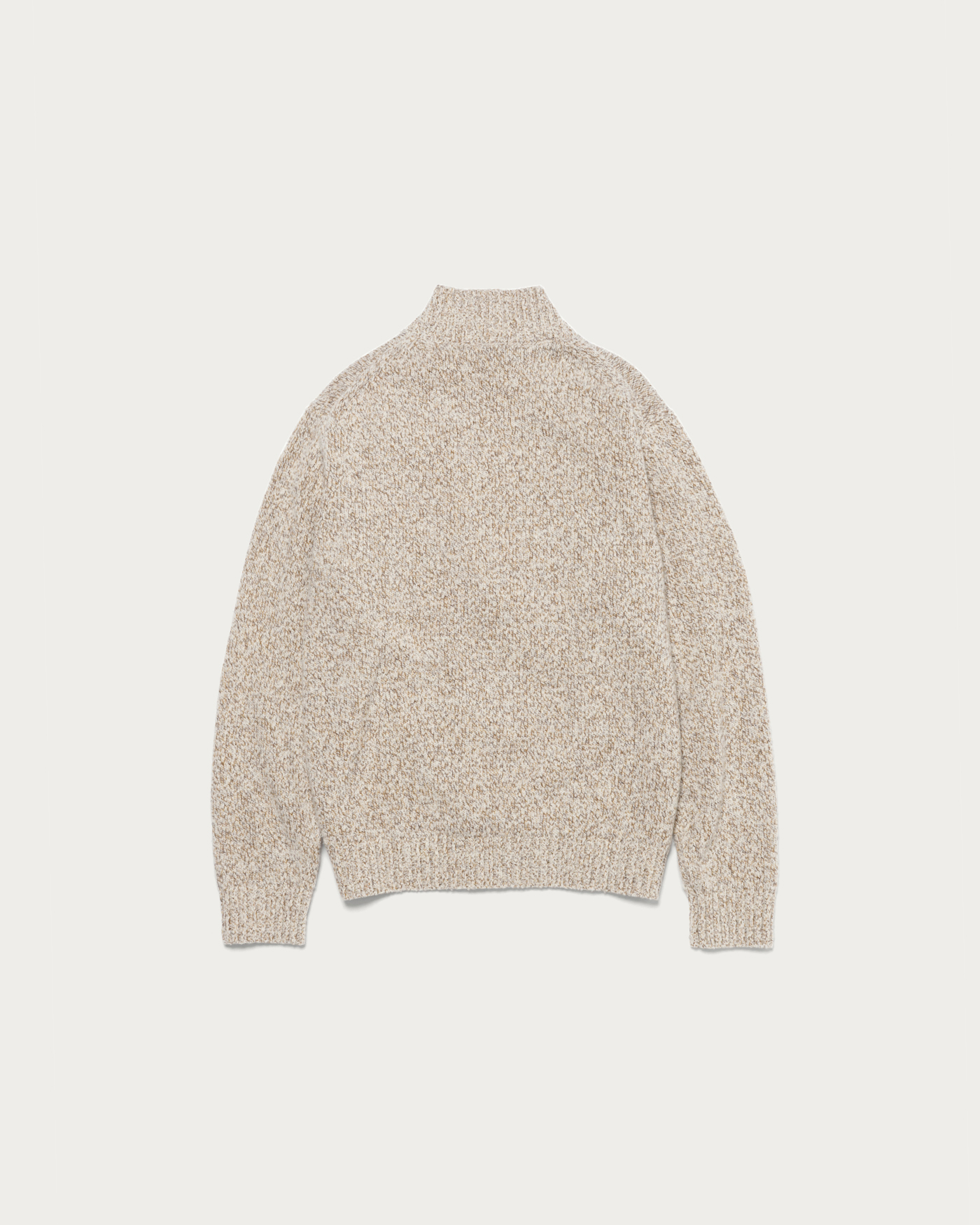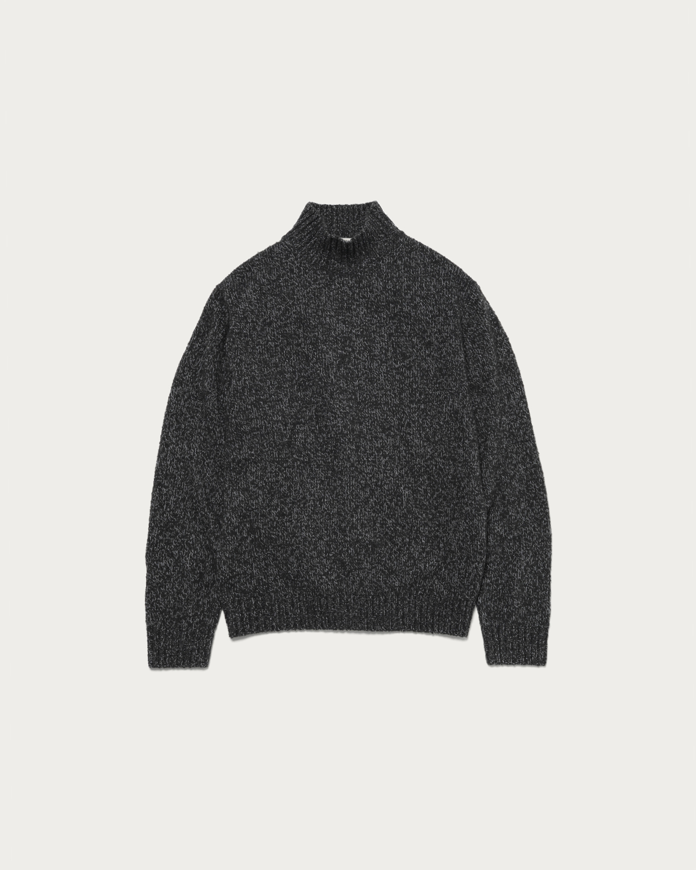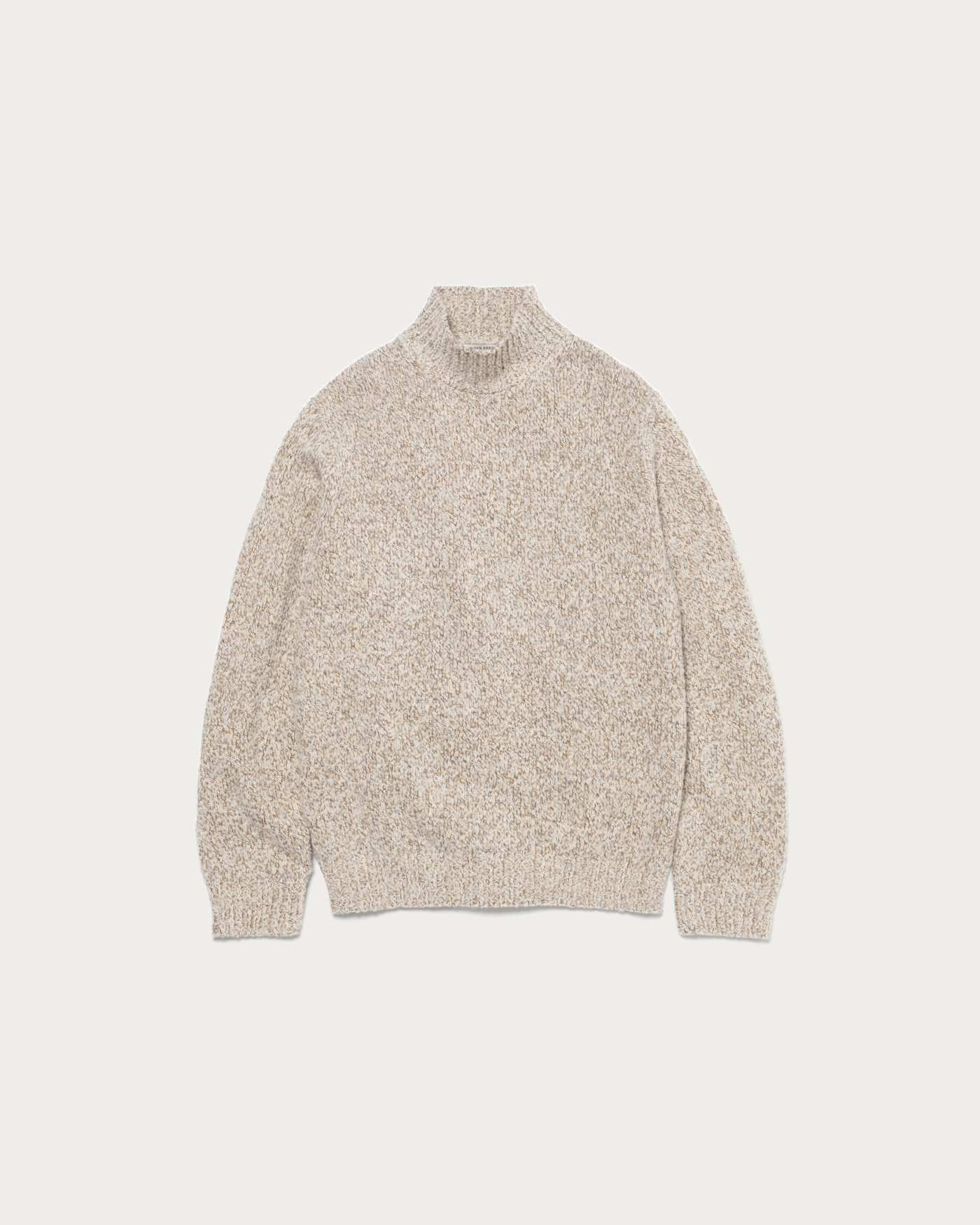 ローゲージならではの豊かな編地表情に、独特の色出しをプラスしたセーター。折り返さないオフタートルが抜け感を演出します。素材は、意匠性ある糸づくりで知られるイタリア〈MILLEFILI〉社の杢糸を使用。異なる色糸を掛け合わせることで奥行きのある色合いに仕上げ、モダンで洗練された印象を生み出しています。