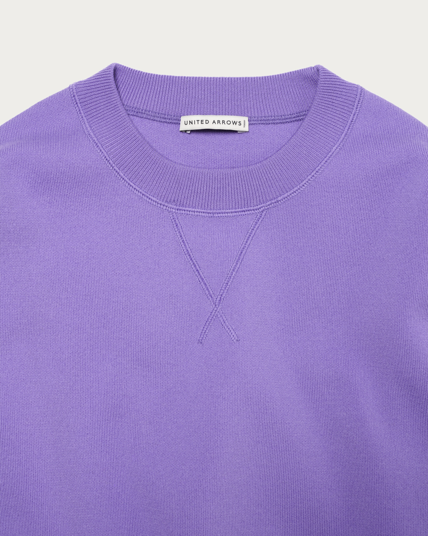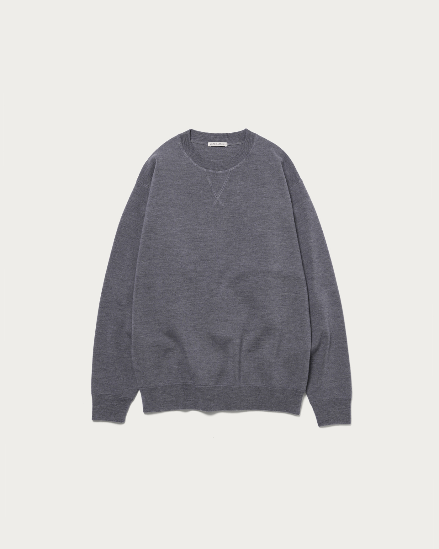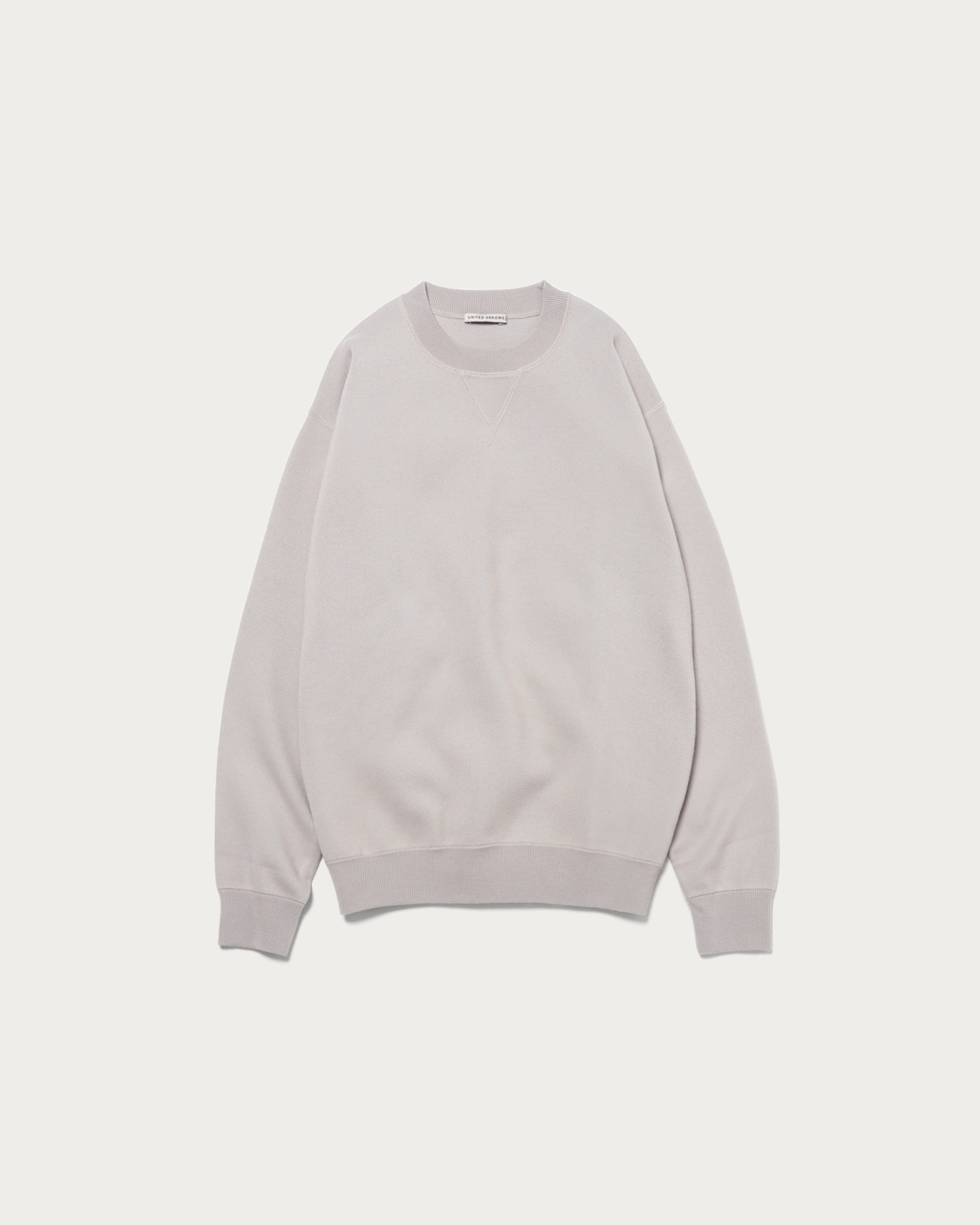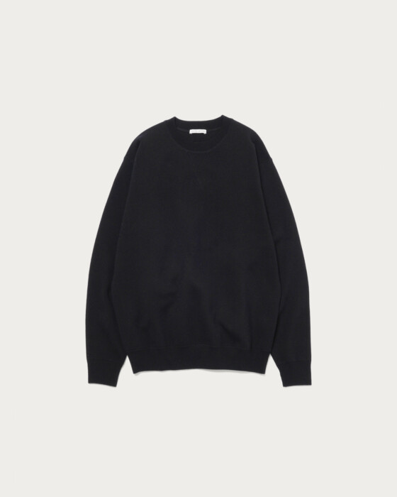 カシミヤをブレンドした糸で編み立てた、上品なスウェットシャツ。ニットで成形したパーツをカットソーのミシンで縫製することで、カジュアルな軽やかさとニットならではの上質さを兼ね備えた一枚に仕上げています。編地はスムース組織で、安心感のあるしっかりとしたウエイトに設定。さらに、ポリエステル糸をプレーティングすることで、適度なハリと反発感をプラスしました。そのため、着用時のフォルムが美しく立ち上がり、シンプルながらも存在感のある佇まいを生み出します。