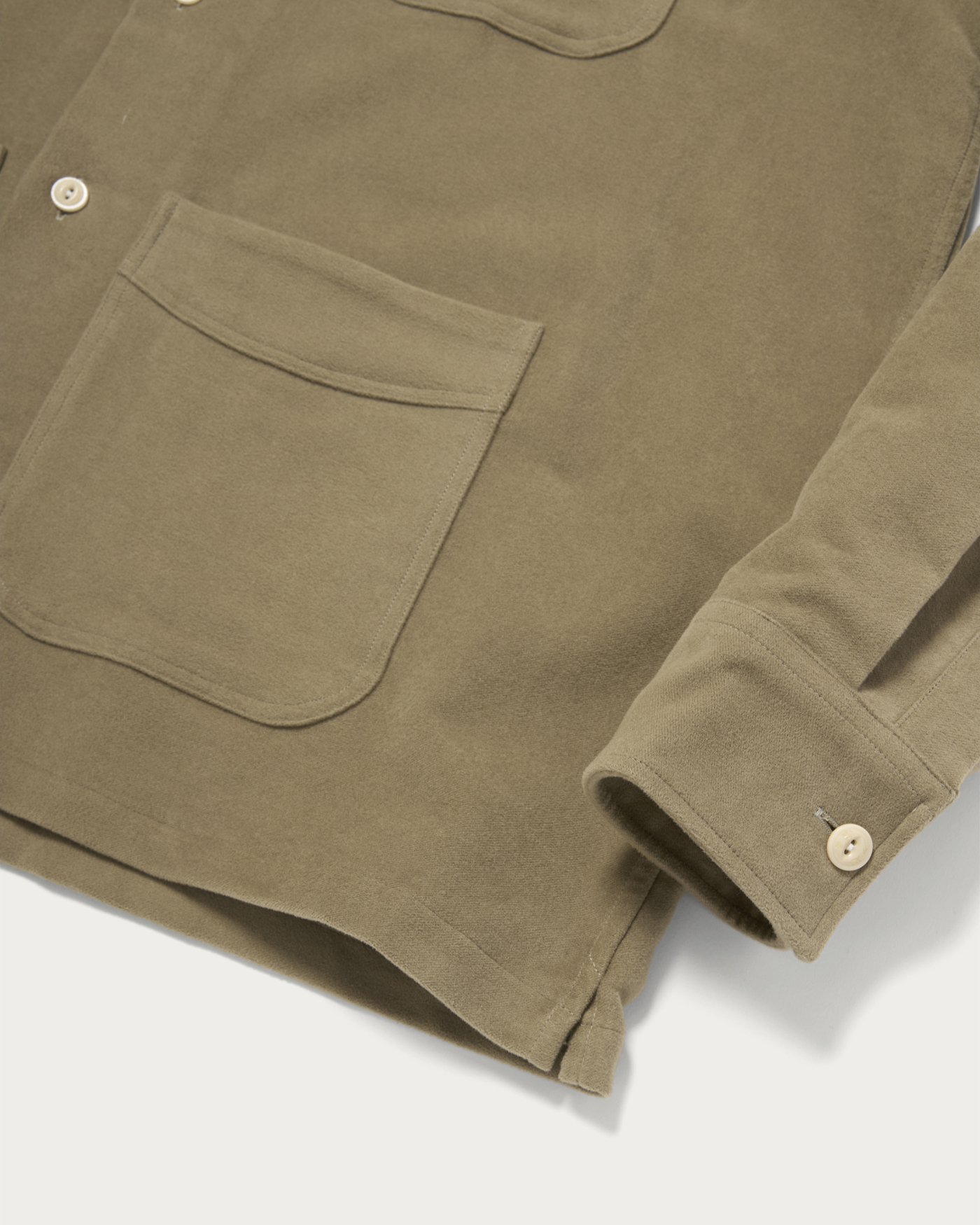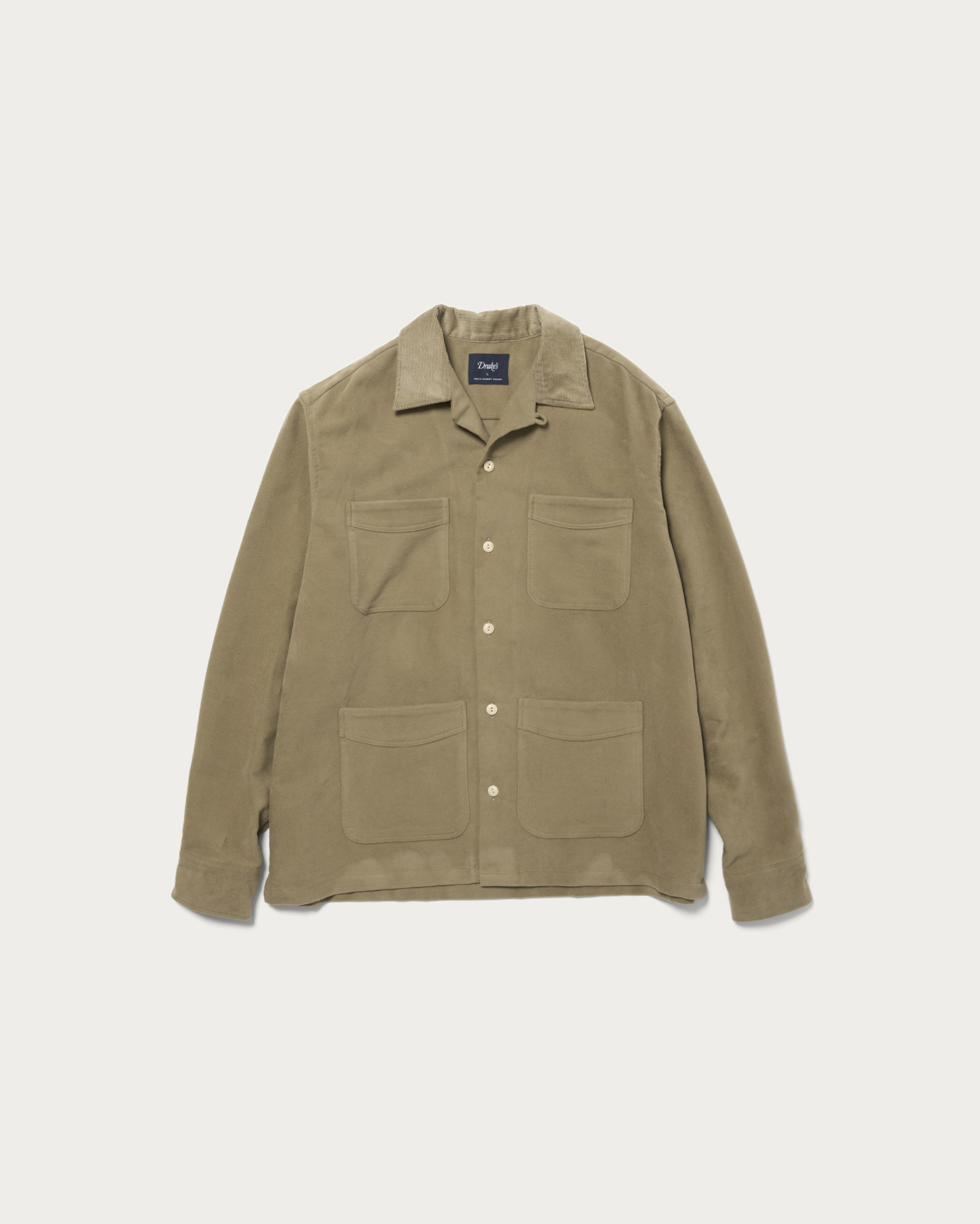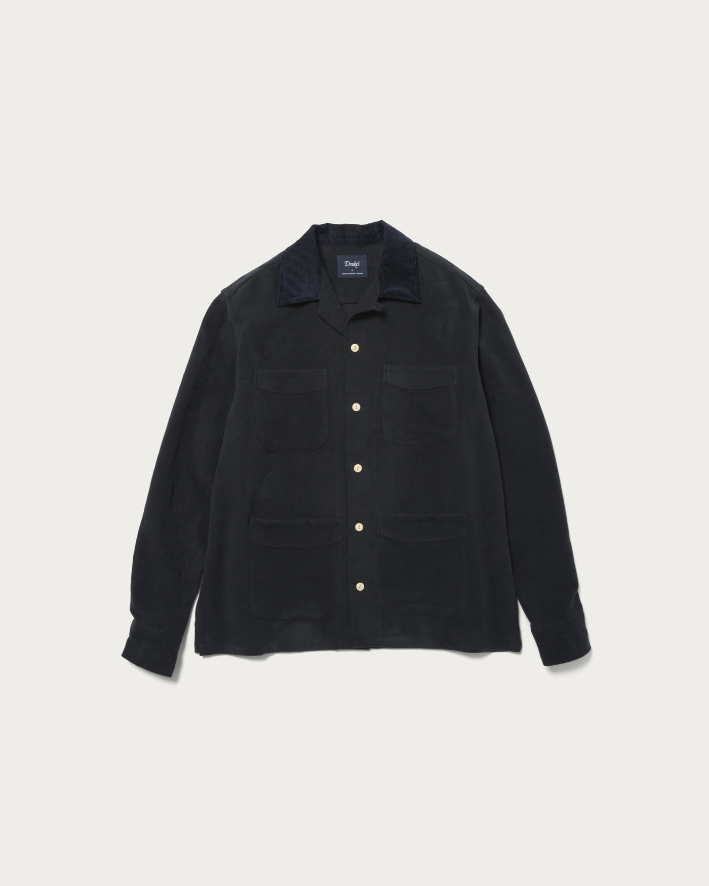 自社工場のある英国サマセット地方で仕立てられたモールスキンのワークジャケットは、適度にゆとりのあるシルエットで、カジュアルからスラックススタイルまで幅広く活躍します。同色のコーデュロイ襟を採用することで、着やすさと雰囲気を両立。英国らしい上品さとワークウェアの無骨さを兼ね備えた、特別な別注モデルです。