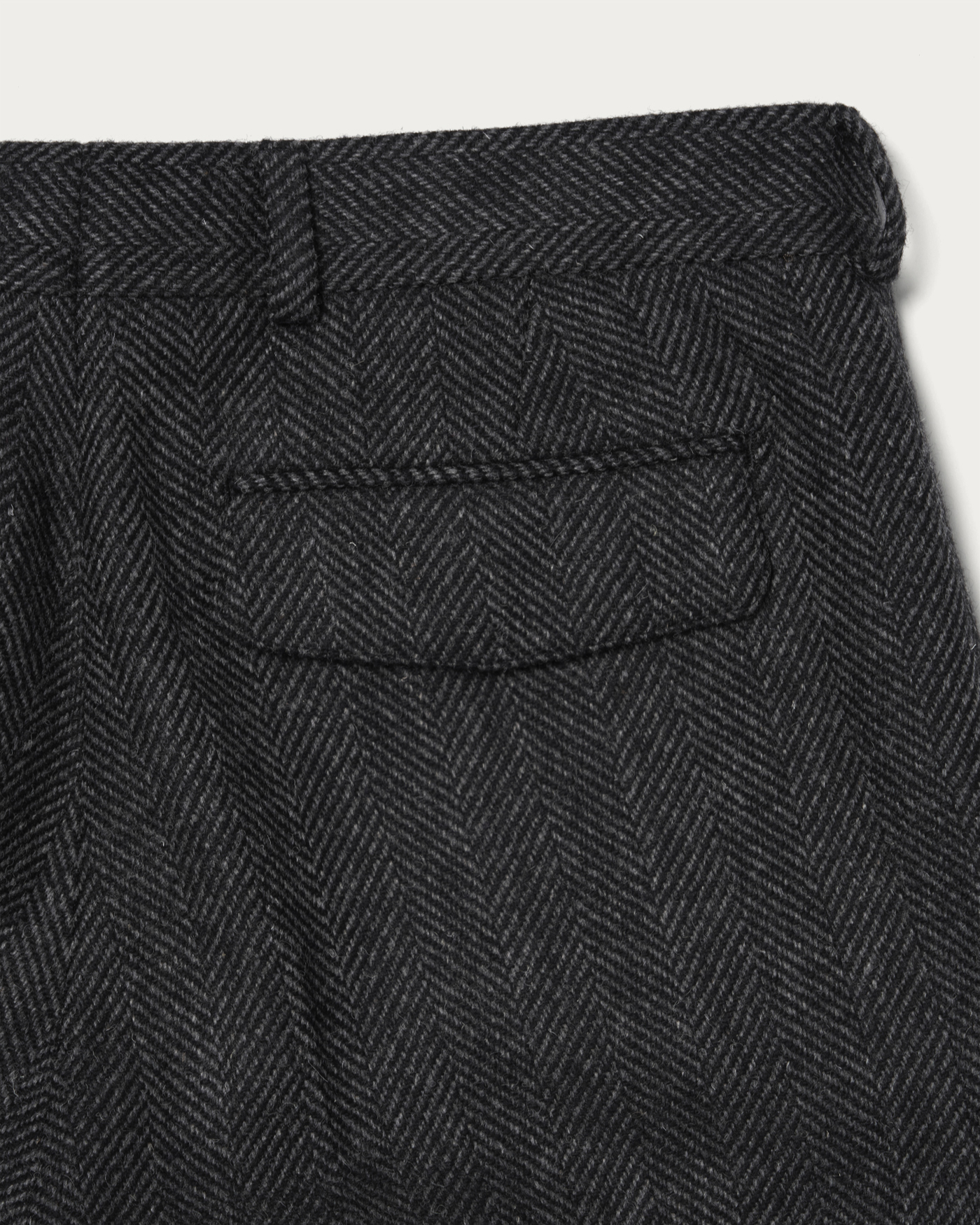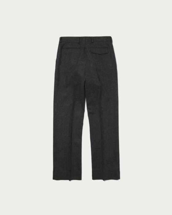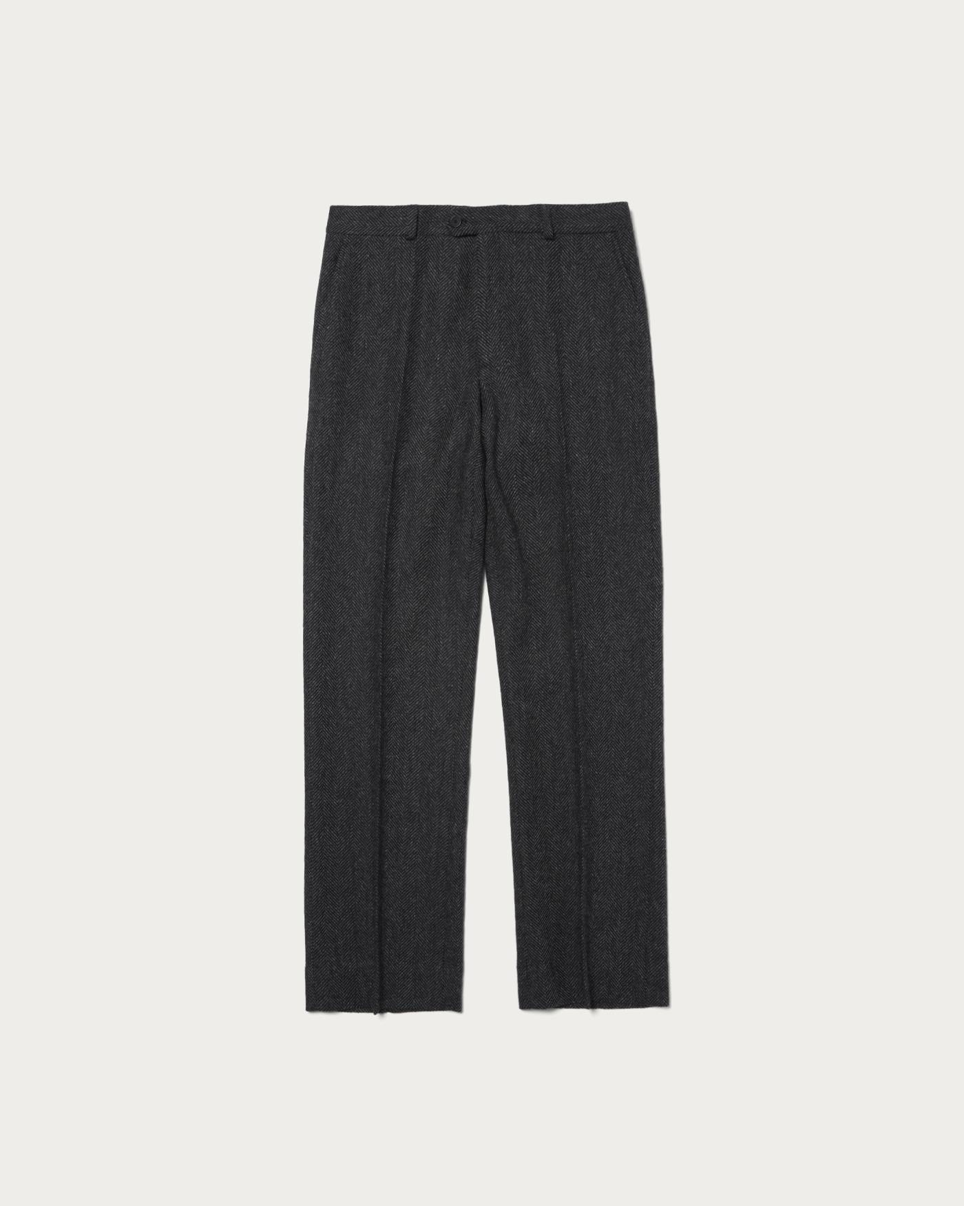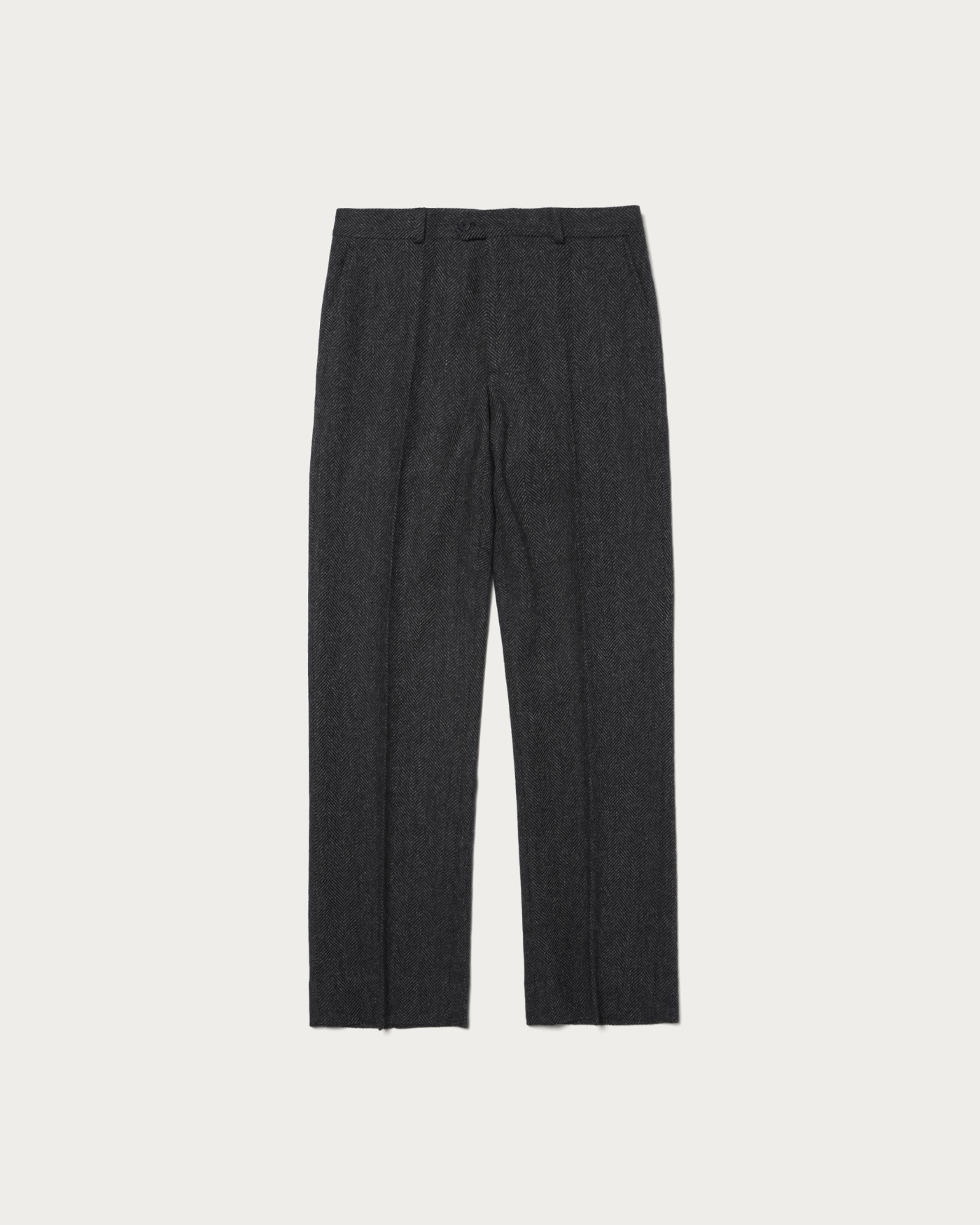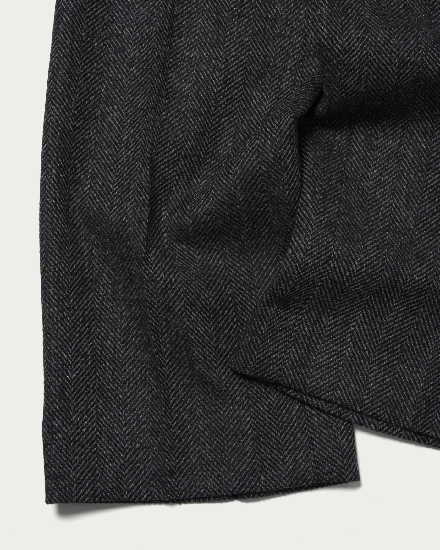 フランスのパンツ専業ブランド〈BERNARD ZINS〉。モデル「MABILLON」は、股上をやや浅めに設定し、腰回りをすっきりと仕上げたノータック仕様のワイドストレートシルエット。構築的なパターンと美しい落ち感が生み出す洗練されたラインが特徴です。ヘリンボーン柄の生地がさりげない表情を添え、上品さとクラシックさを併せ持つ一本に仕上がっています。