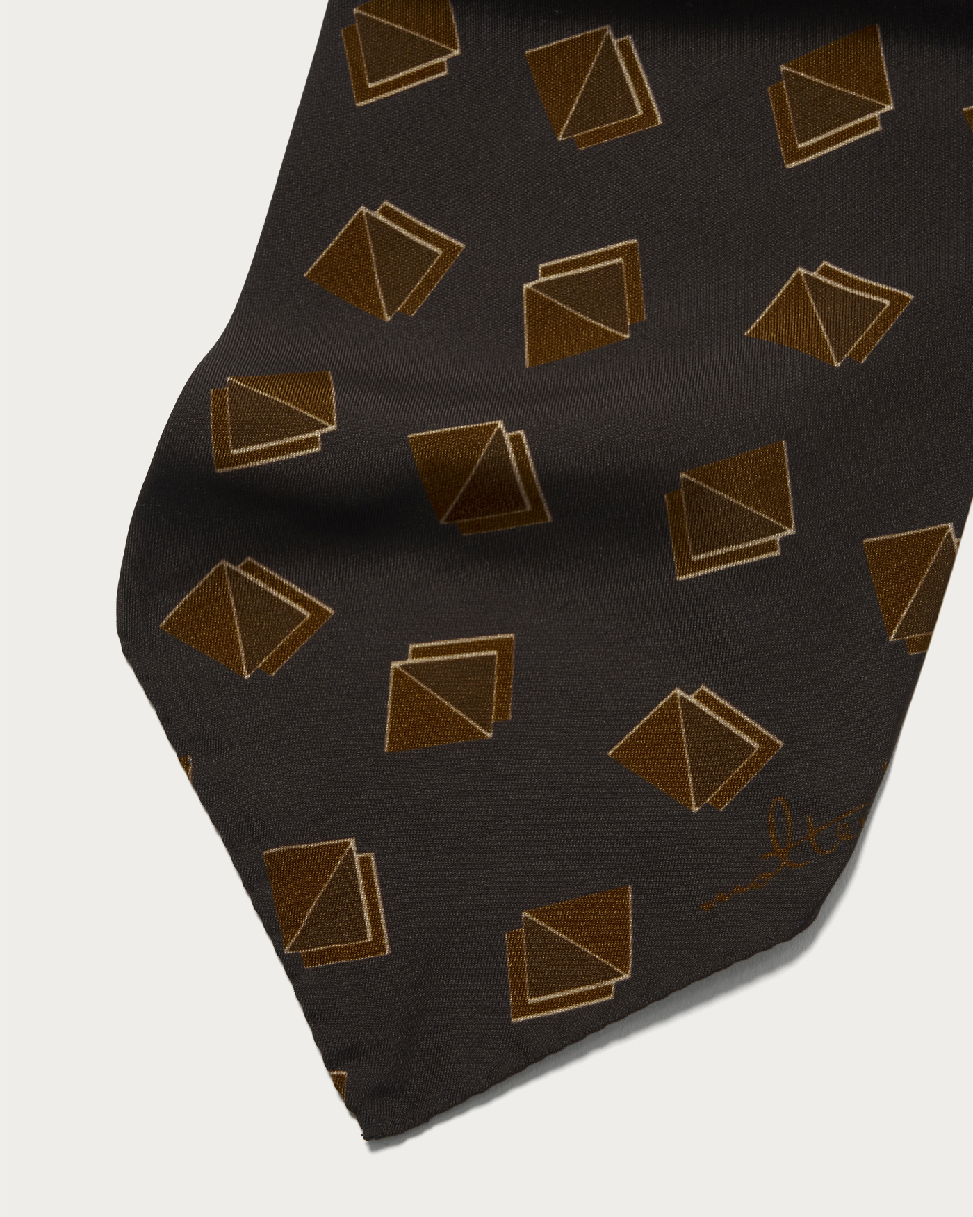〈MOLTENI〉のアスコットタイ。イタリアらしい繊細な色使いと滑らかな質感が魅力の一本です。ジオメトリック柄を配したデザインは、クラシックでありながらモダンな印象を与え、首元に程よい華やかさと個性を添えます。