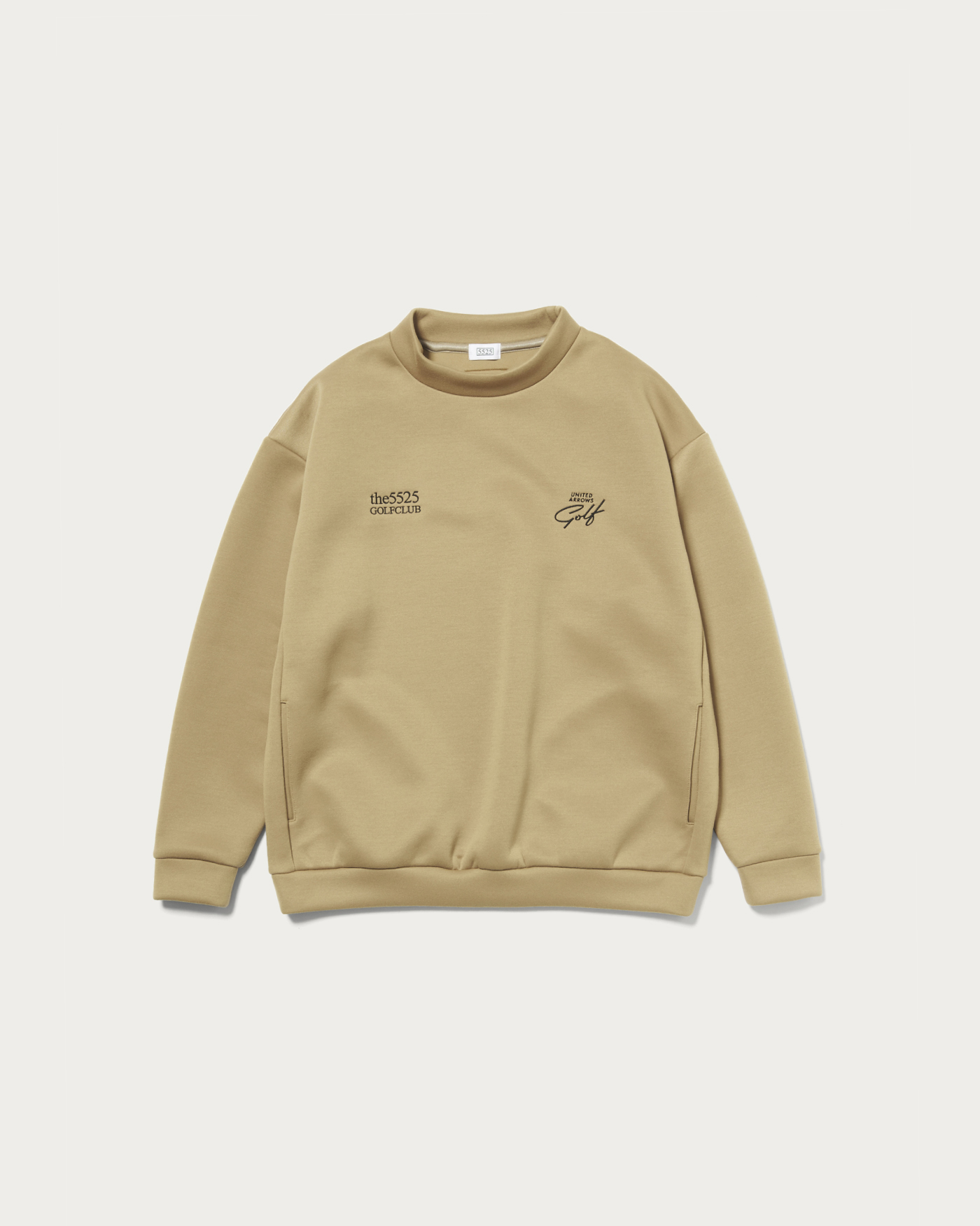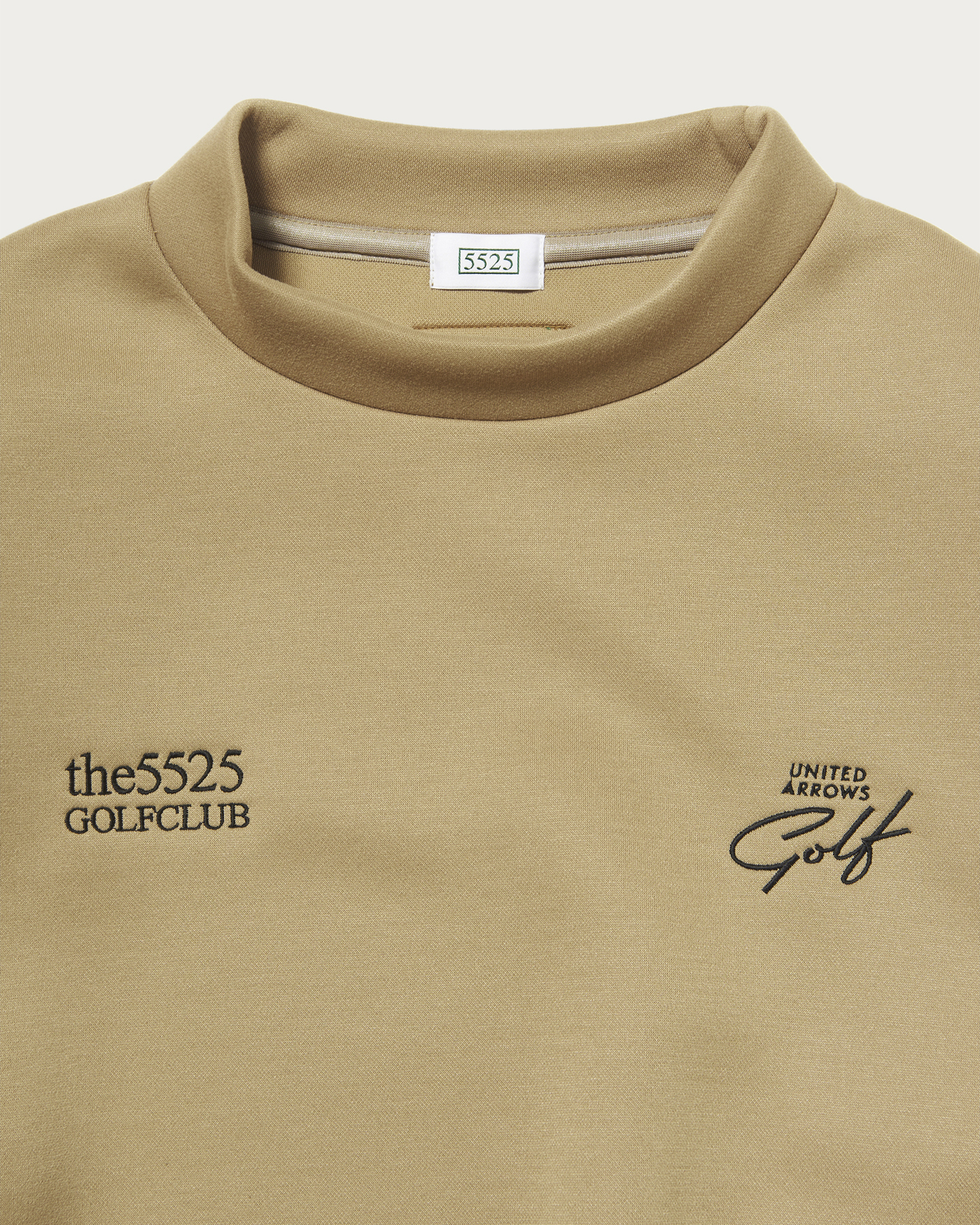〈5525〉のインラインモデルをベースに素材、カラー、シルエットを別注仕様に変更したハイネックプルオーバーミドラー。フロント胸部分には両ブランドロゴを配置。背面上部の〈5525〉を象徴するグリーンカラーのシリコンマークを〈ユナイテッドアローズ ゴルフ〉のロゴデザインにカスタマイズしています。