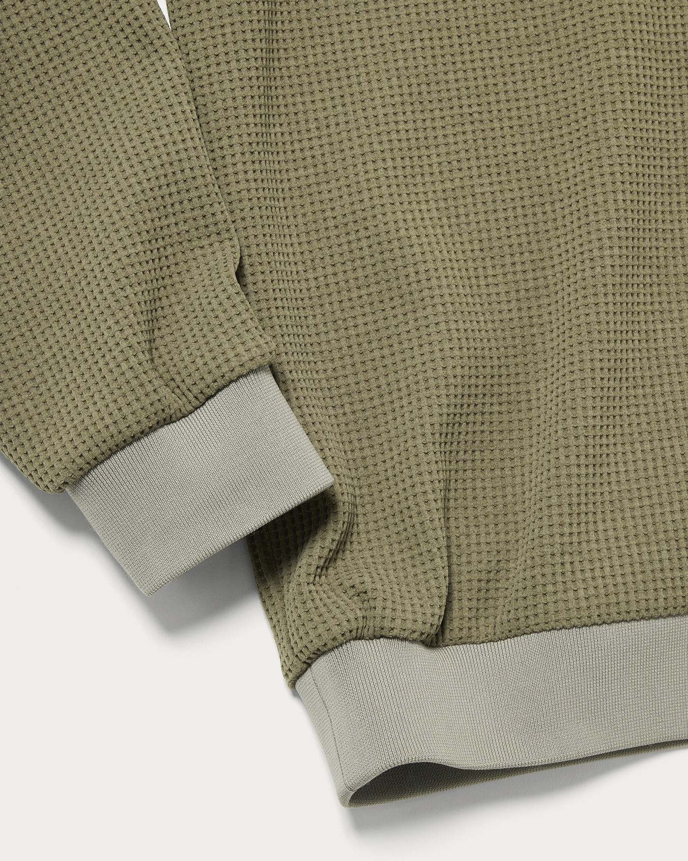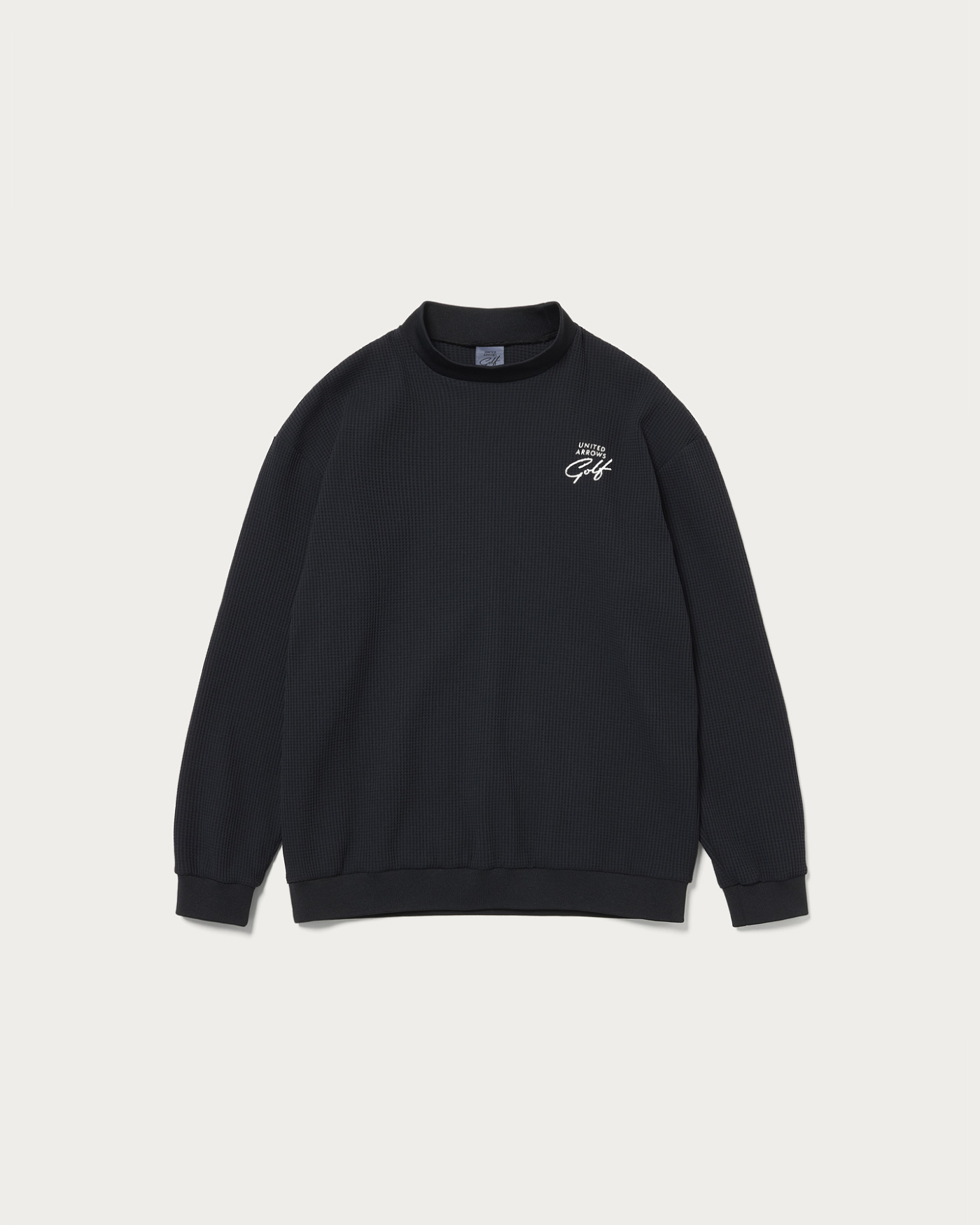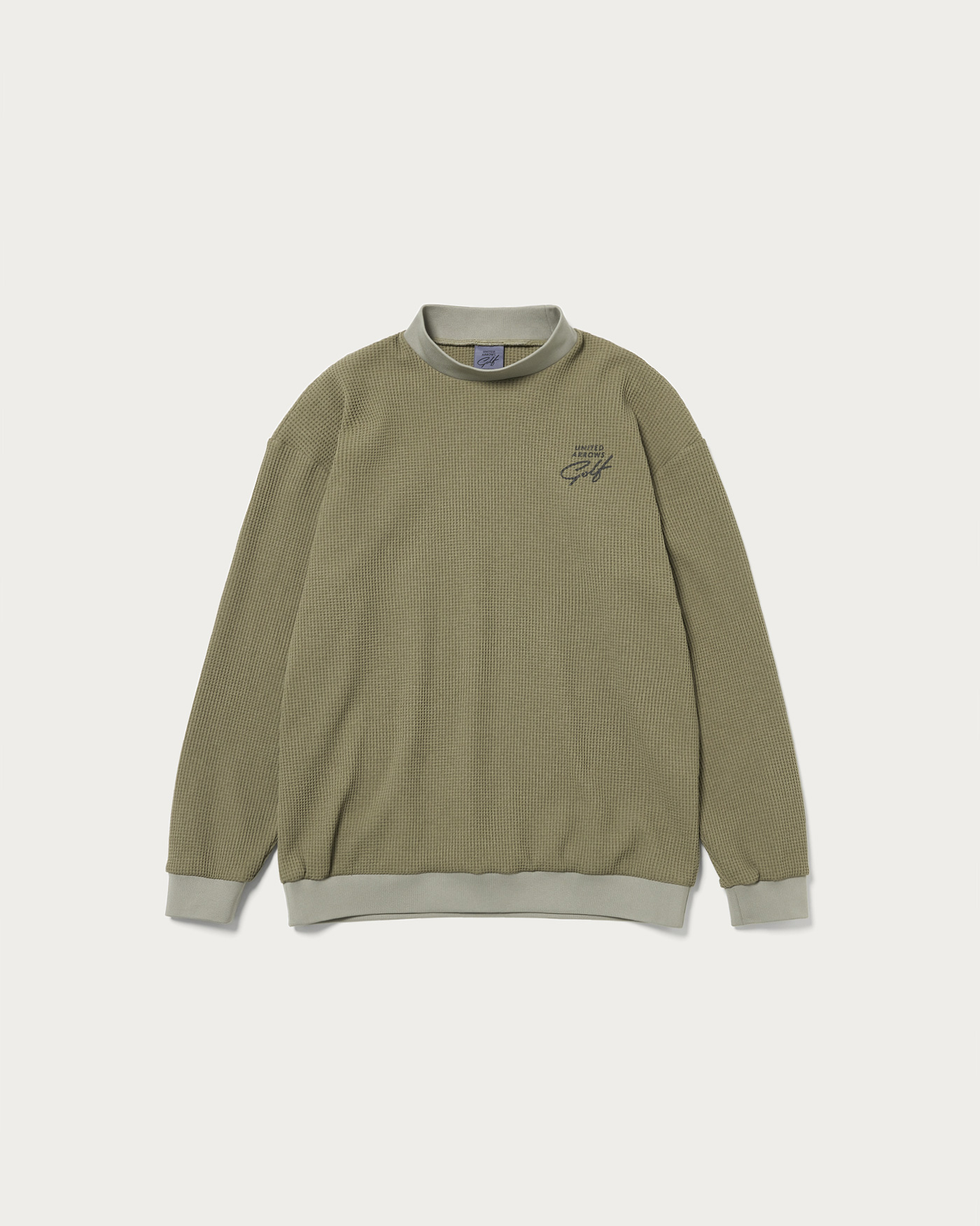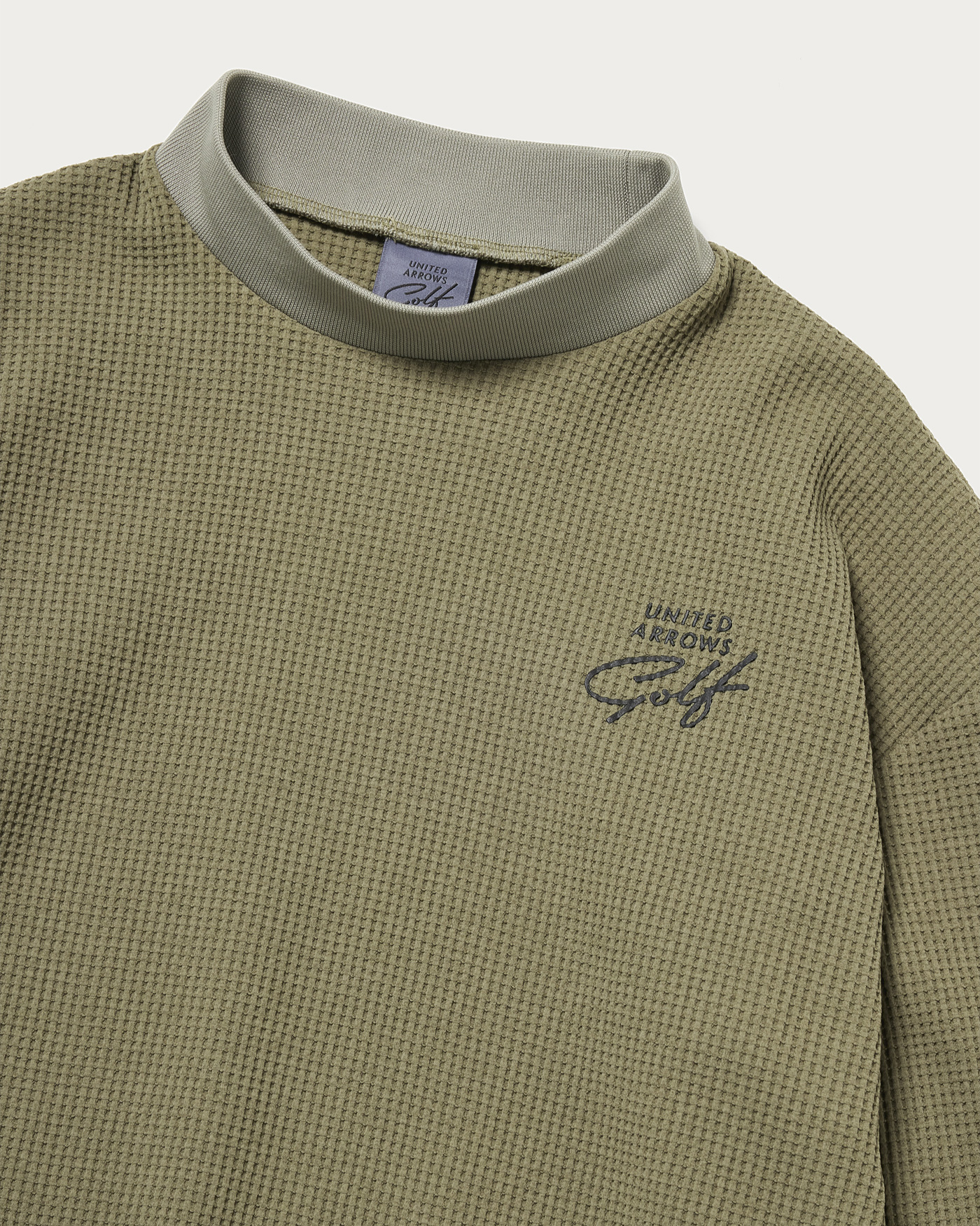 凹凸感のあるワッフル素材を使用したモックネックシャツ。シンプルながらも存在感があり一枚着としてもレイヤードアイテムとしても多彩な着こなしが可能です。