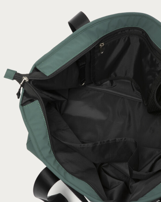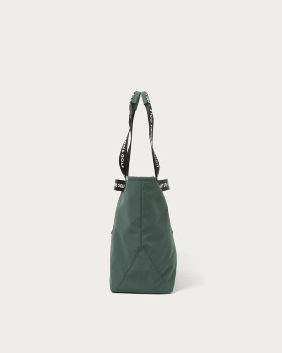 ハンドル部分にロゴを配したデザインが特徴的なトートバッグ。内装には、オープンポケットやファスナーポケット、キーストラップなどを備えたシンプルな作りが特徴です。