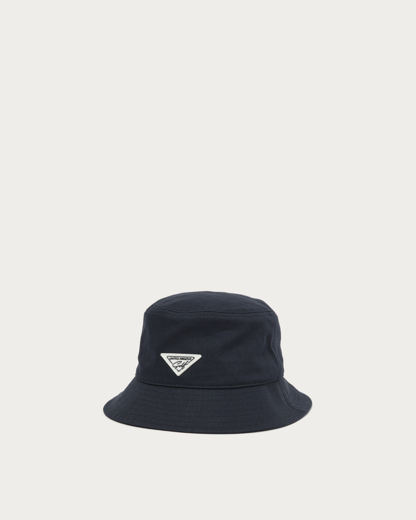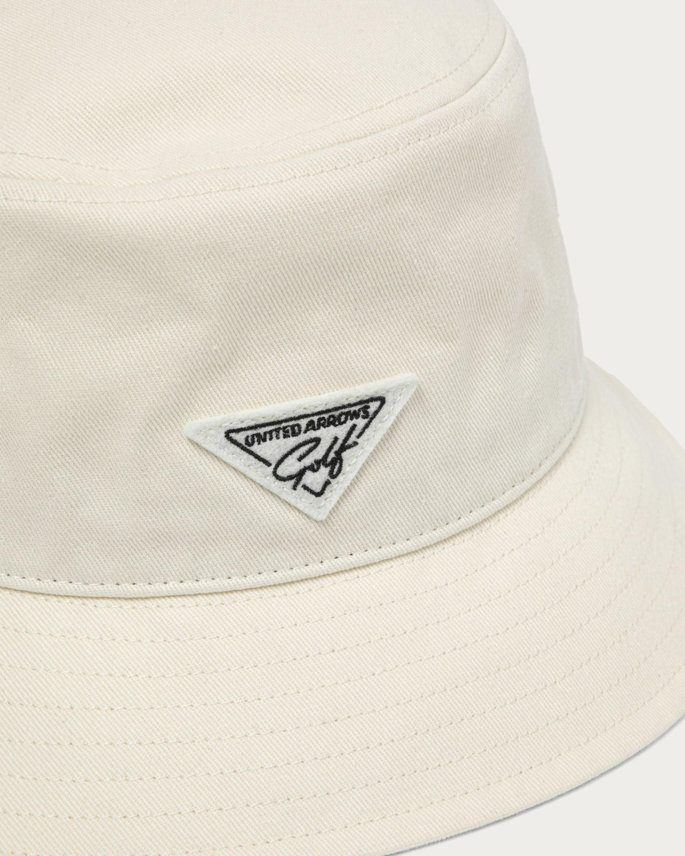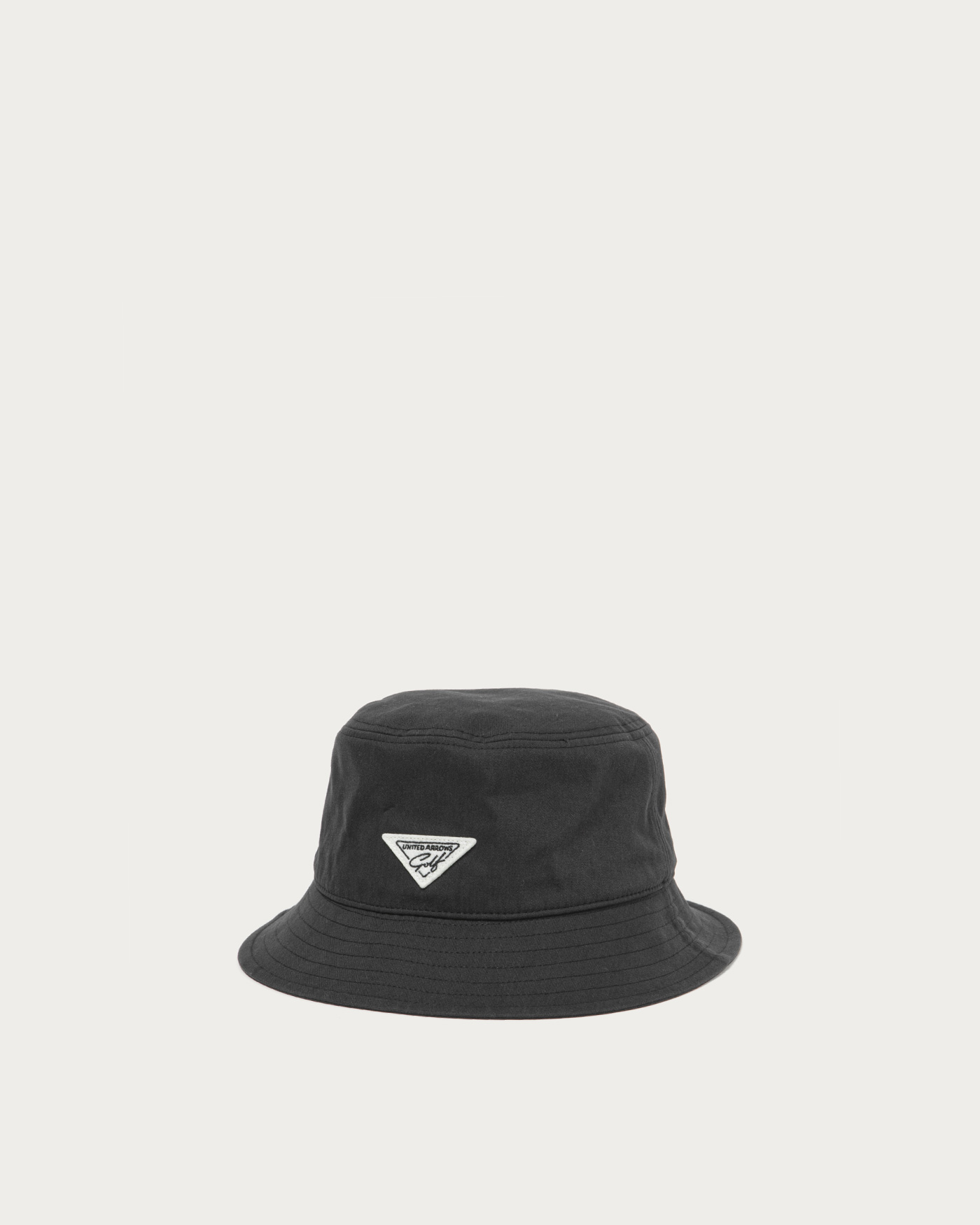 フェード感のあるコットンナイロン素材を使用したバケットハット。フロントに三角のロゴワッペンを配しています。バックのスピンドルでサイズ調整が可能です。