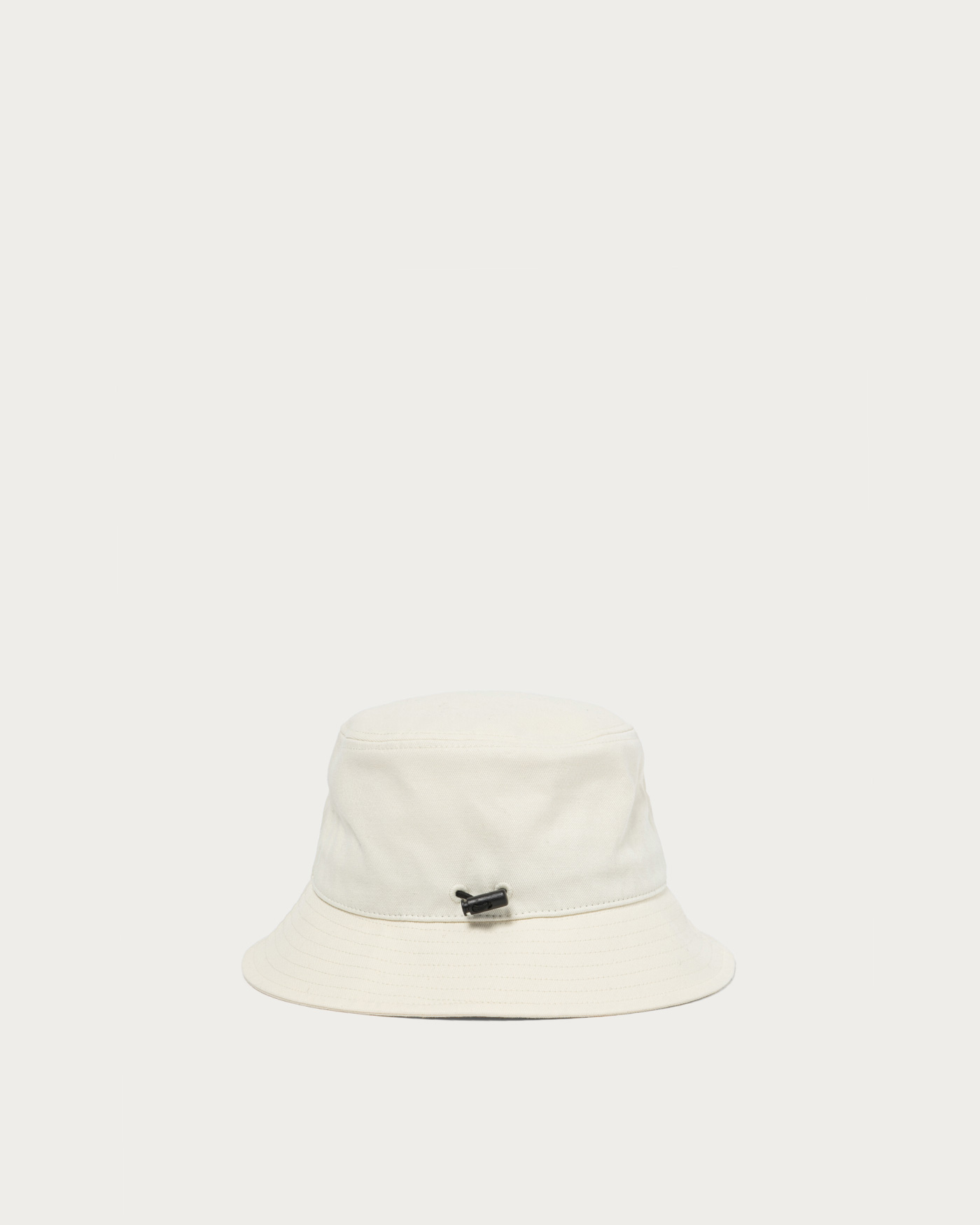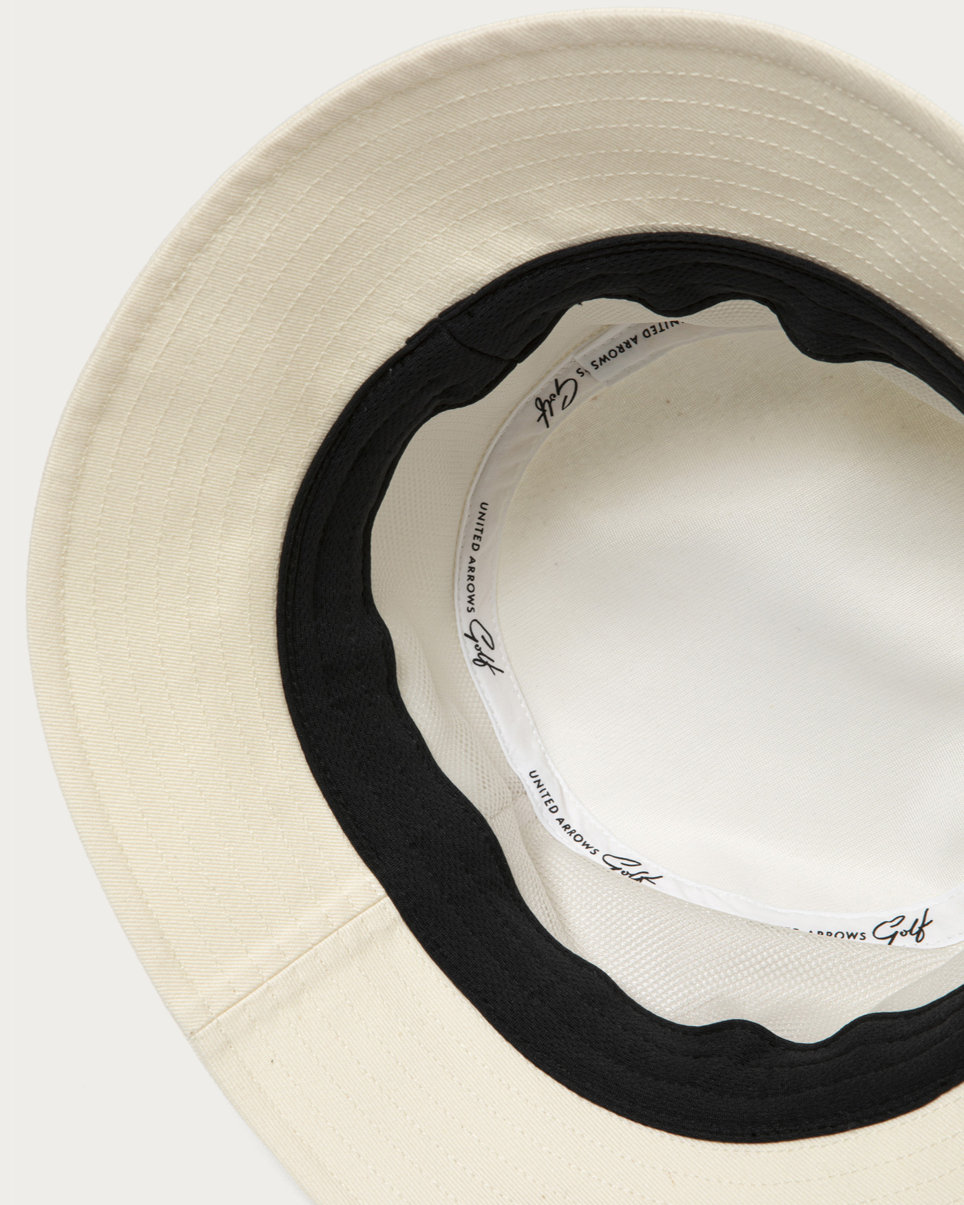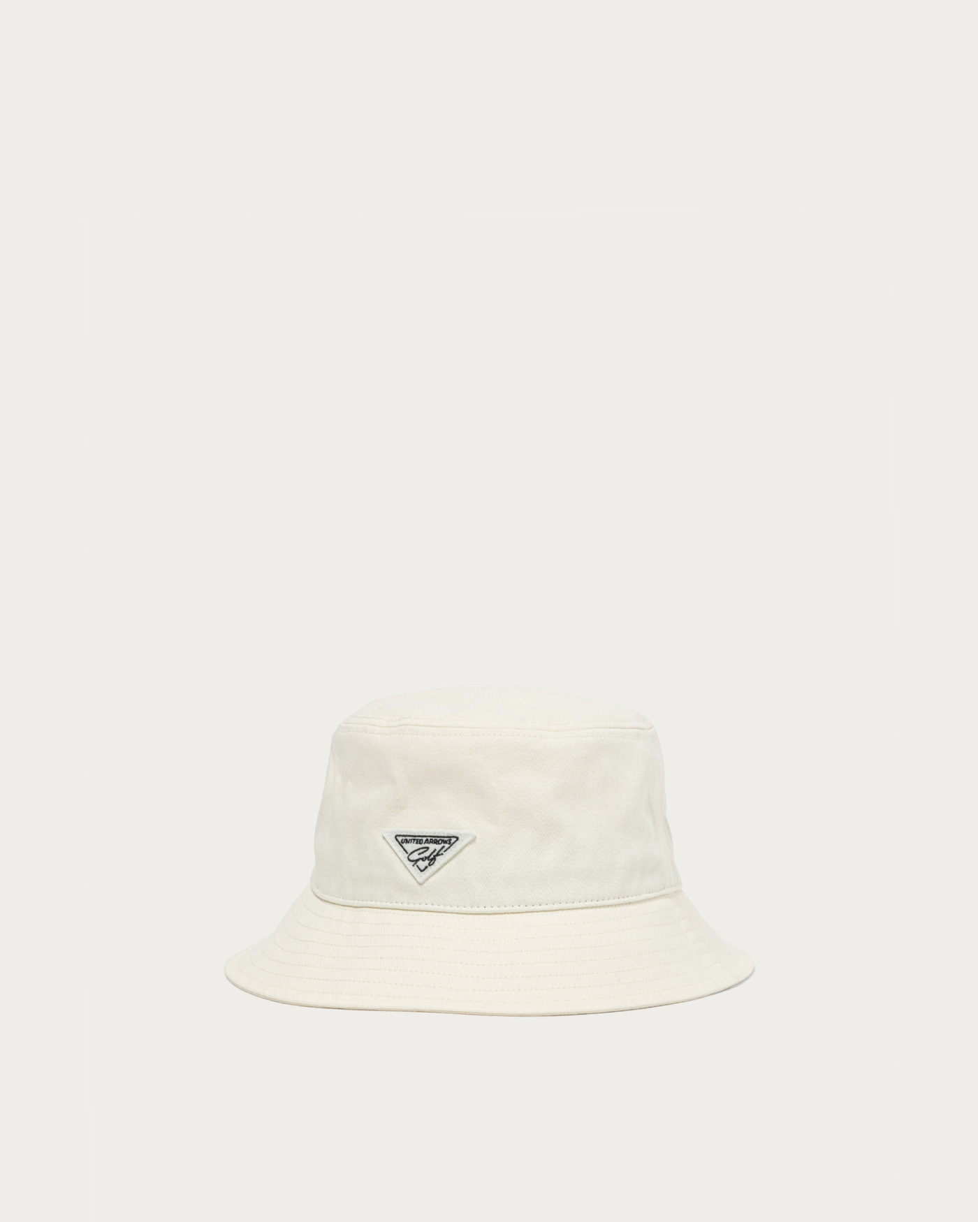 フェード感のあるコットンナイロン素材を使用したバケットハット。フロントに三角のロゴワッペンを配しています。バックのスピンドルでサイズ調整が可能です。