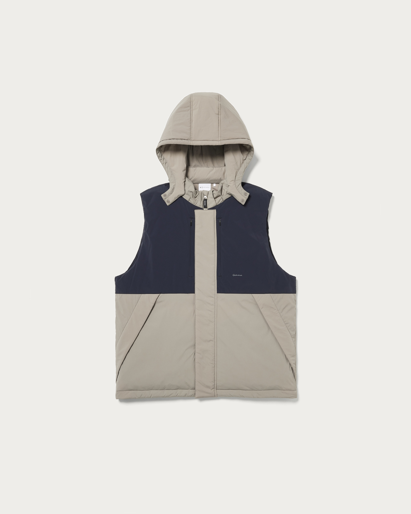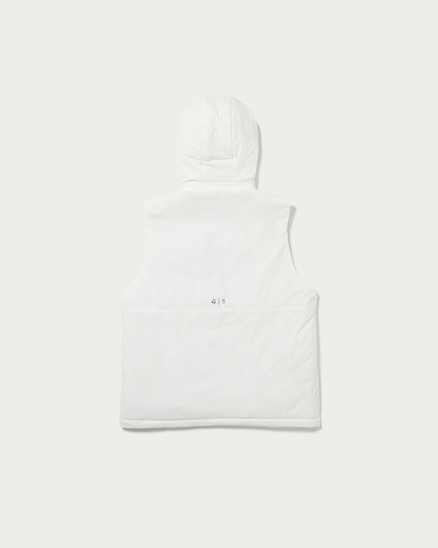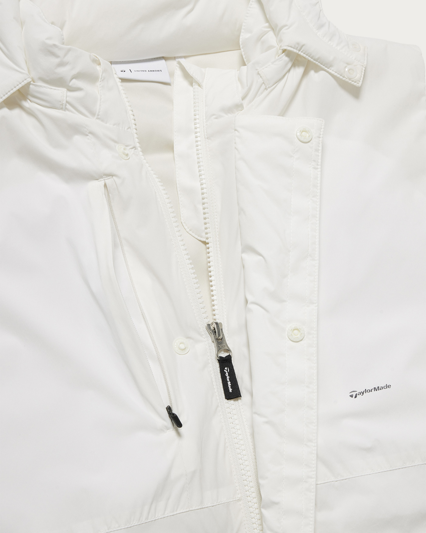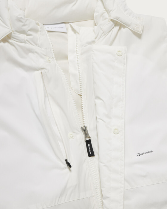 ゆとりのあるシルエットが特徴的な中綿入りベスト。フードは取り外し可能で、左胸と背中部分にシンプルにロゴを配しています。裾のドローコードでシルエットの変化を楽しめます。テーラーメイドとユナイテッドアローズによるコラボコレクションです。
