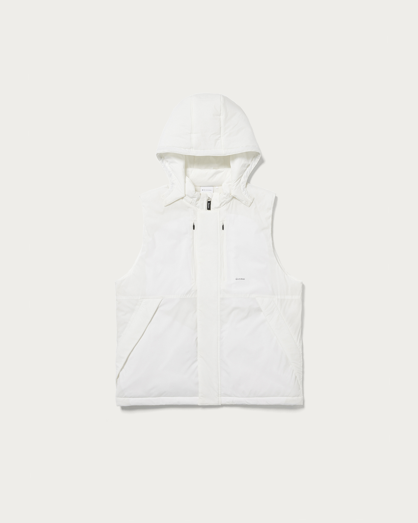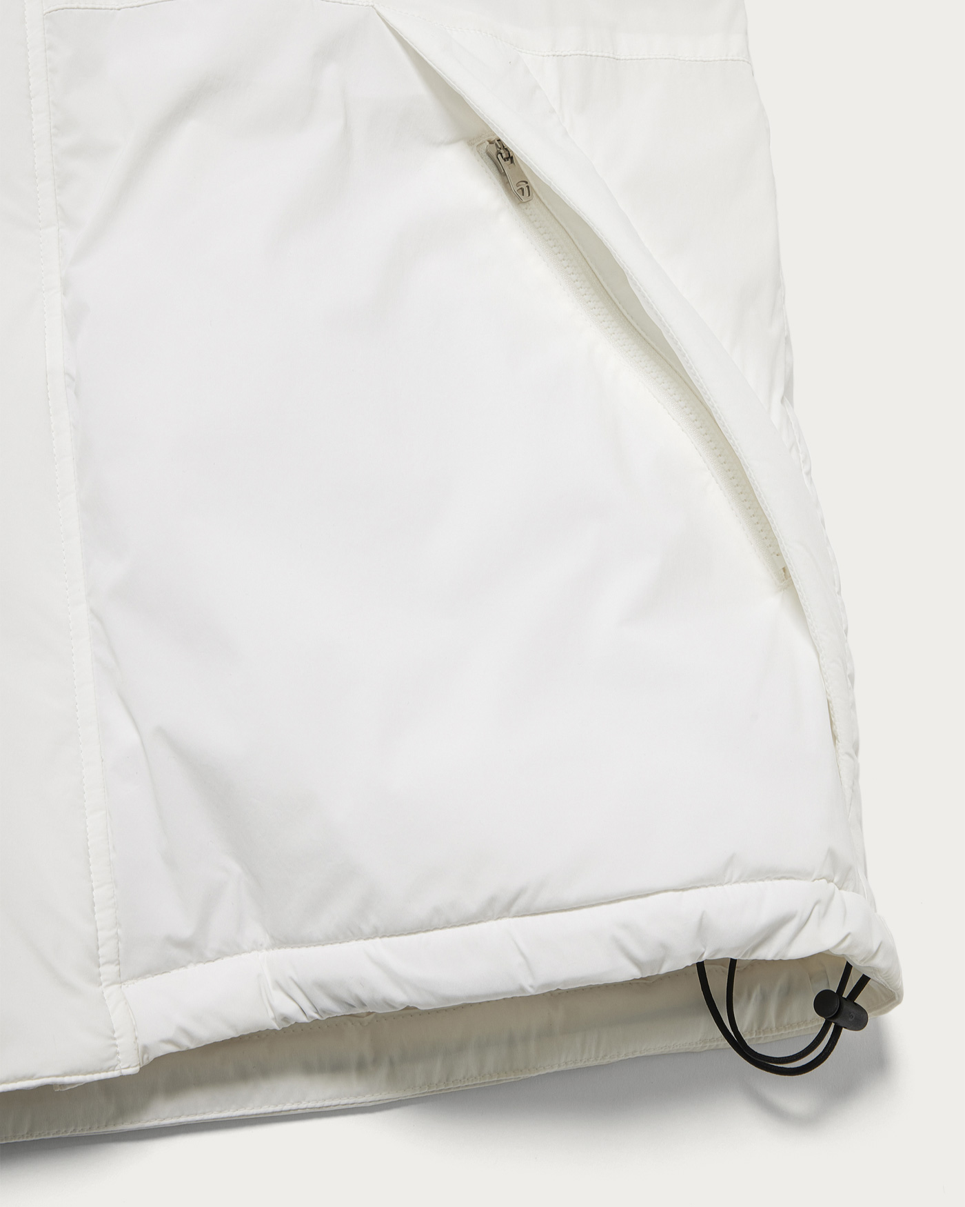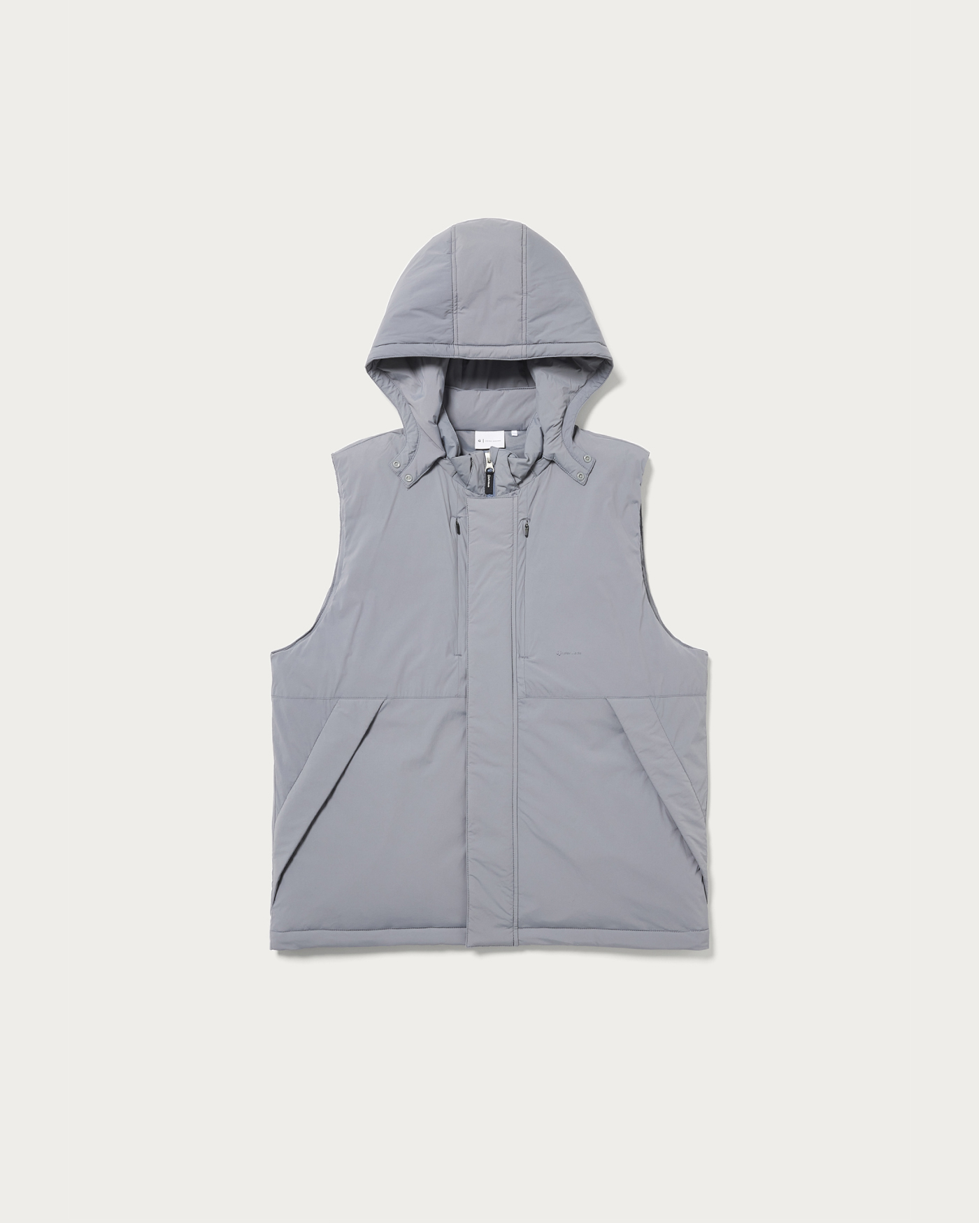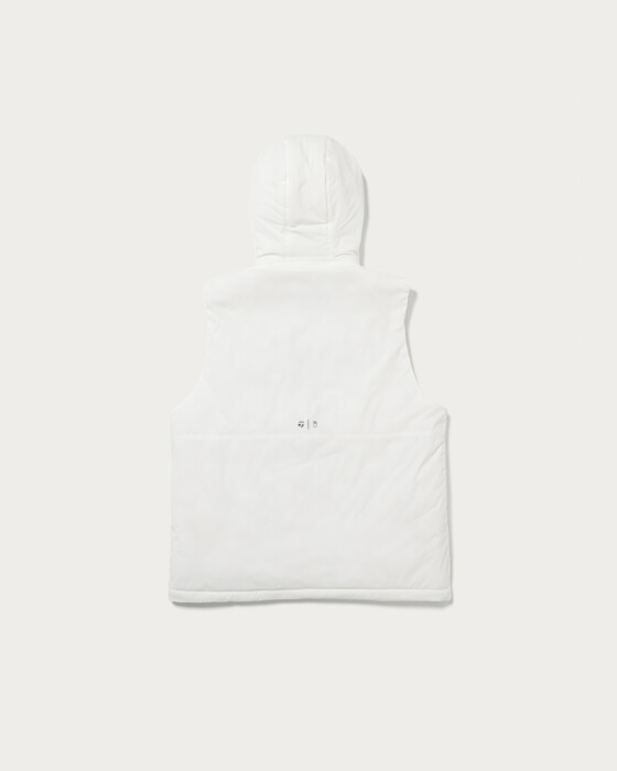 ゆとりのあるシルエットが特徴的な中綿入りベスト。フードは取り外し可能で、左胸と背中部分にシンプルにロゴを配しています。裾のドローコードでシルエットの変化を楽しめます。テーラーメイドとユナイテッドアローズによるコラボコレクションです。