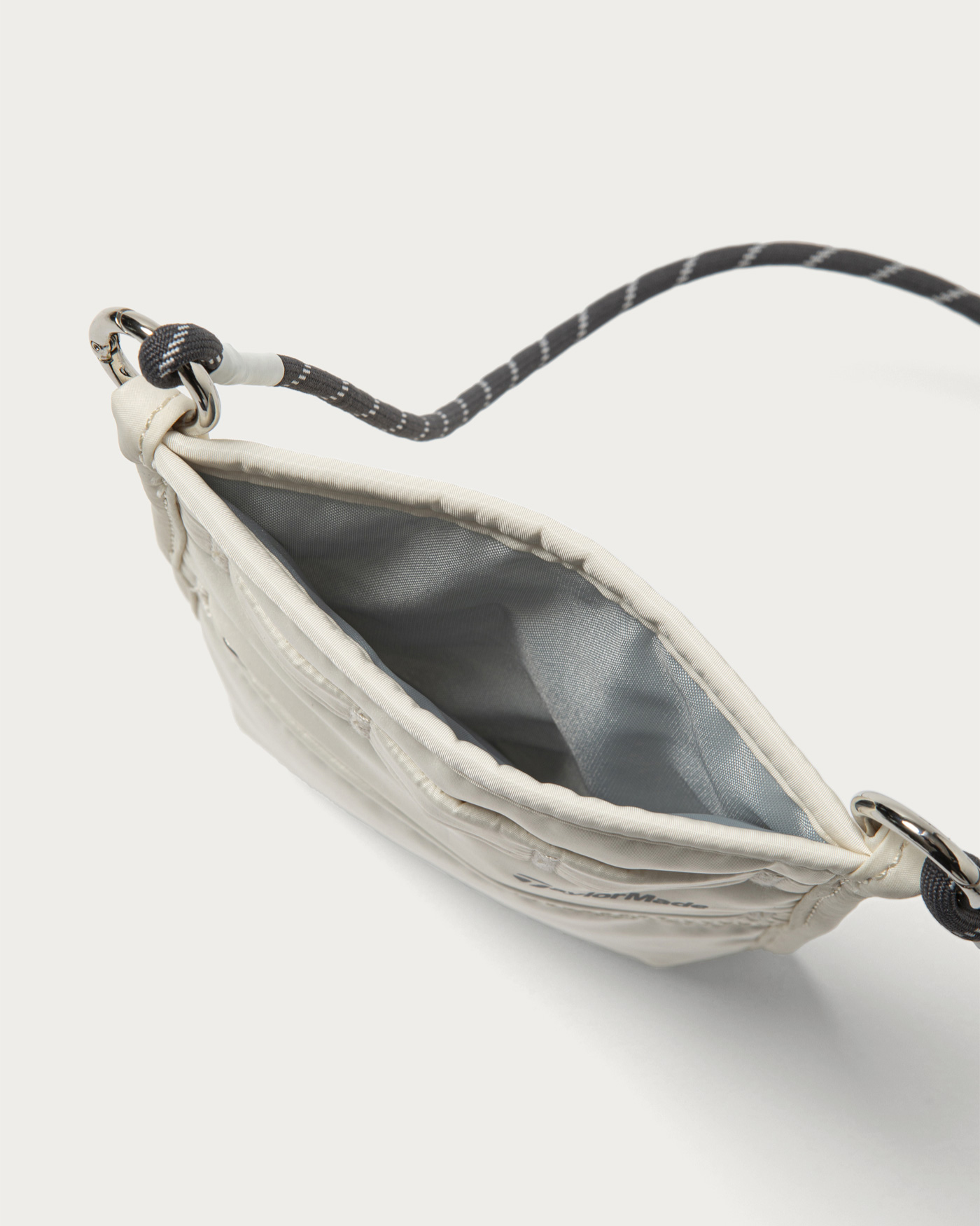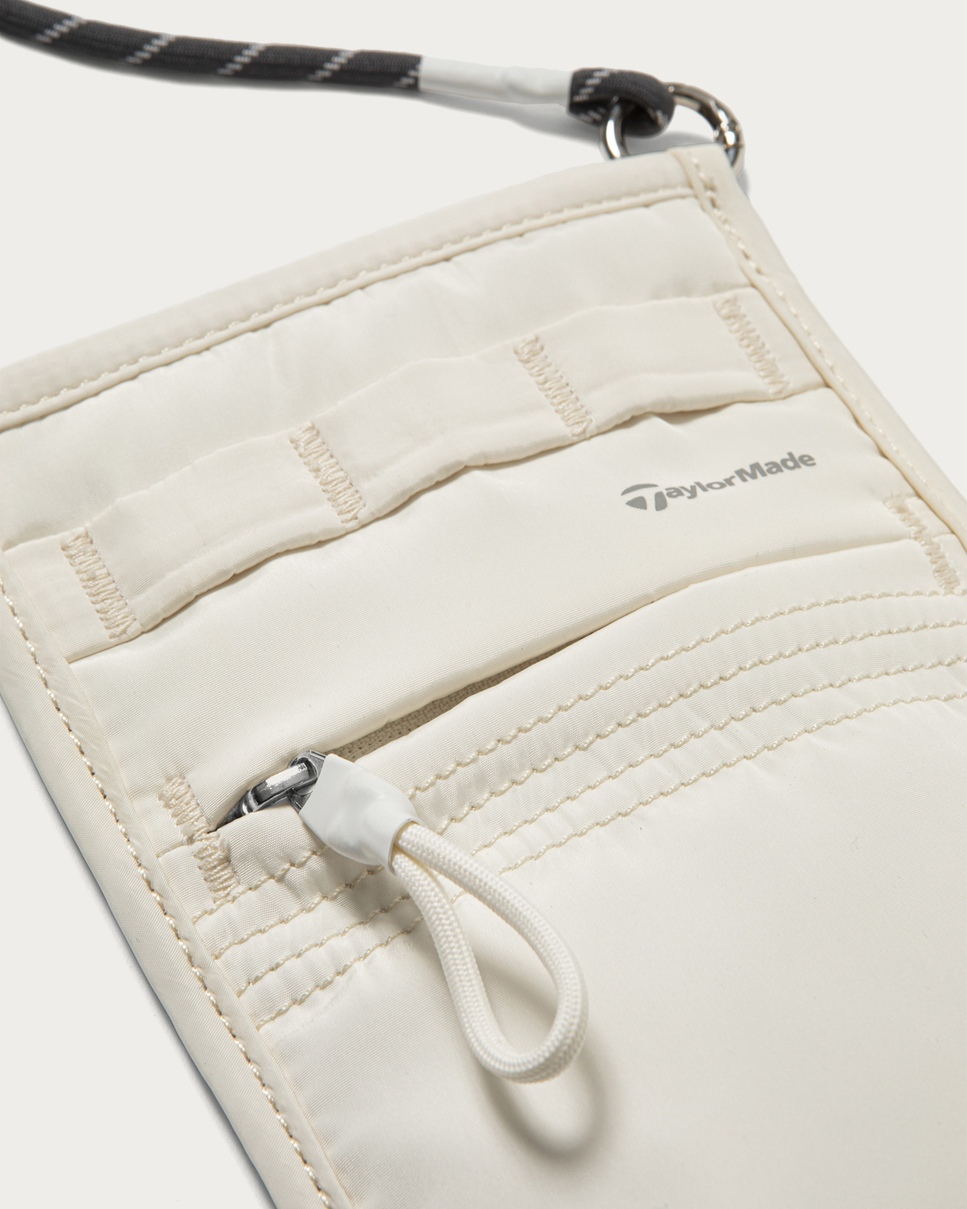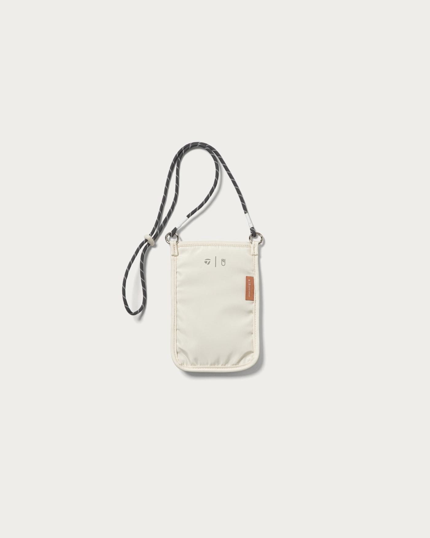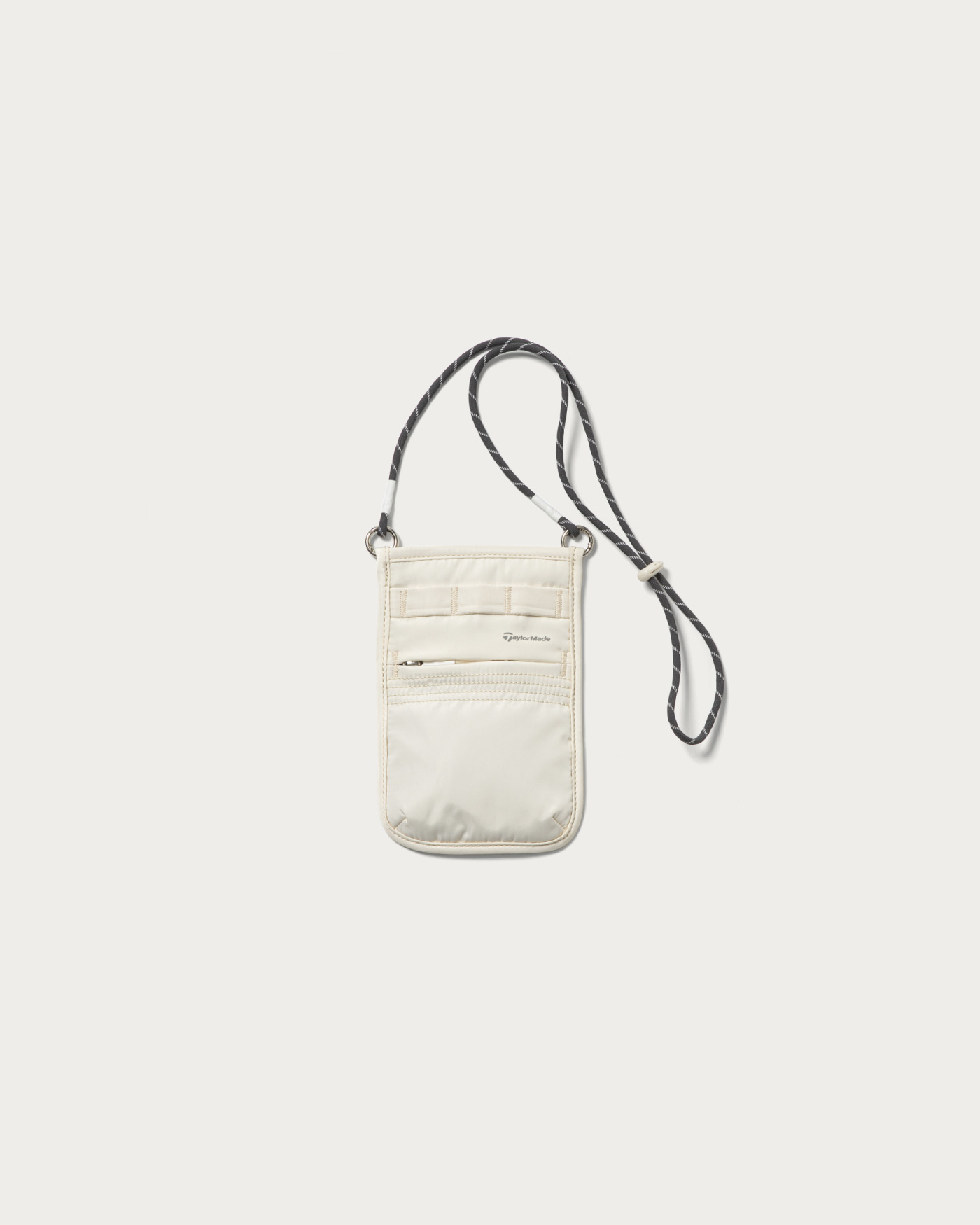 リラックス感のあるふんわりした質感のオフホワイトのポリエステル素材を採用し、ボディにUAのブランドカラーであるオレンジのワッペンをアクセントにしたサコッシュ。正面にはファスナーポケットを配し、太目の紐状のショルダーストラップを採用。スコアカード等の小物をさっと出し入れするのに便利なサイズのアイテムです。