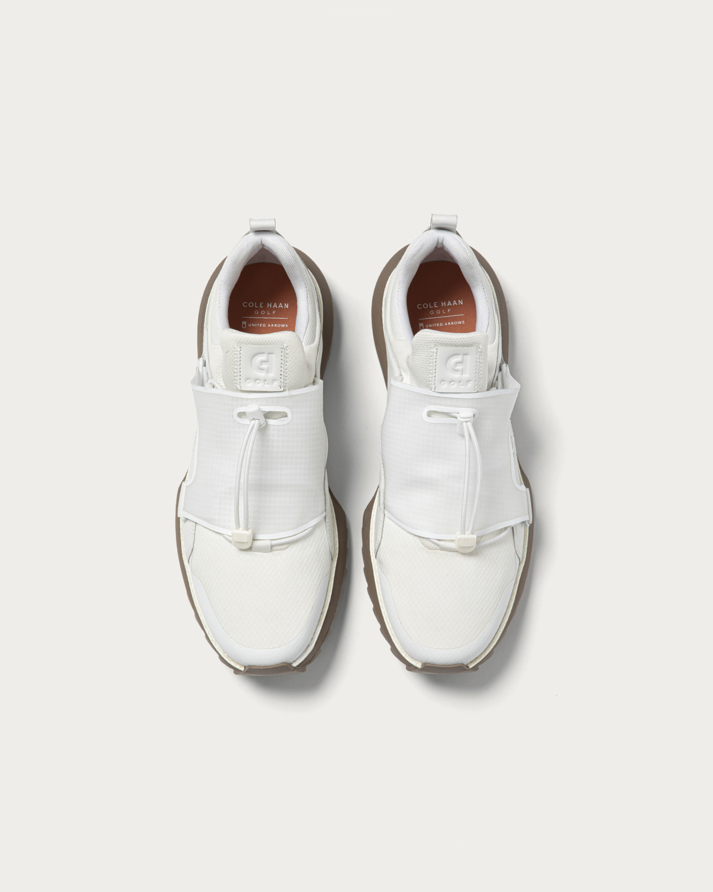 「Ashland GOLF」の木型を使用し、モンクストラップのスリッポンタイプのアッパーディテールに変更したスパイクレスシューズを別注。インラインでは展開のない新たなデザインパターンとカラーリングで、スポーティながらも上品な印象を与えるスペシャルモデルです。
