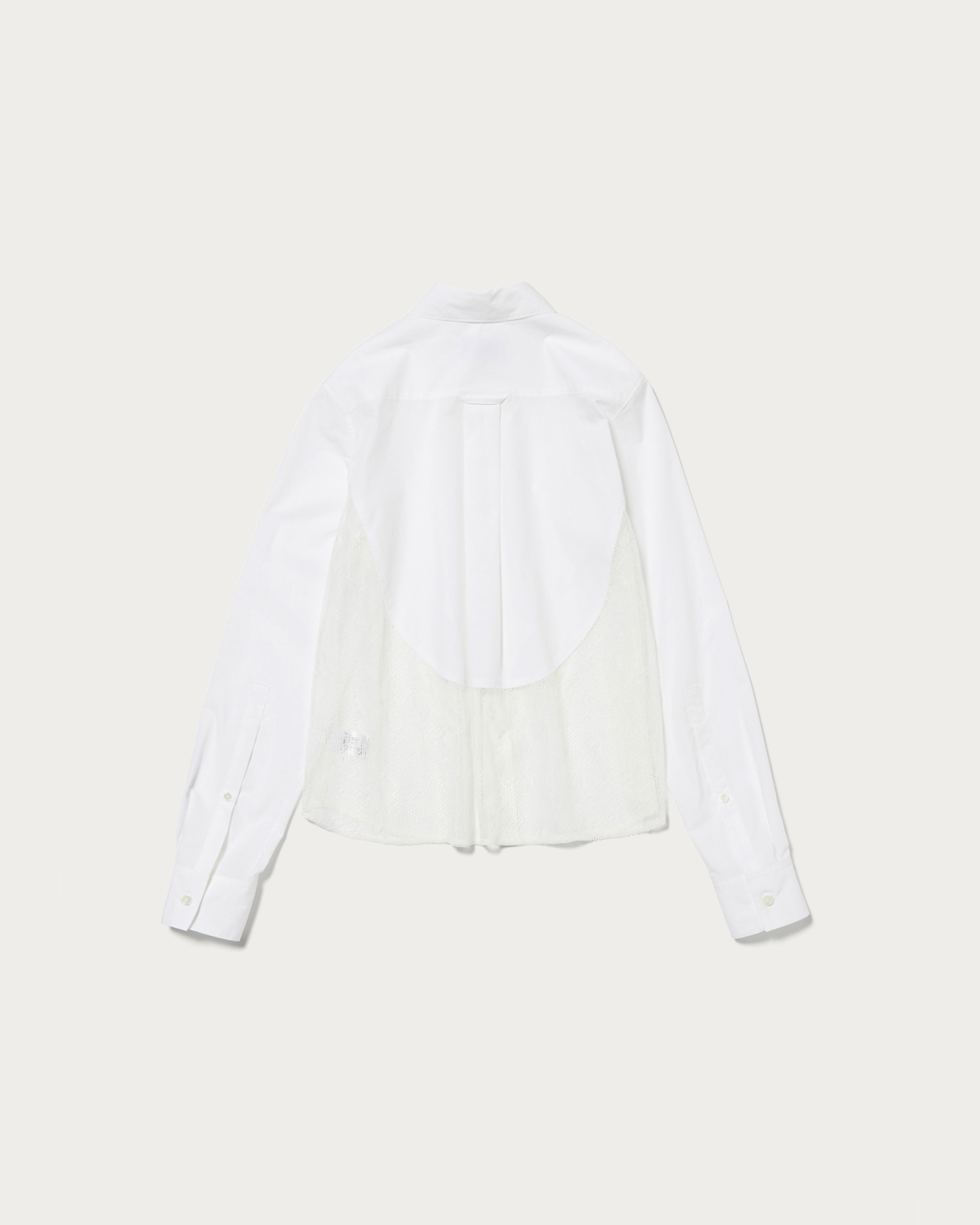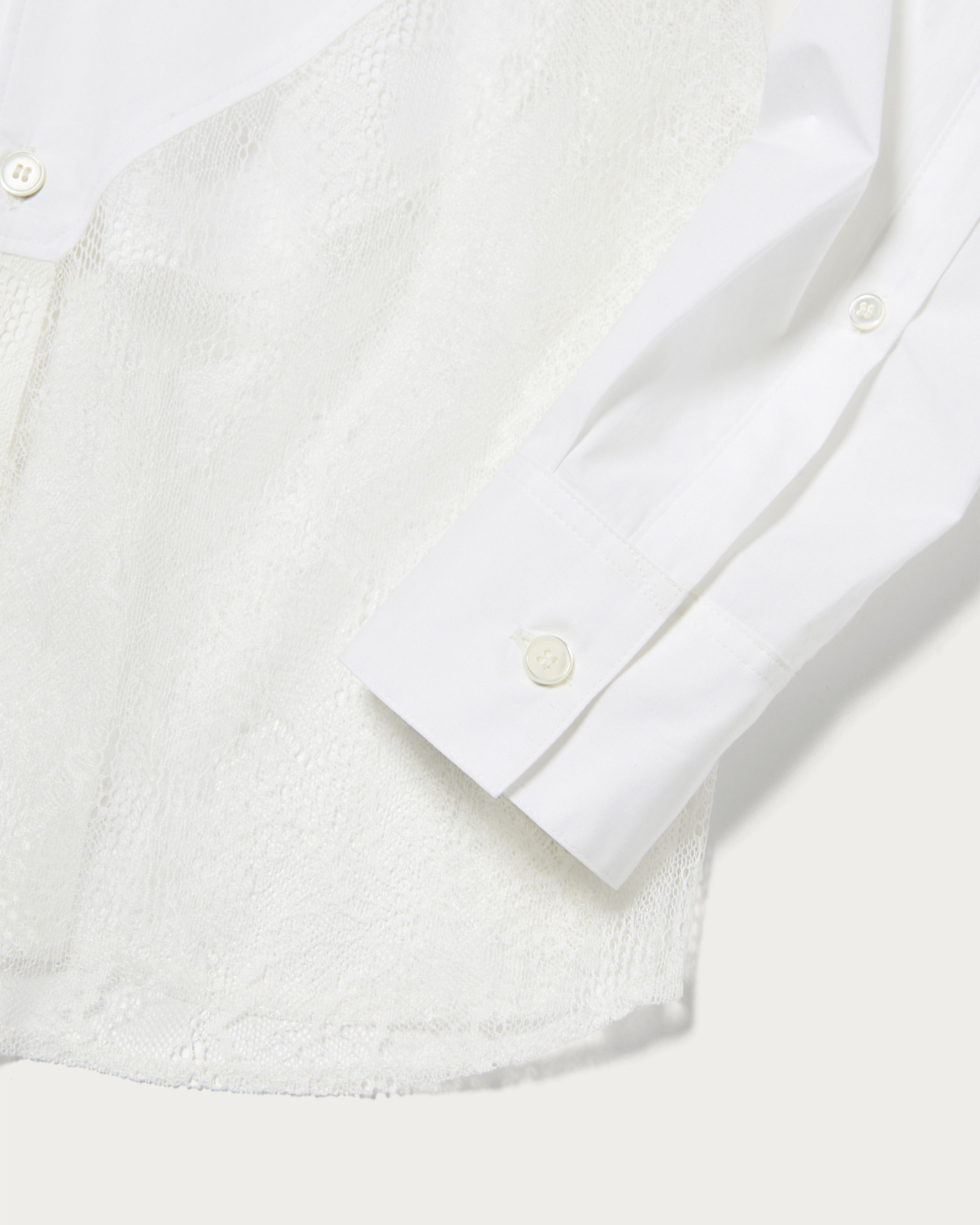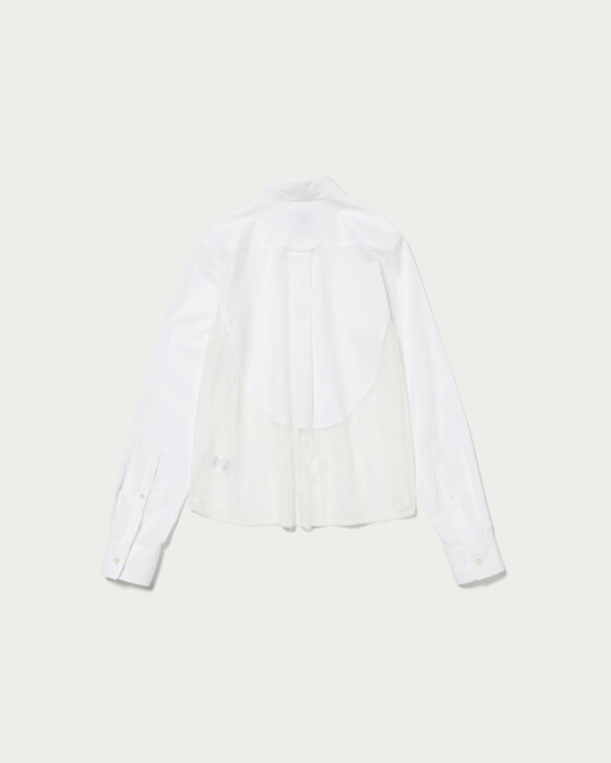 タイプライターとレースをドッキングしたコンパクトシャツ。切り替えのラインやカットオフ仕様などディテールにこだわった一着。デニムなどカジュアルボトムとの合わせがおすすめです。