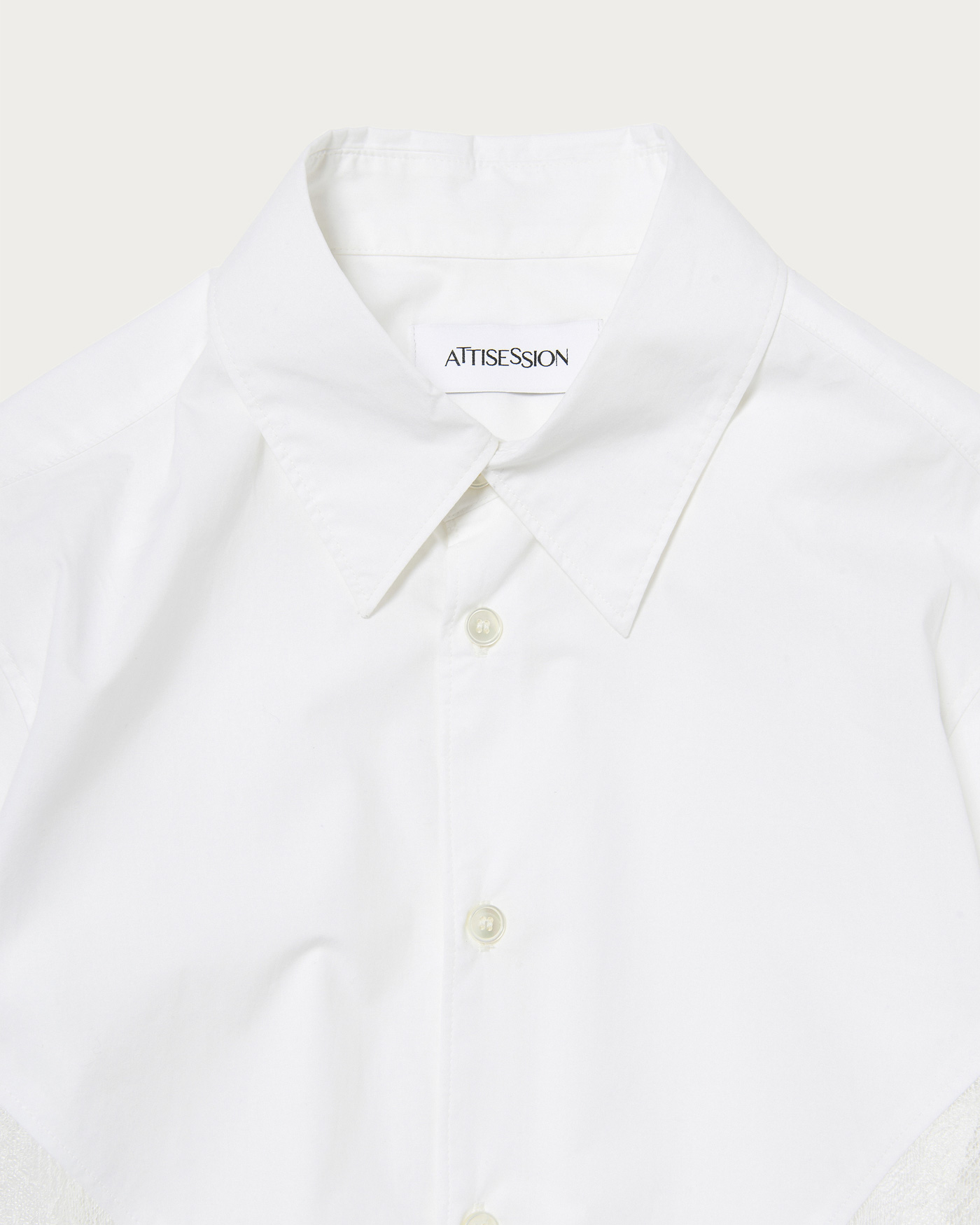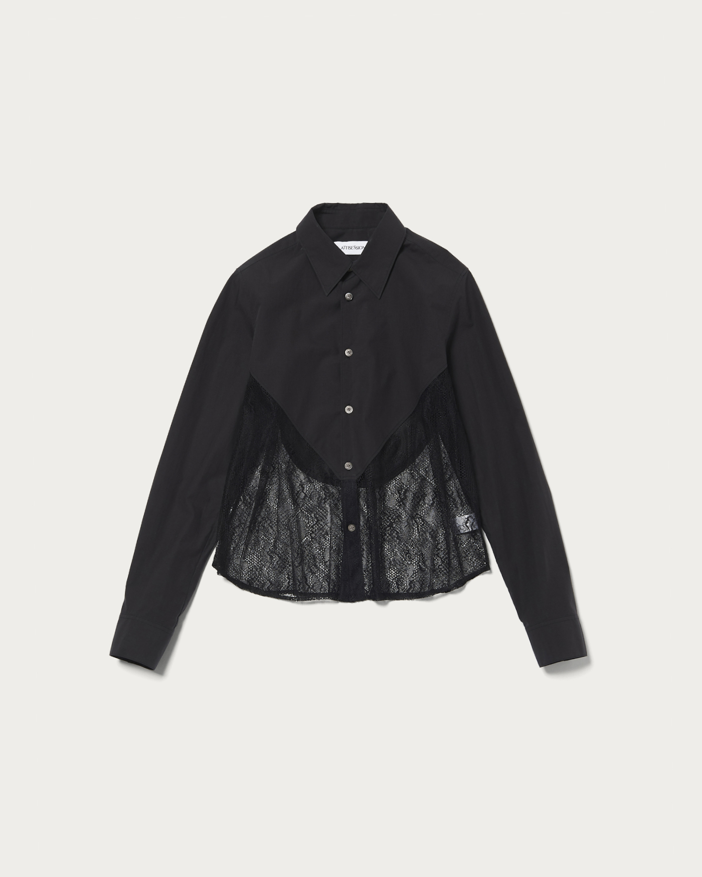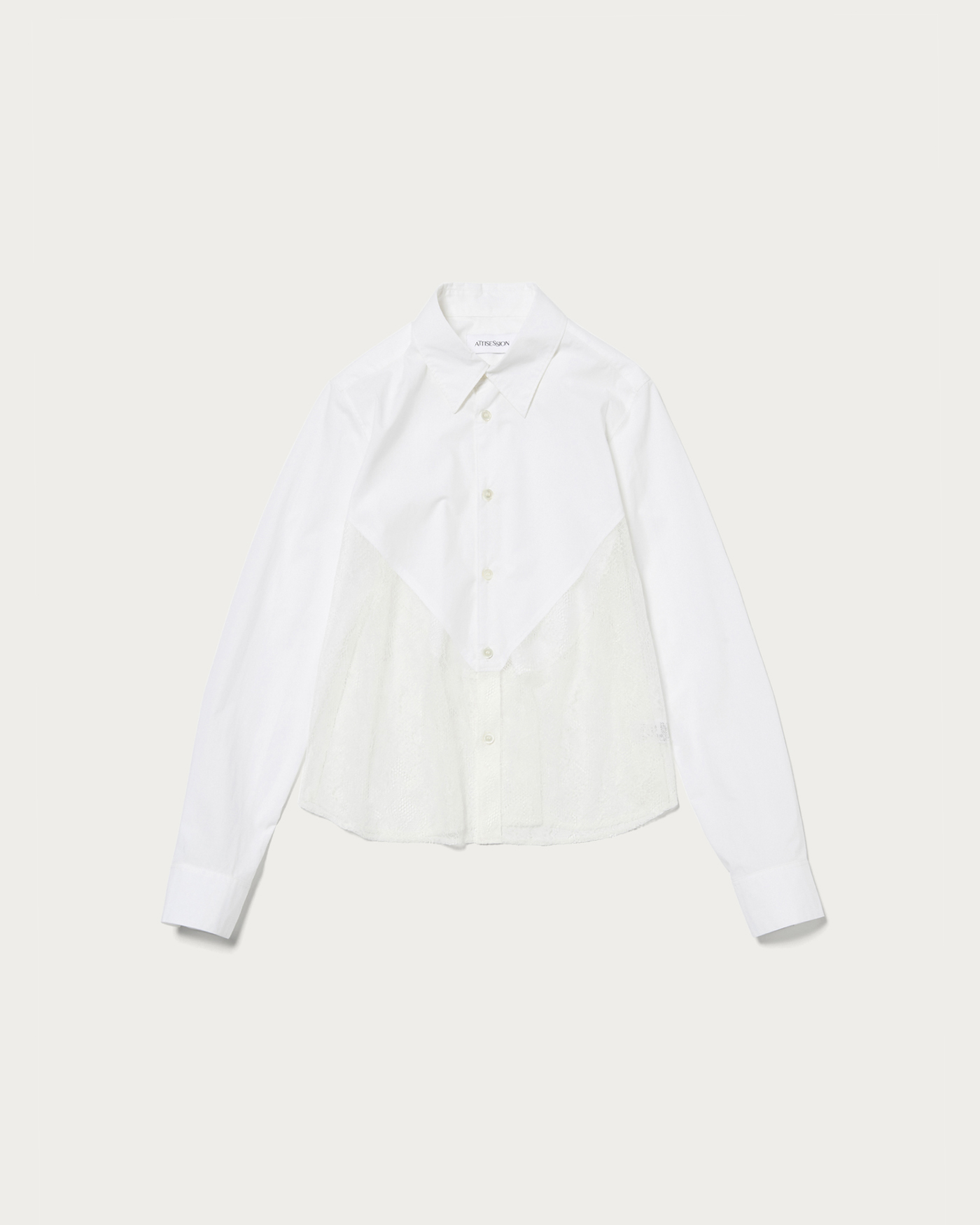 タイプライターとレースをドッキングしたコンパクトシャツ。切り替えのラインやカットオフ仕様などディテールにこだわった一着。デニムなどカジュアルボトムとの合わせがおすすめです。