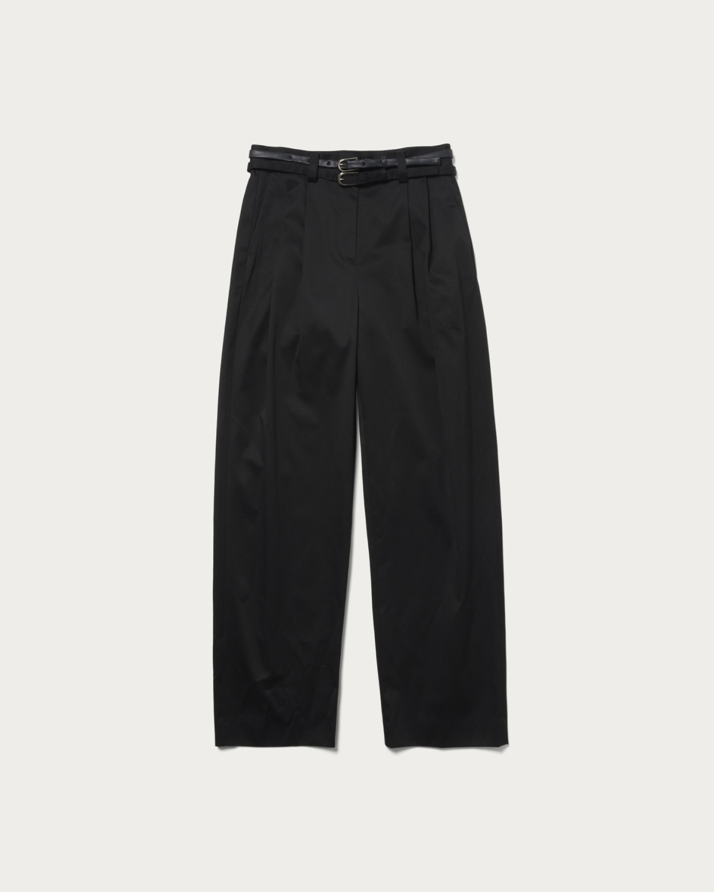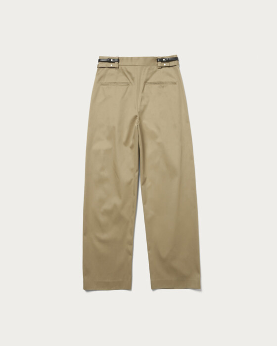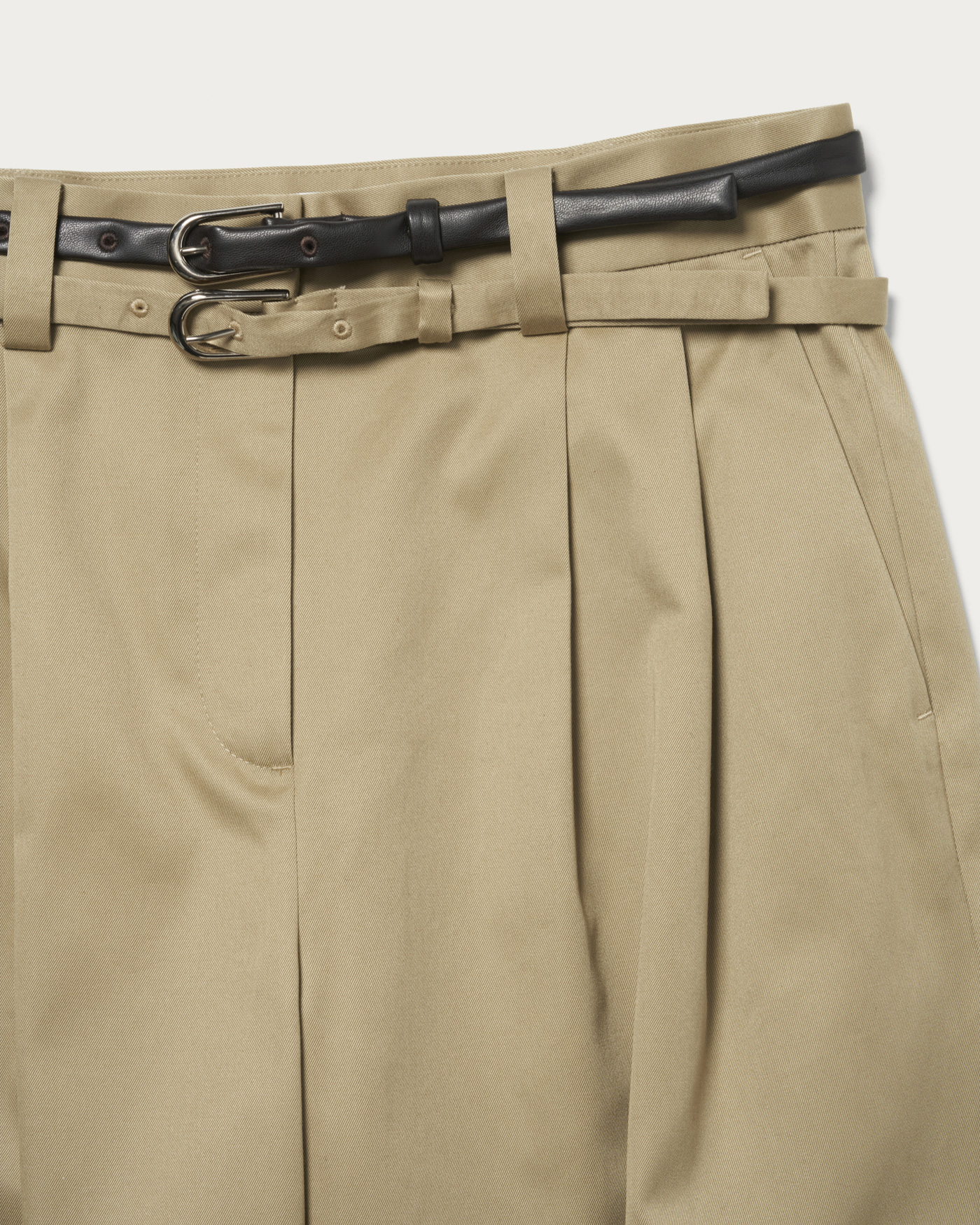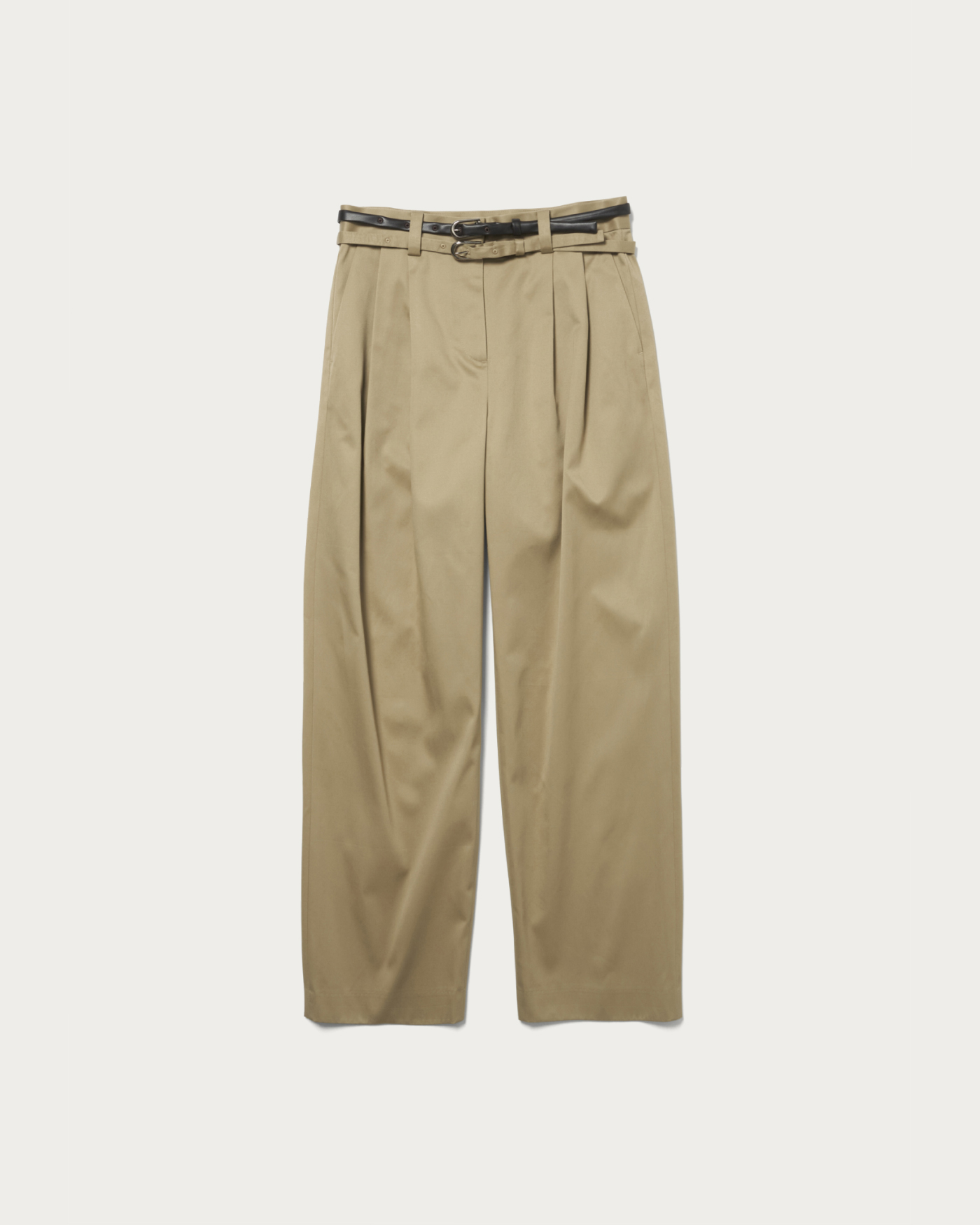 ナローベルトの重ね付けがポイントのデザインパンツ。タックを入れ裾までゆとりを持たせたワイドシルエットに仕上げました。ウエストは腰に落として着用する事を想定したリラクシーなサイジングに。新色のブラックとベージュの2色展開です。