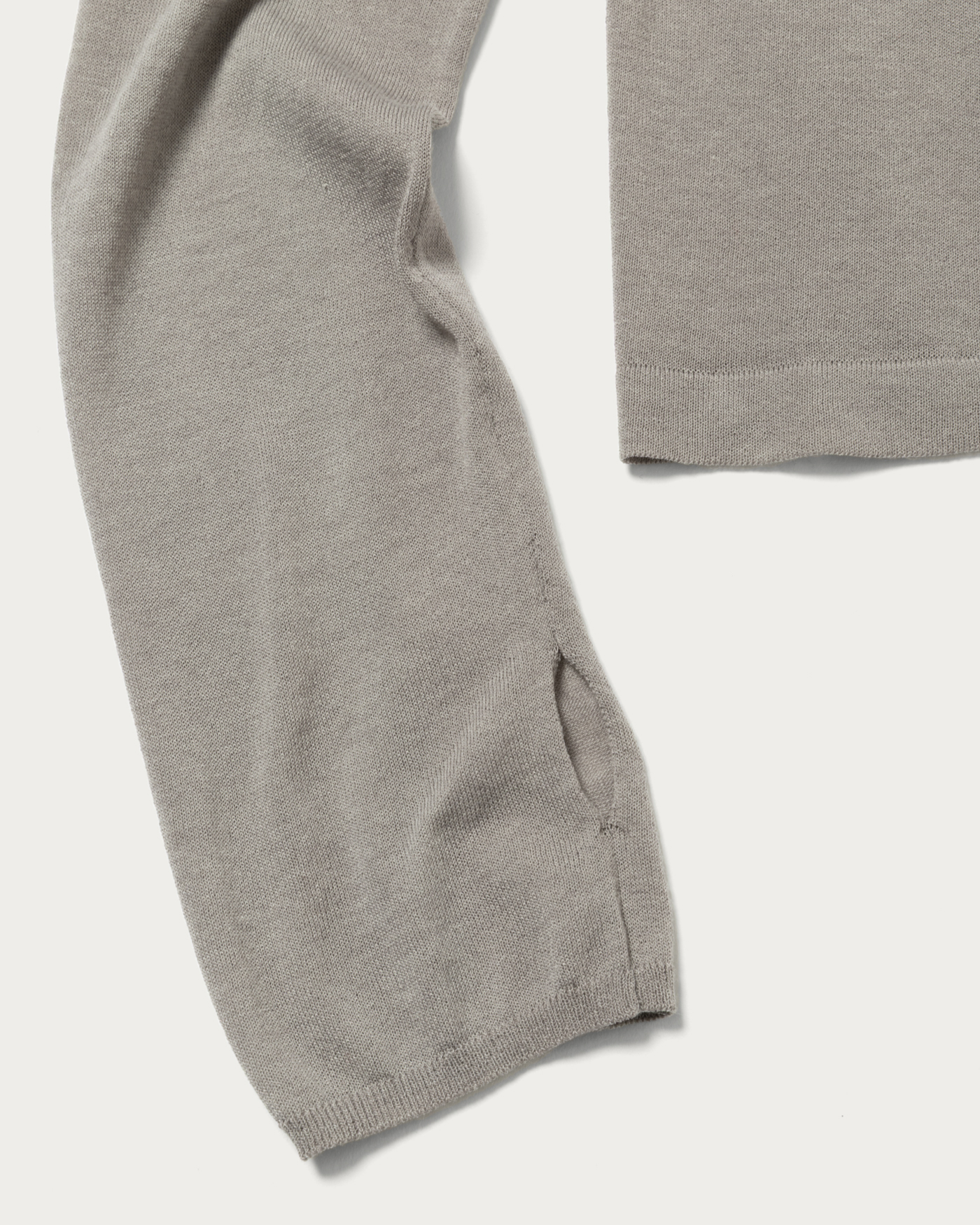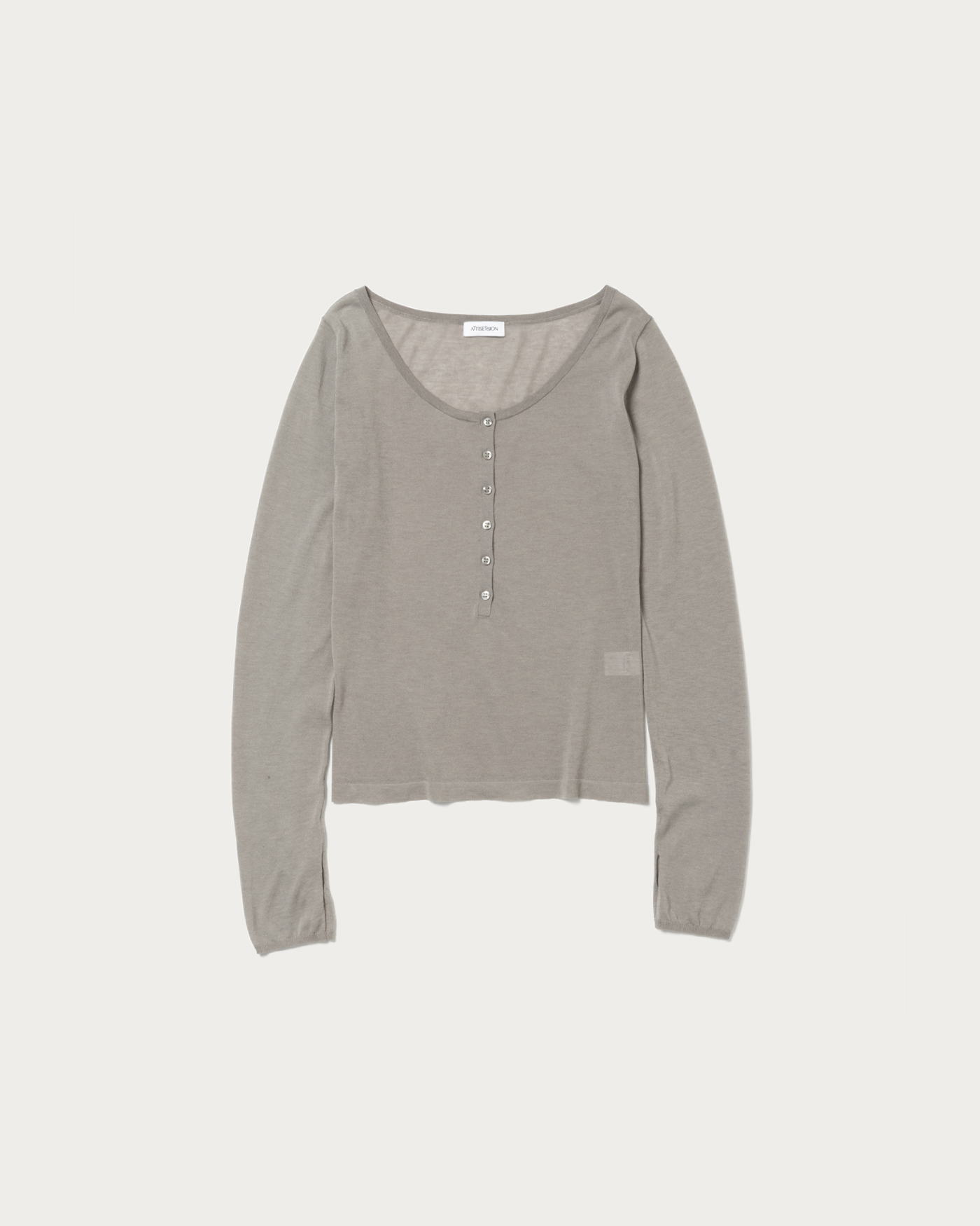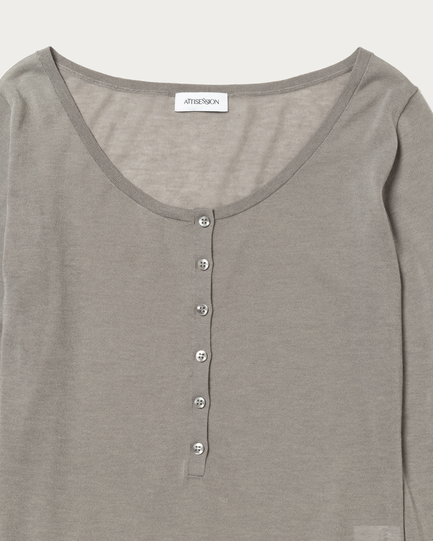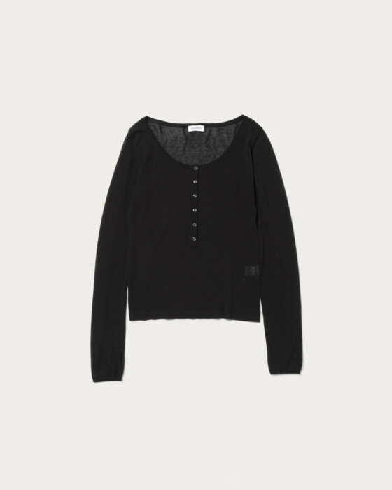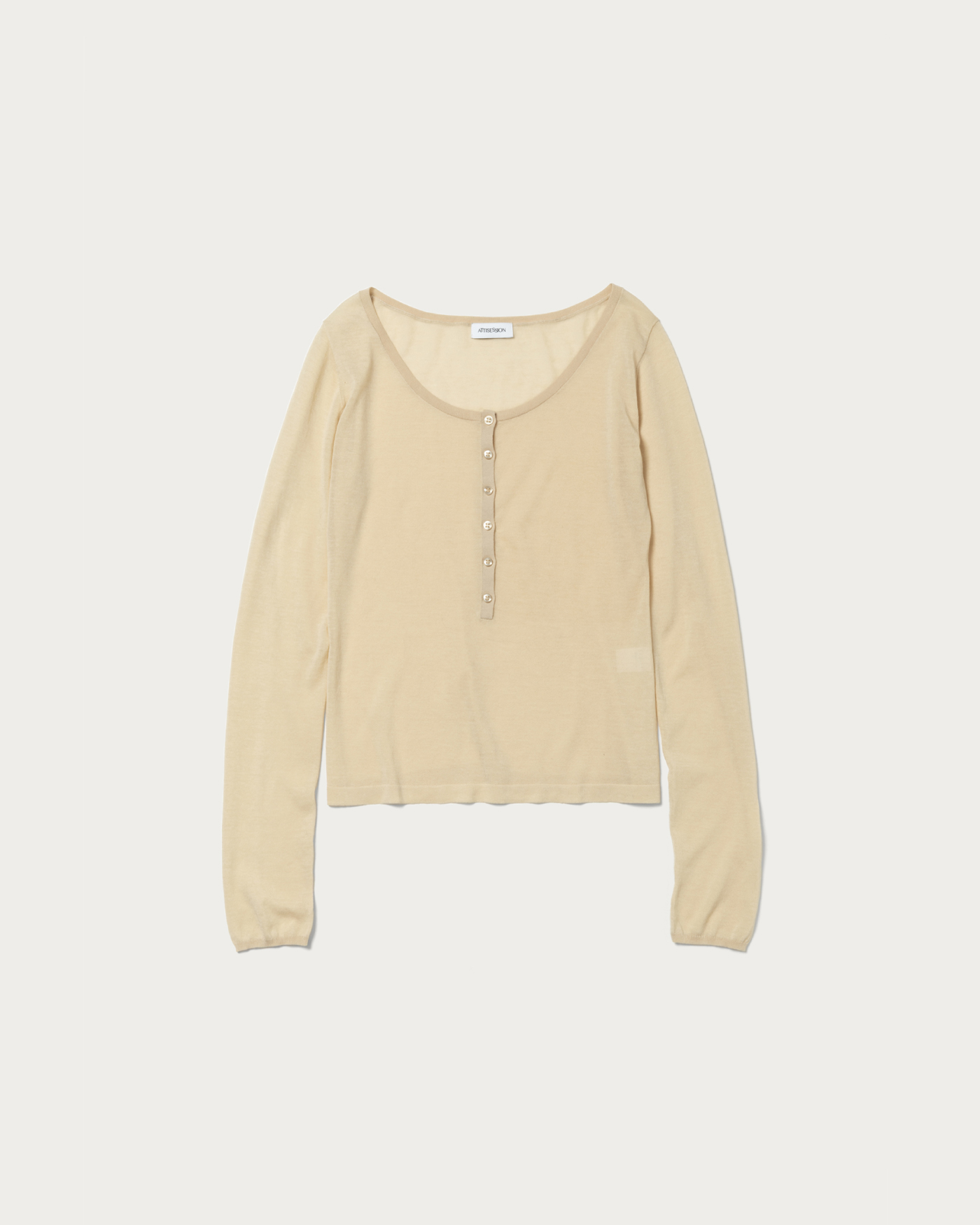 広めの襟ぐりにウエストシェイプさせたシルエットが、ヘルシー&フェミニティなムードを纏うヘンリーネックデザインのトップス。スリーブは長め且つサムホール付きでトレンド感のある一着です。