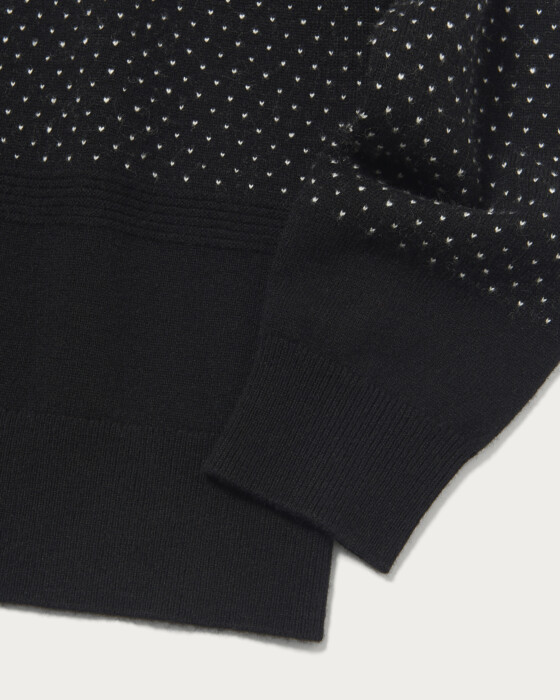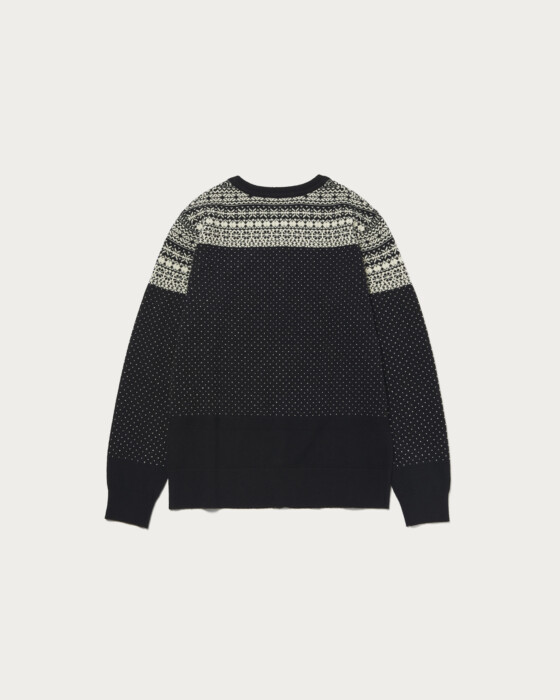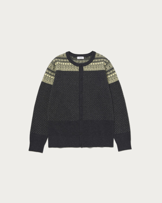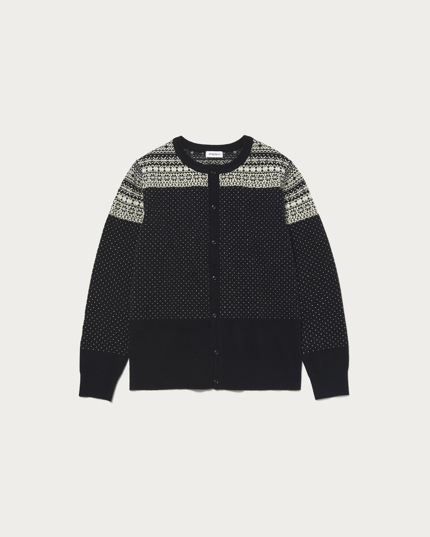 ノルディック柄が目を惹くニットカーディガン。やや長めに設定された着丈がアクセントをプラス。羽織としてはもちろん、一枚着でもさまになる一着です。