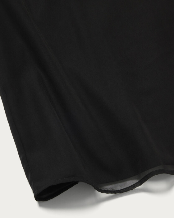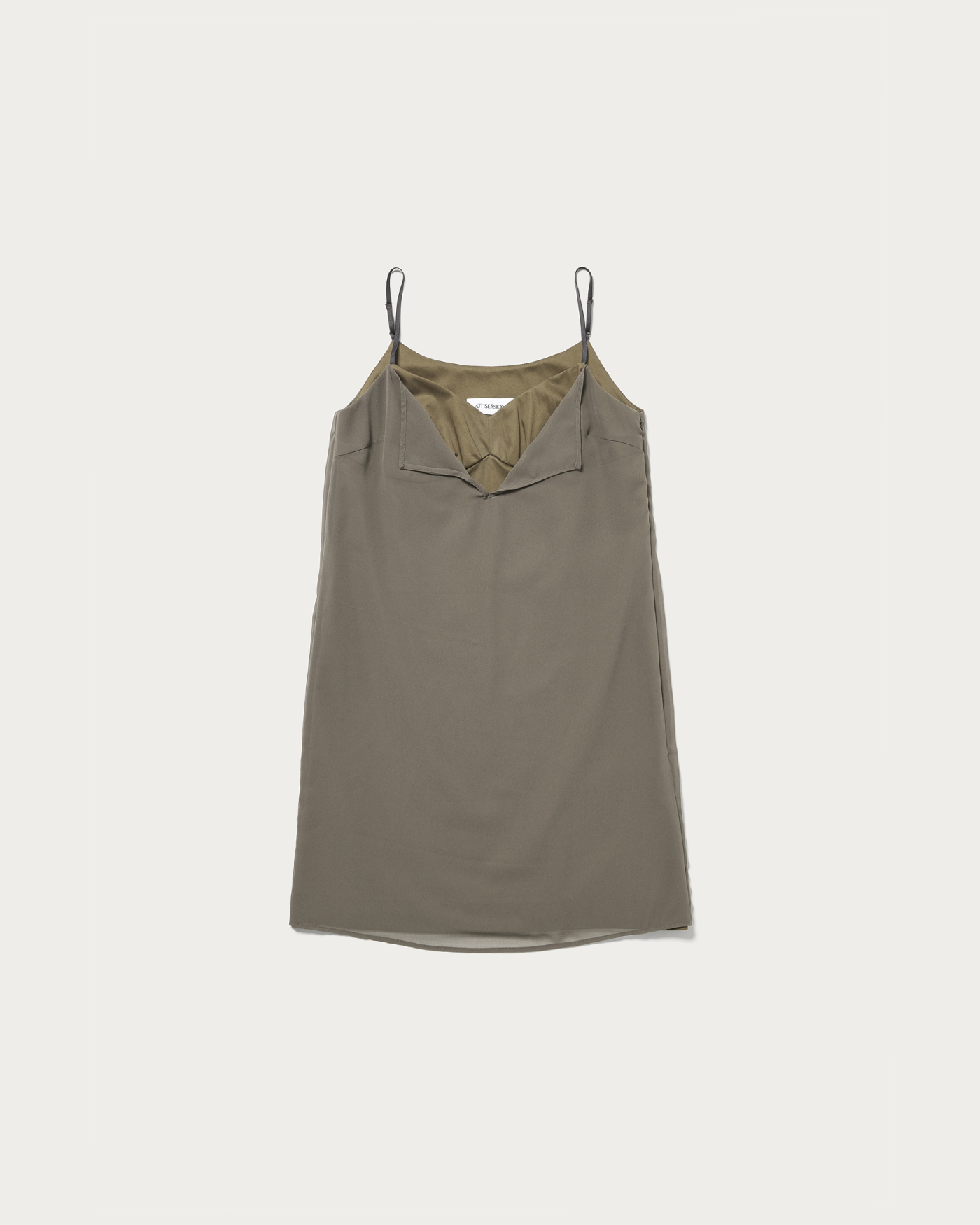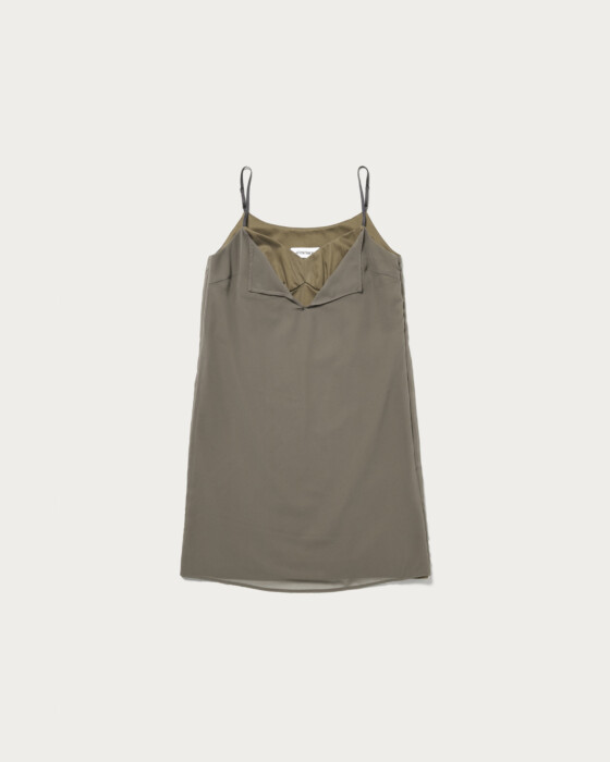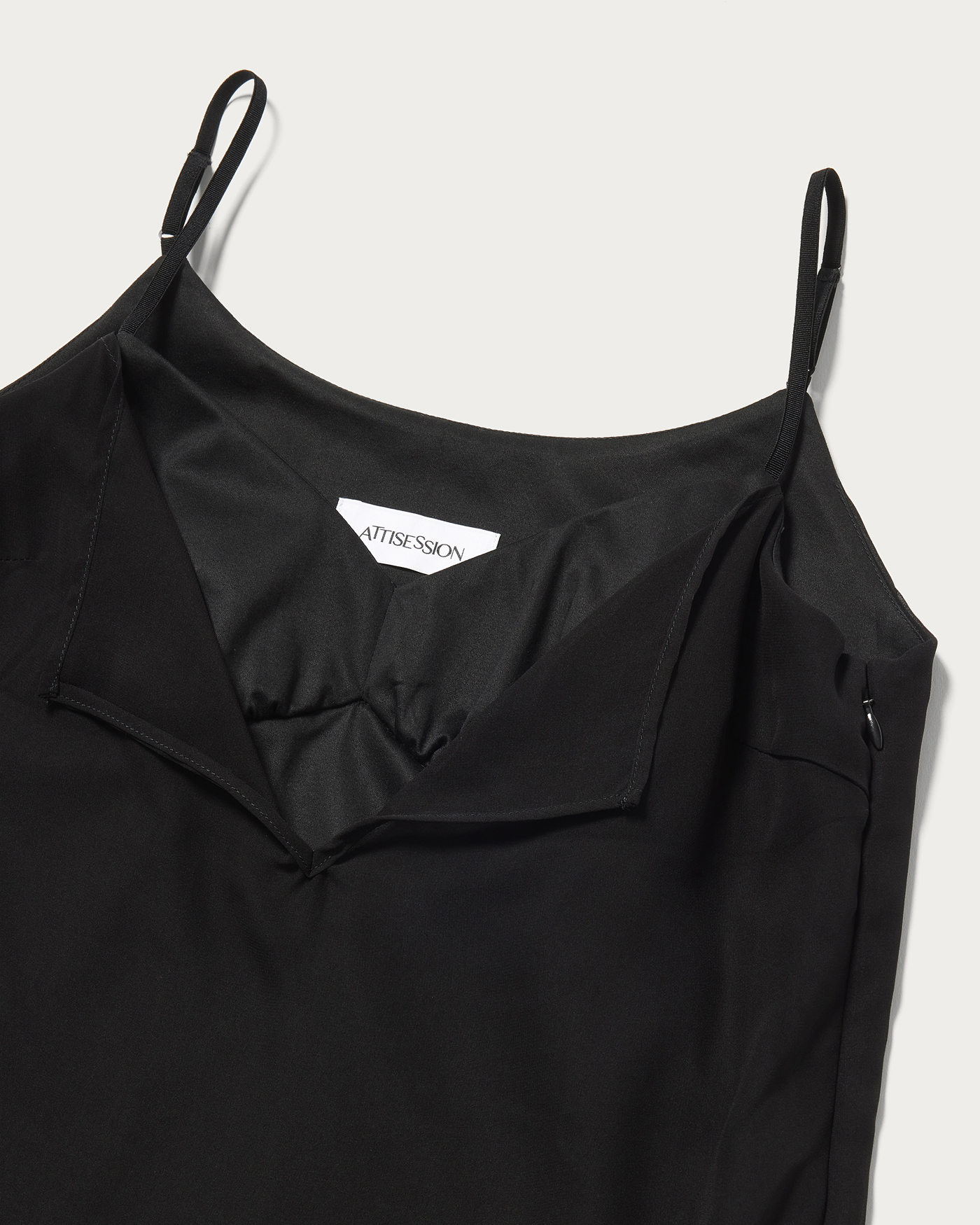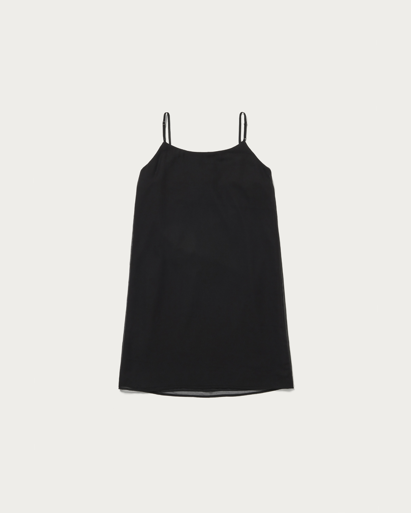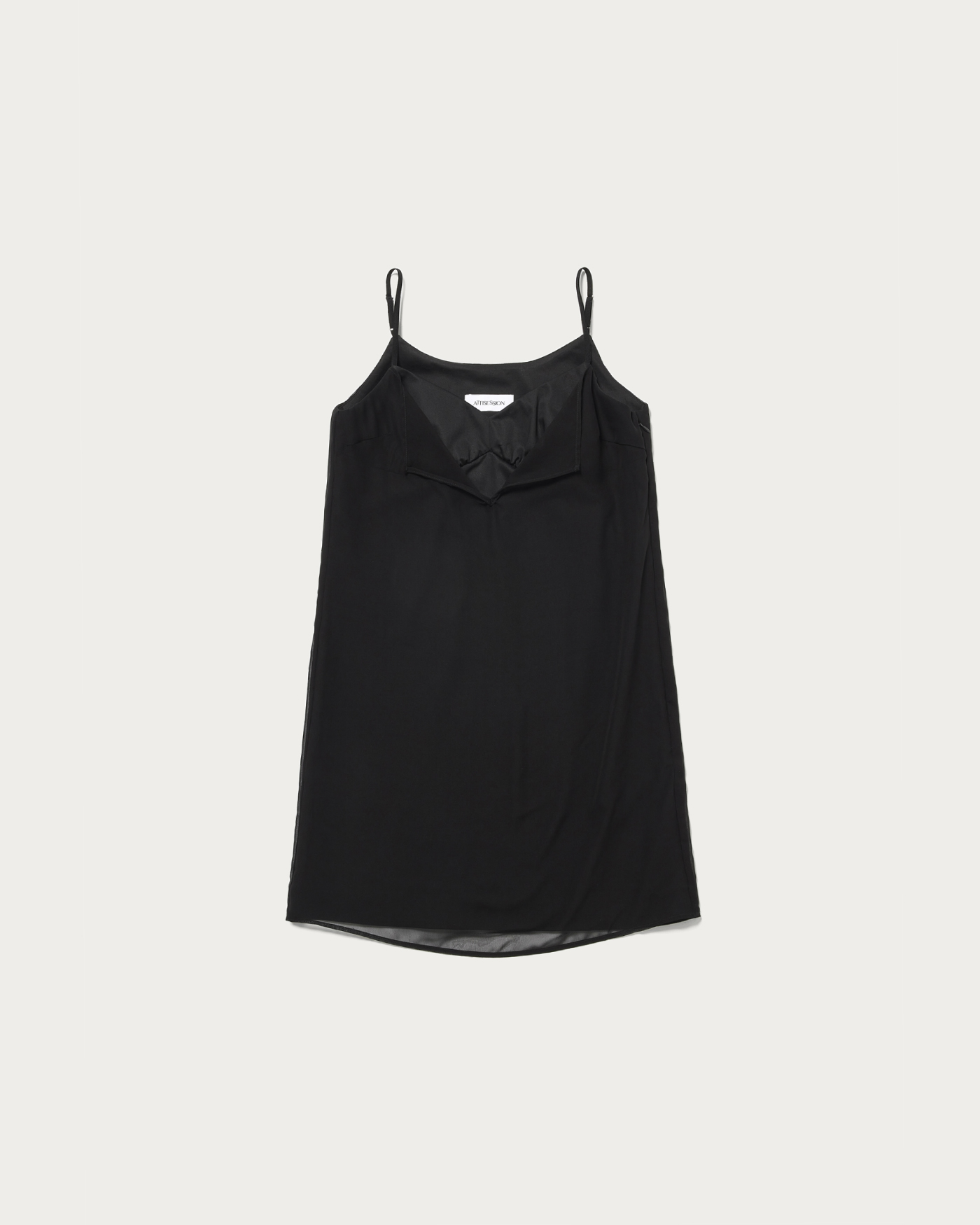 サテン地にオーガンジー素材を重ねたようなデザインのミニワンピース。胸元はラフな雰囲気のディテールを取り入れ、華奢な肩ストラップはアジャスター付きで調整できるように仕上げました。モードな印象のブラックと、ニュアンス感が漂うダークブラウンの2色をご用意。