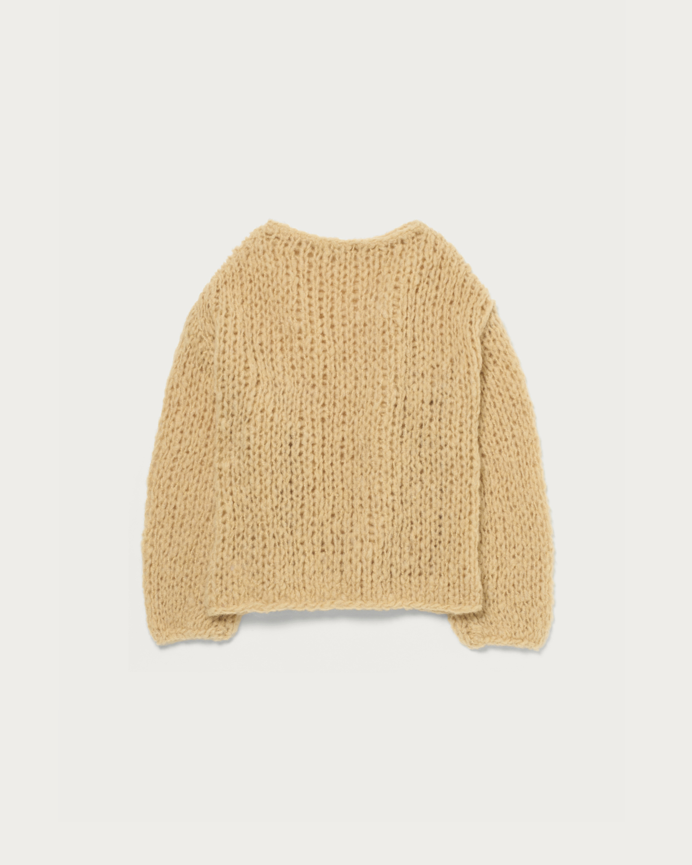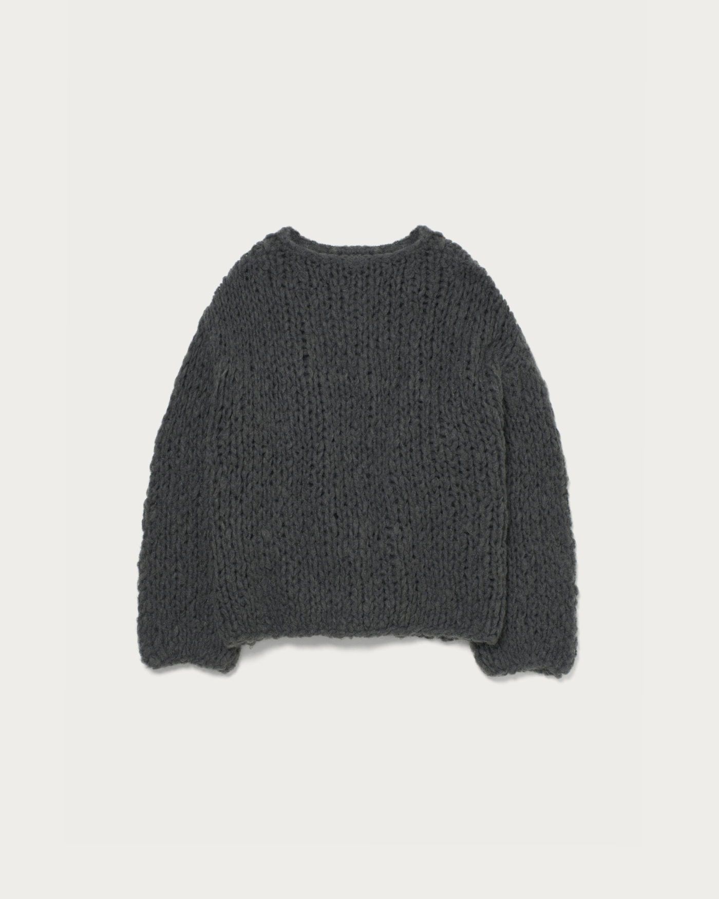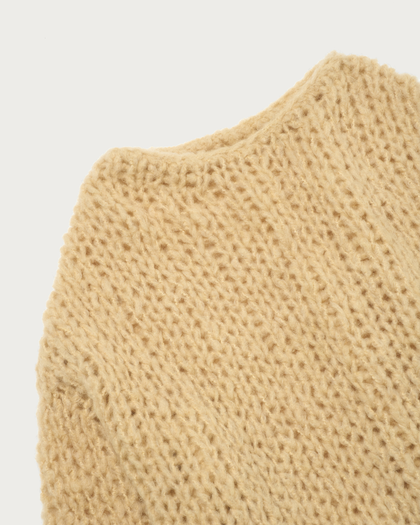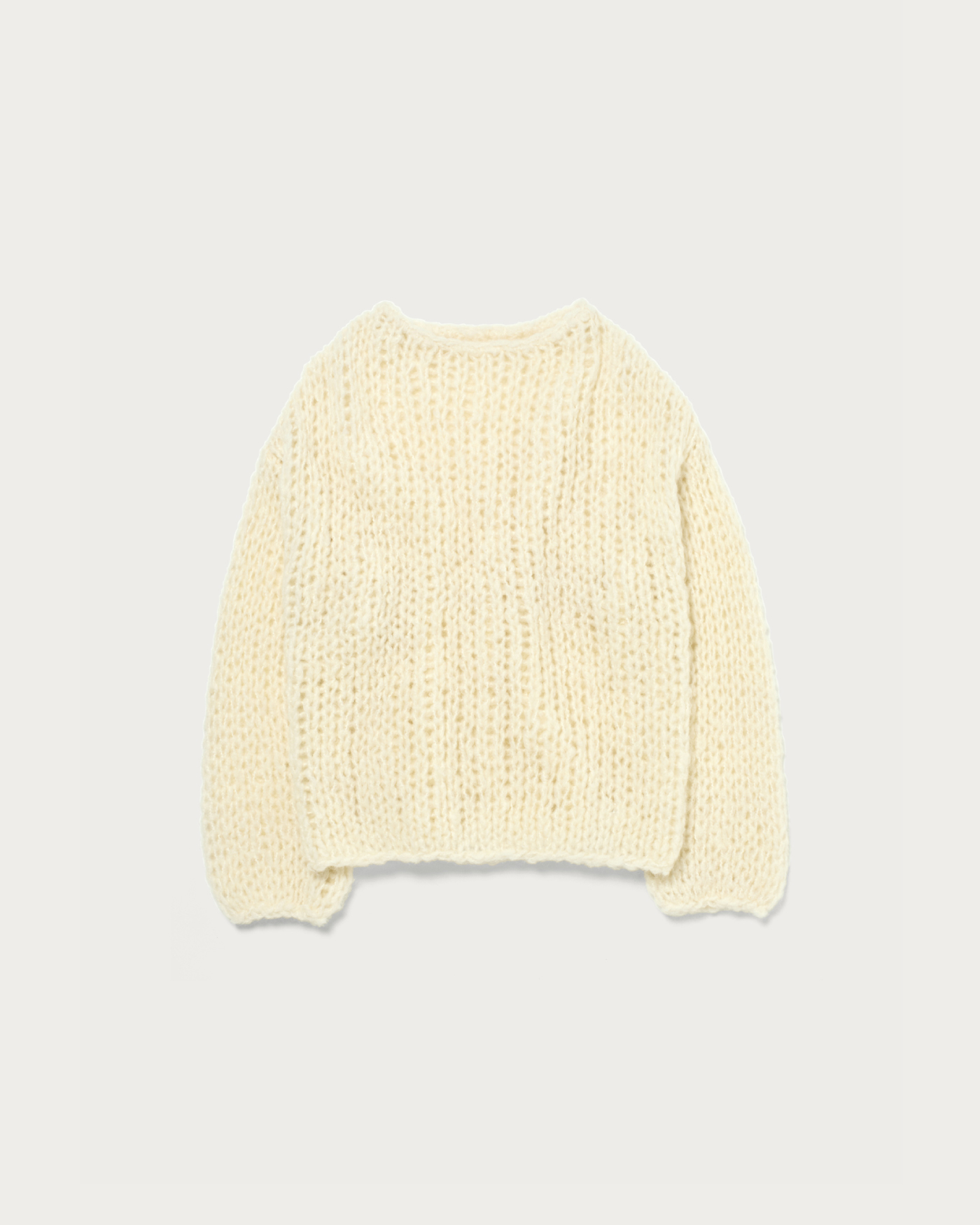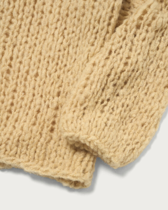 ブラッシュをかけてふくらみを出し、別注の厚手の糸を使用したルーズニット。棒針の手編みニットのような編地で作りました。同時期展開のコーデュロイパンツとのスタイリングがおすすめです。