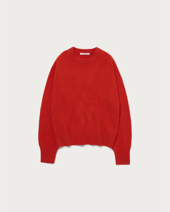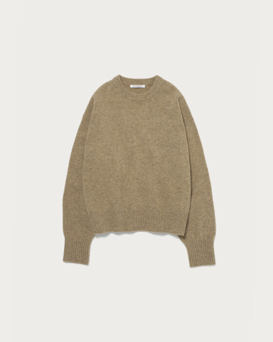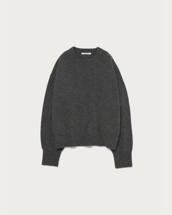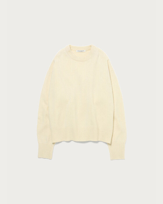 定番のアクアラグランクルーネックニット。今年は前年のラグランスリーブをセットインスリーブへアップデートし、装いに抜け感を与えるボクシーなリラックスシルエットに。素材はウールをベースにナイロンとカシミヤをブレンドした、ソフトで心地良い肌触りのものを使用。厚過ぎず薄過ぎないミドルゲージは、デイリーに活躍します。シンプルに一枚ではもちろん、柄ボトムやスカーフなど小物でアクセントを添えた着こなしも様になります。