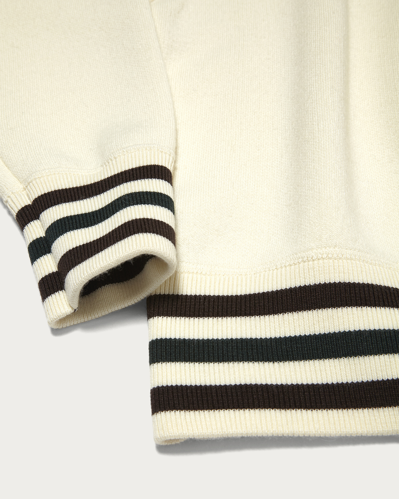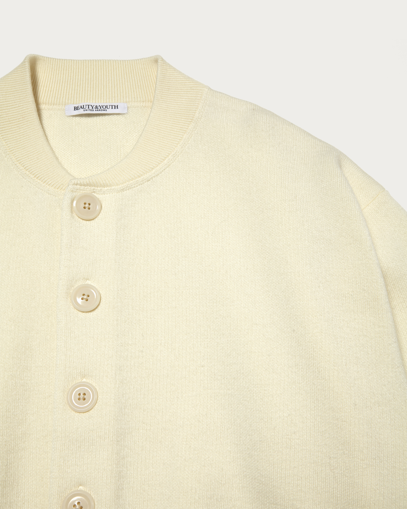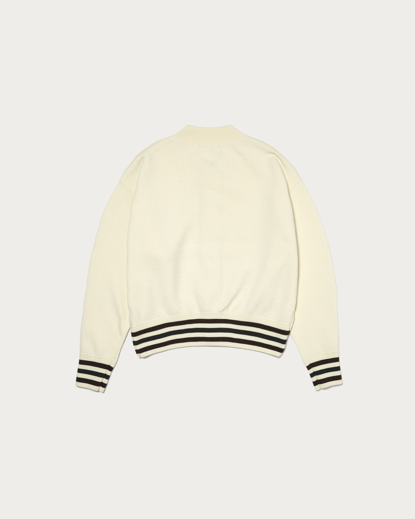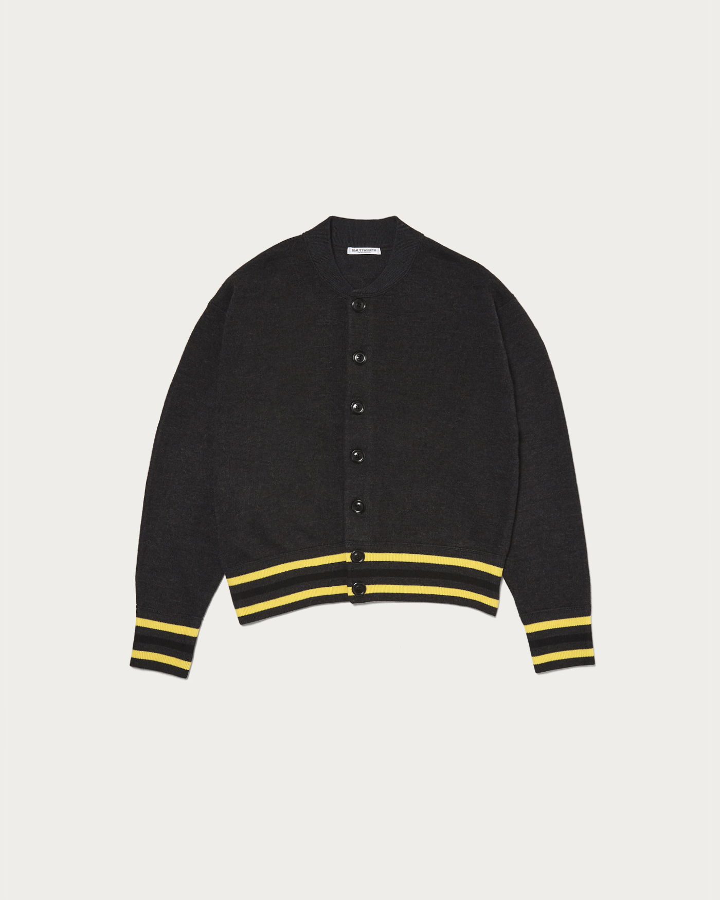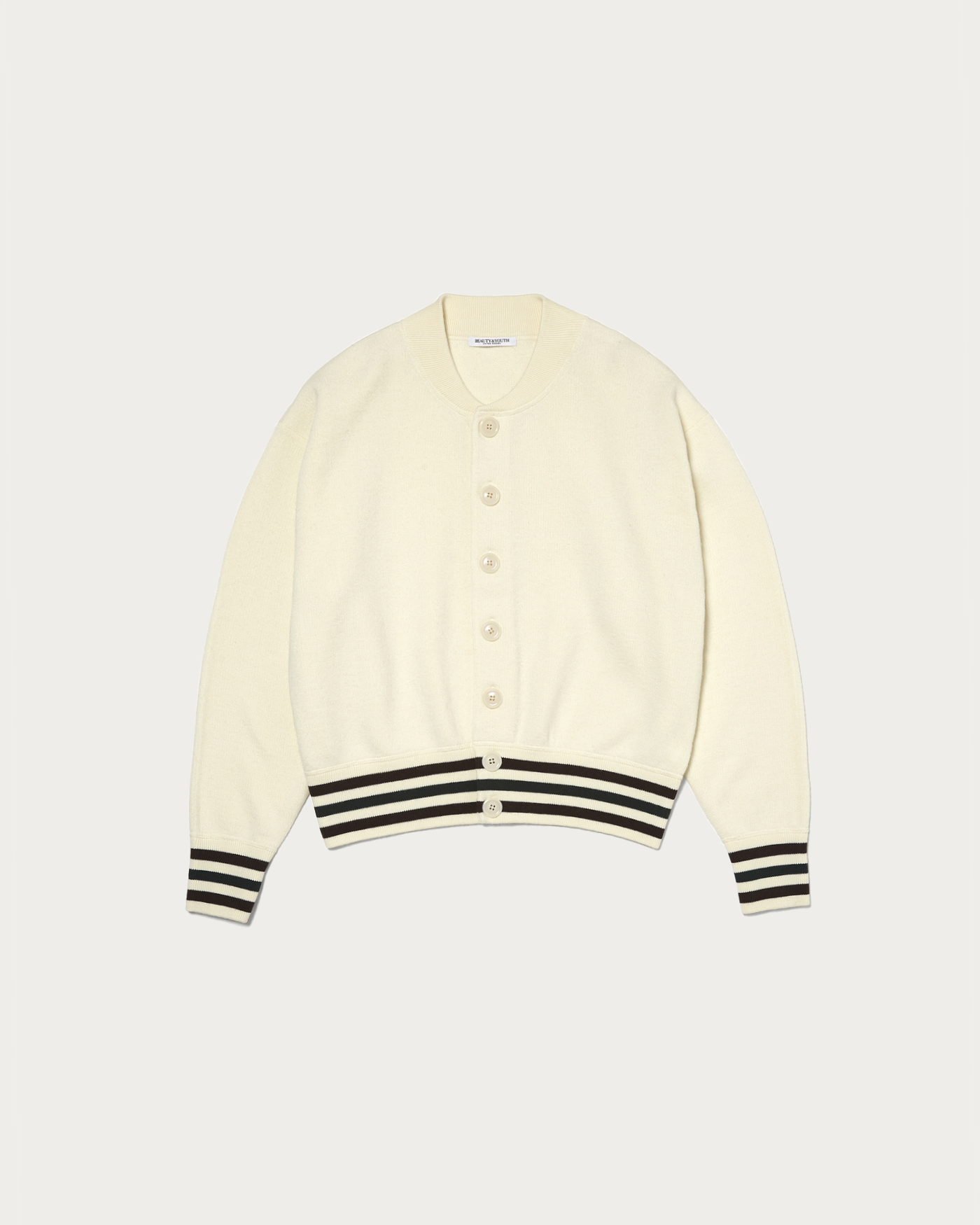 アメリカの士官学校のユニフォームをベースにした、配色リブがポイントのスタジャン型ニットカーディガン。レイヤードしやすい丸首のラインと、大き目のボタンがポイントです。また、ウールとアクリルをブレンドした糸は、上品な光沢としなやかさが特徴。それをダブルジャガードに仕立てることで、形崩れしにくく美しいシルエットを表現しました。
