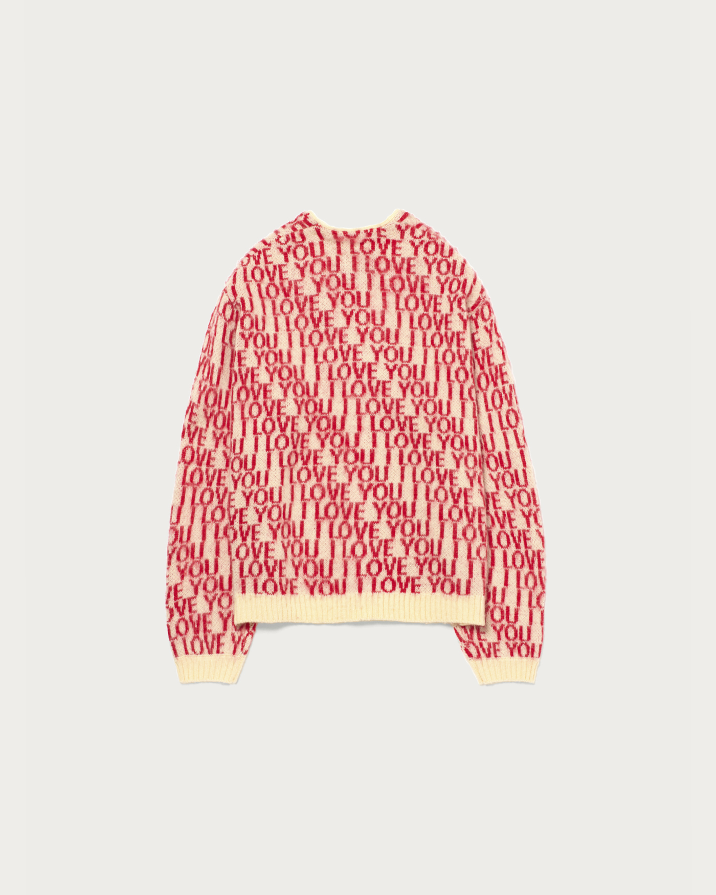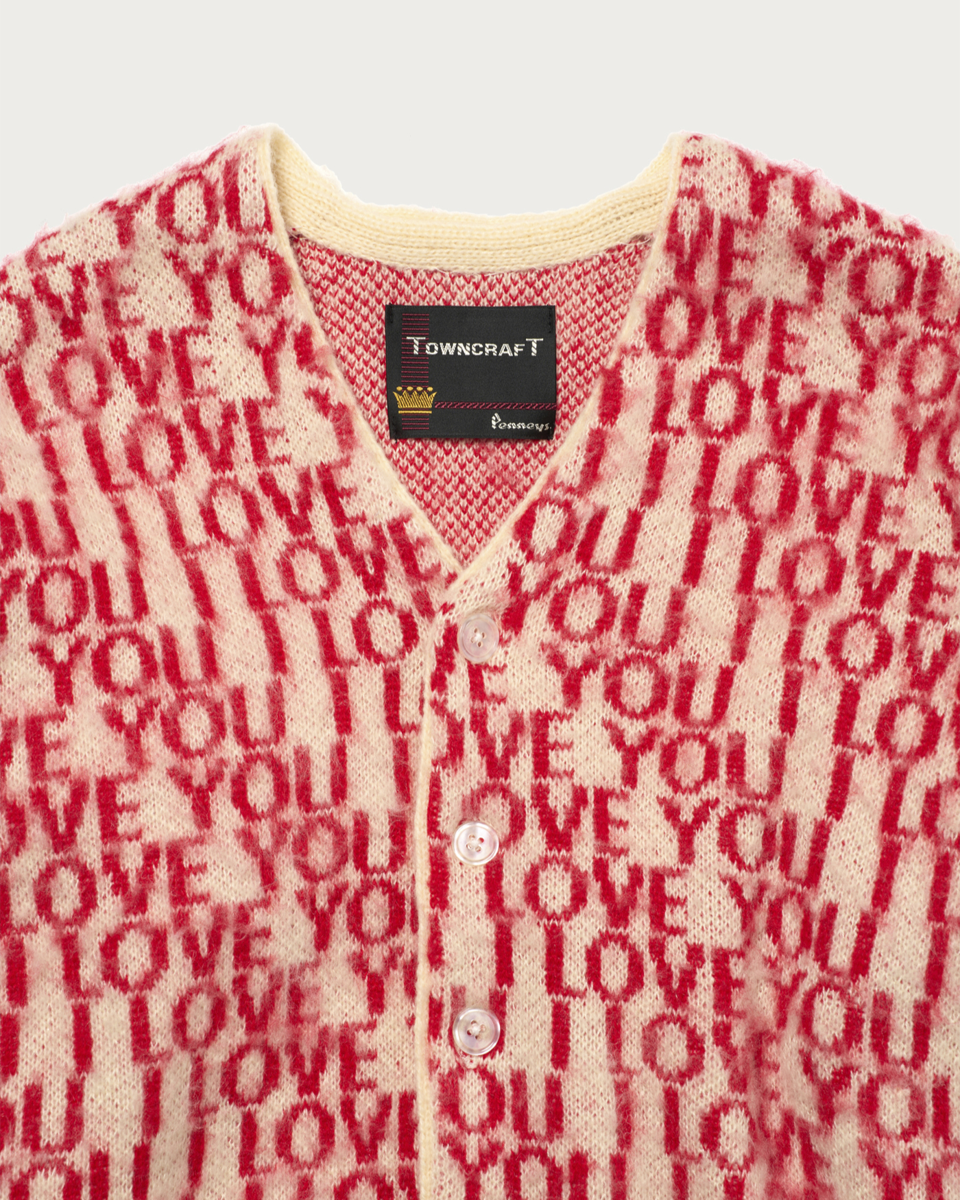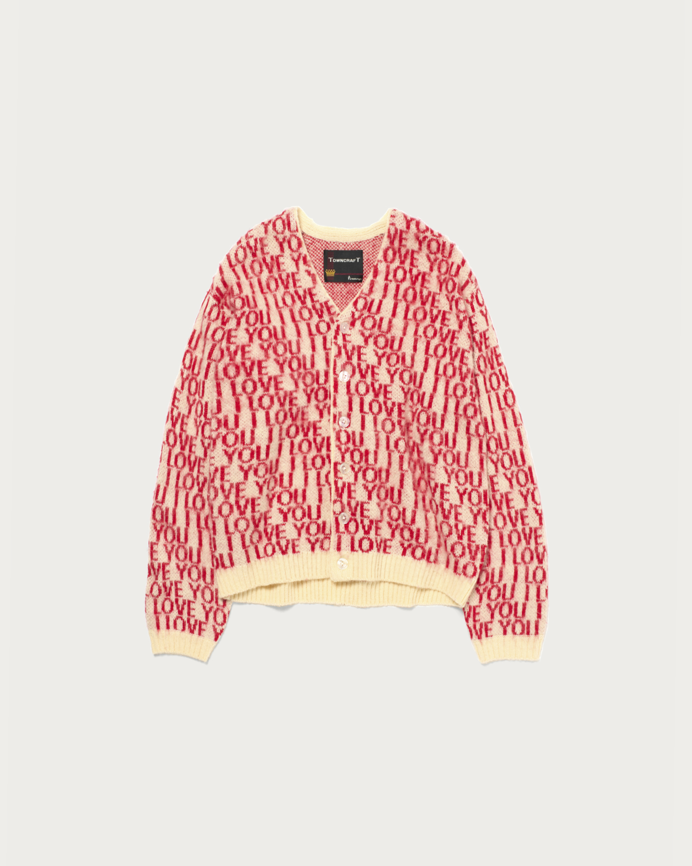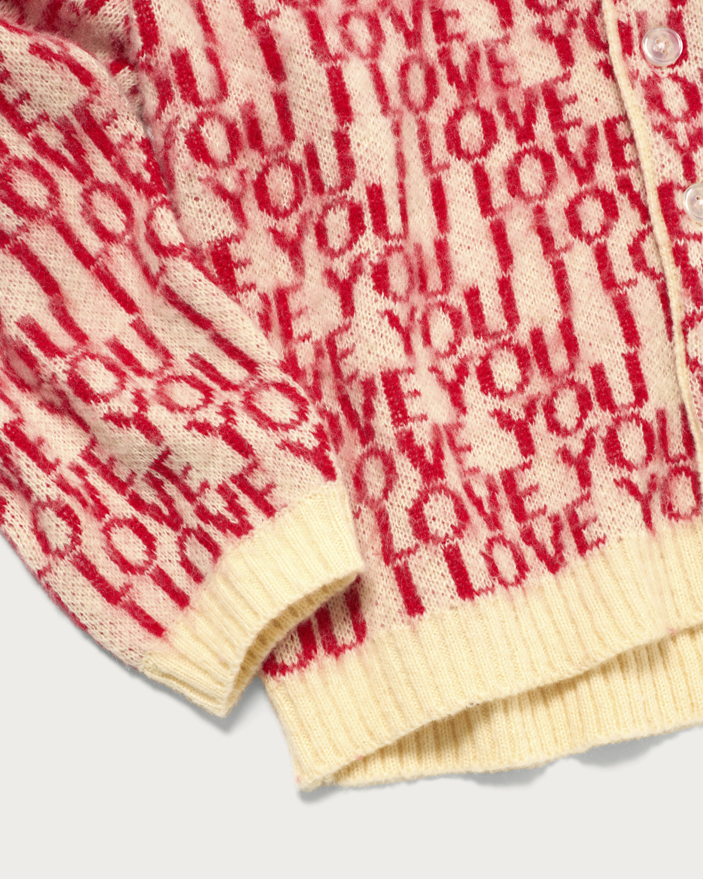 前シーズン展開をしていたシルエットをベースにした、シャギー加工で古着感のあるカーディガン。厚みがあり、寒い時期にも頼もしいアイテムながら、アクリル100%で取り扱いやすいのが嬉しいポイント。今シーズンは、総柄が目を引く『I LOVE YOU』のレッドと、控えめなレオパード柄を別注しました。