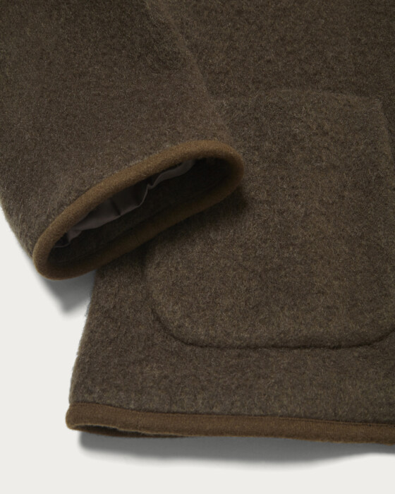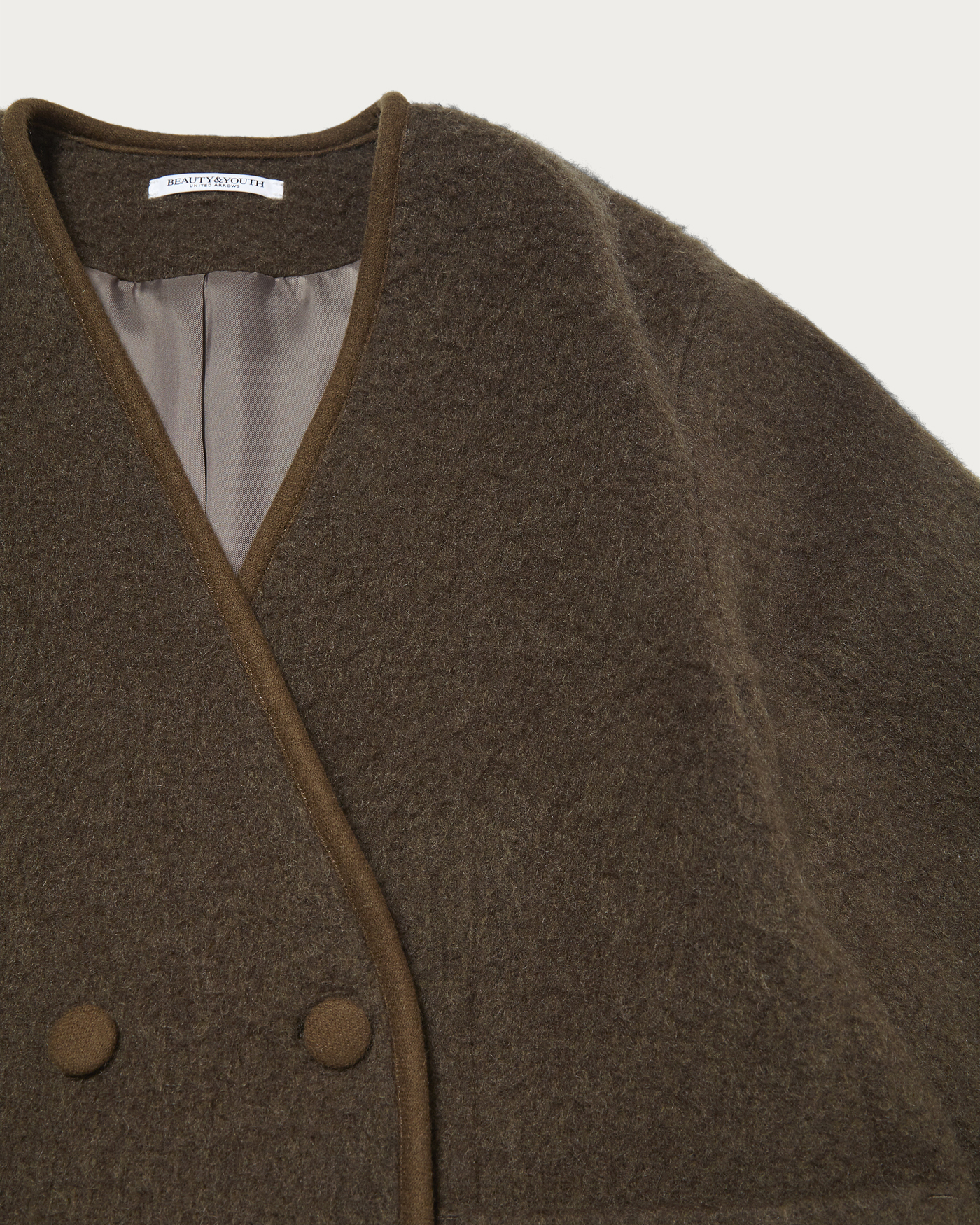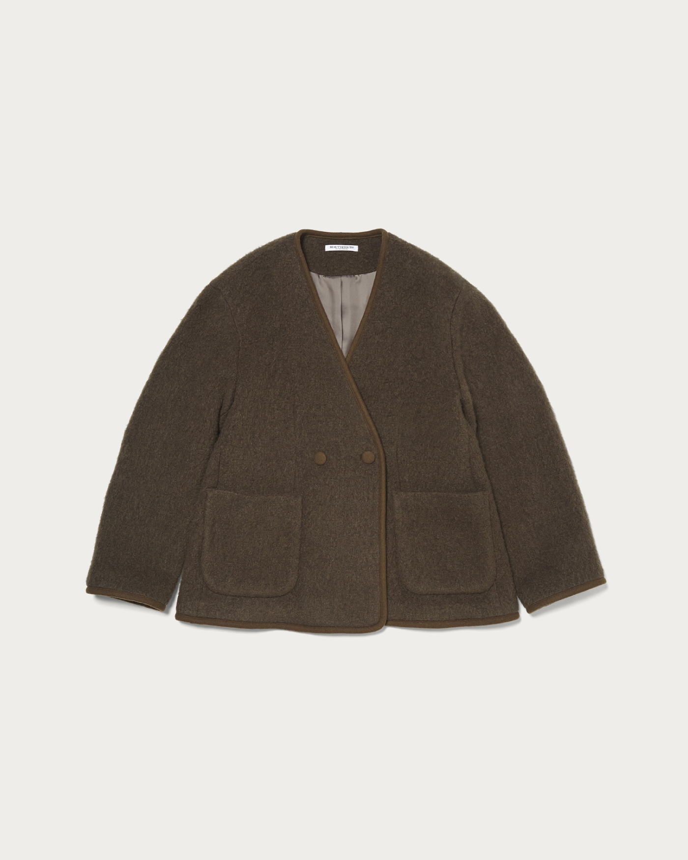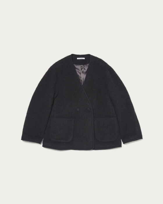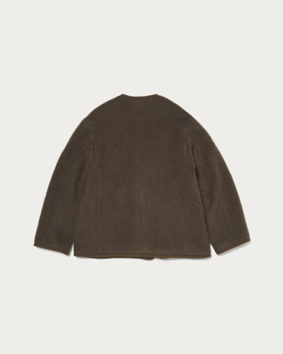 モヘヤカーディガンのような感覚で気軽に羽織れるジャケット。レイヤードしやすいノーカラー仕様にし、端のパイピングをアクセントにさらりと仕上げました。モヘヤ・ウール・ナイロンの生地に起毛加工を施し、ふわふわとした表情感や風合いを出しています。インナーはボウブラウスや、シャツ、襟付きデザインのトップスなど、首回りにポイントのあるものが好相性。