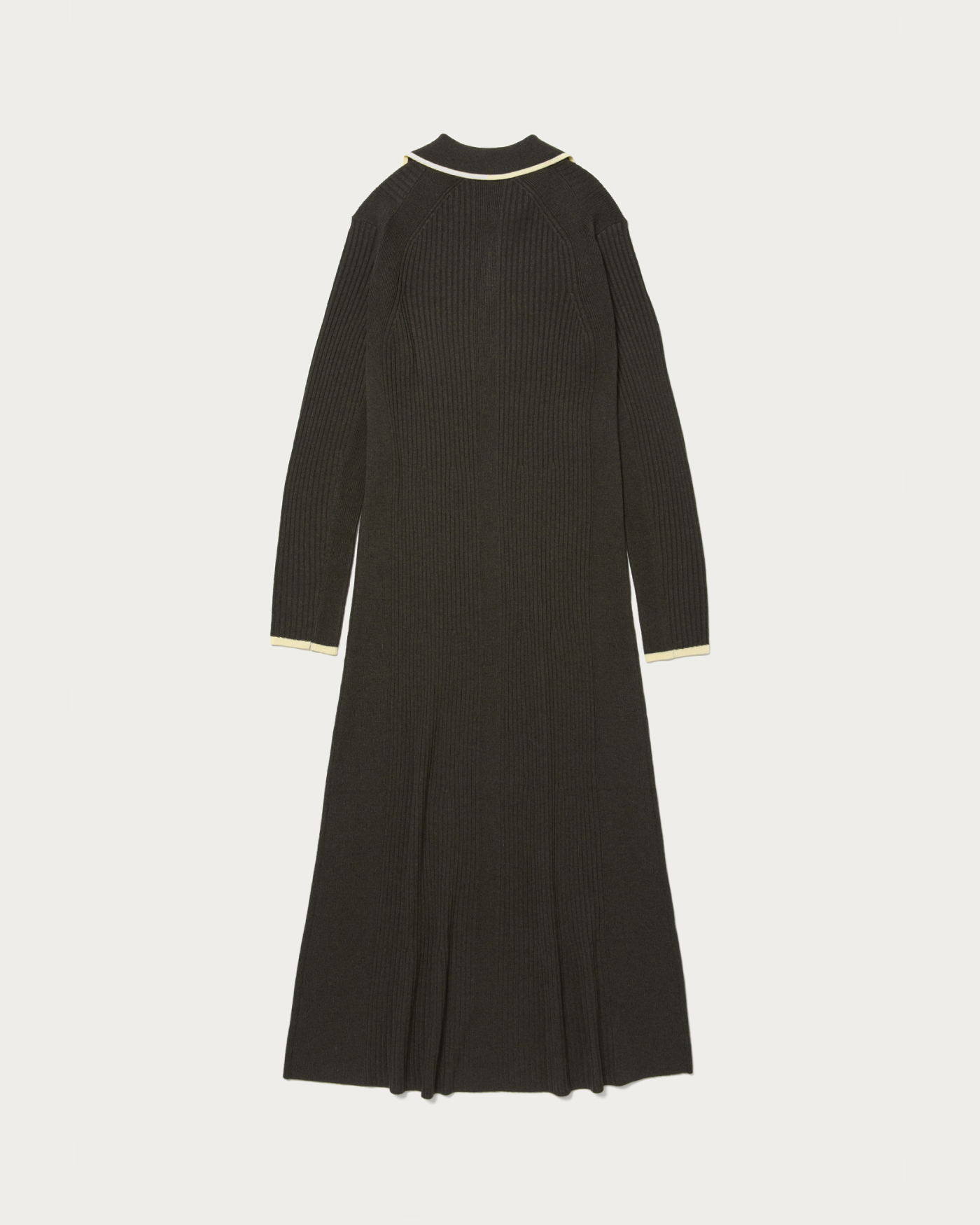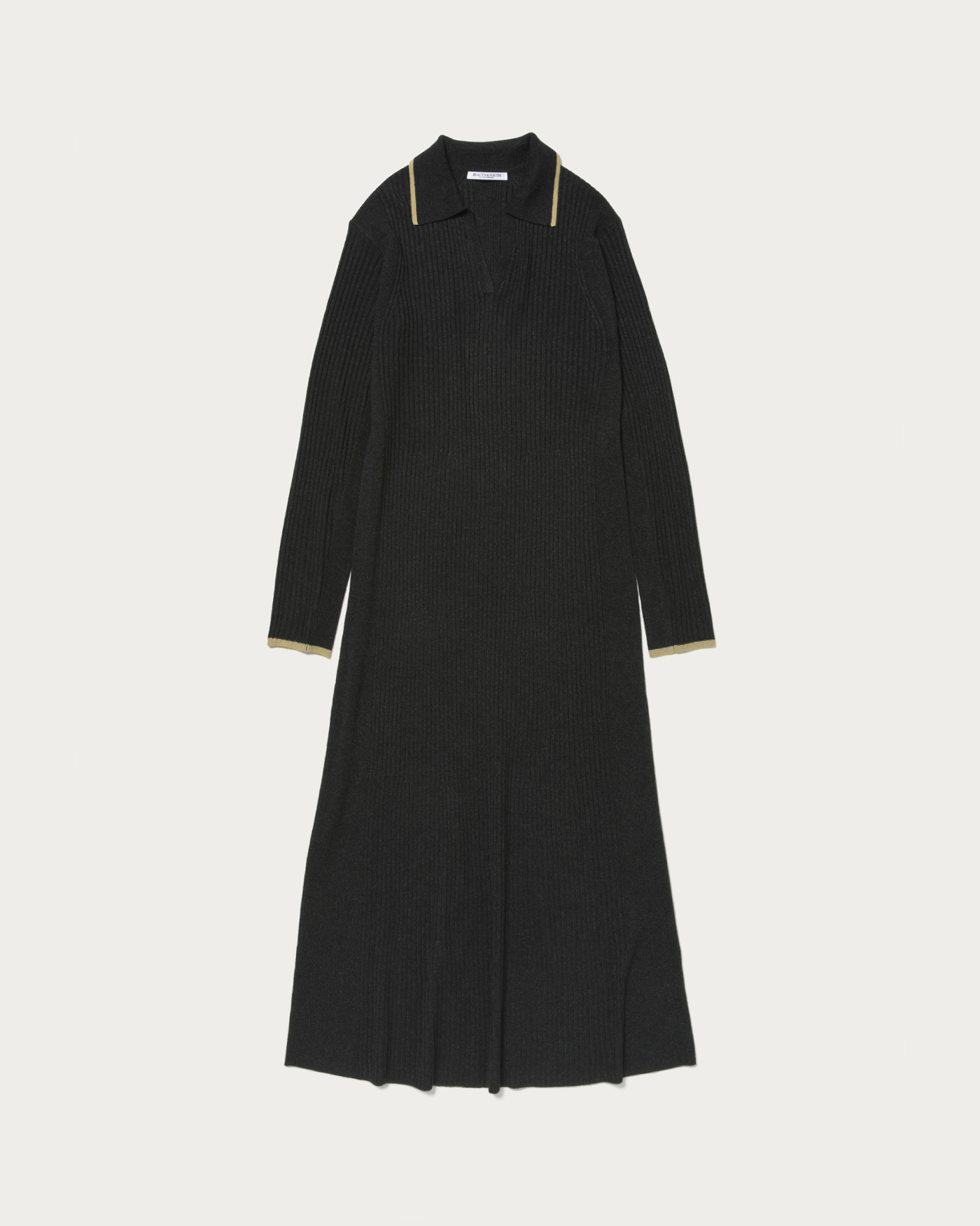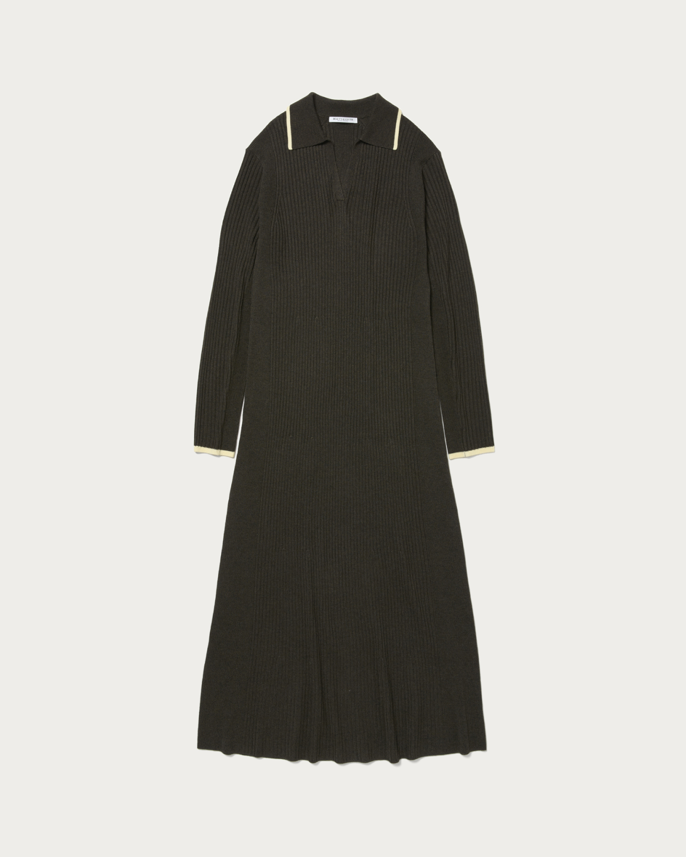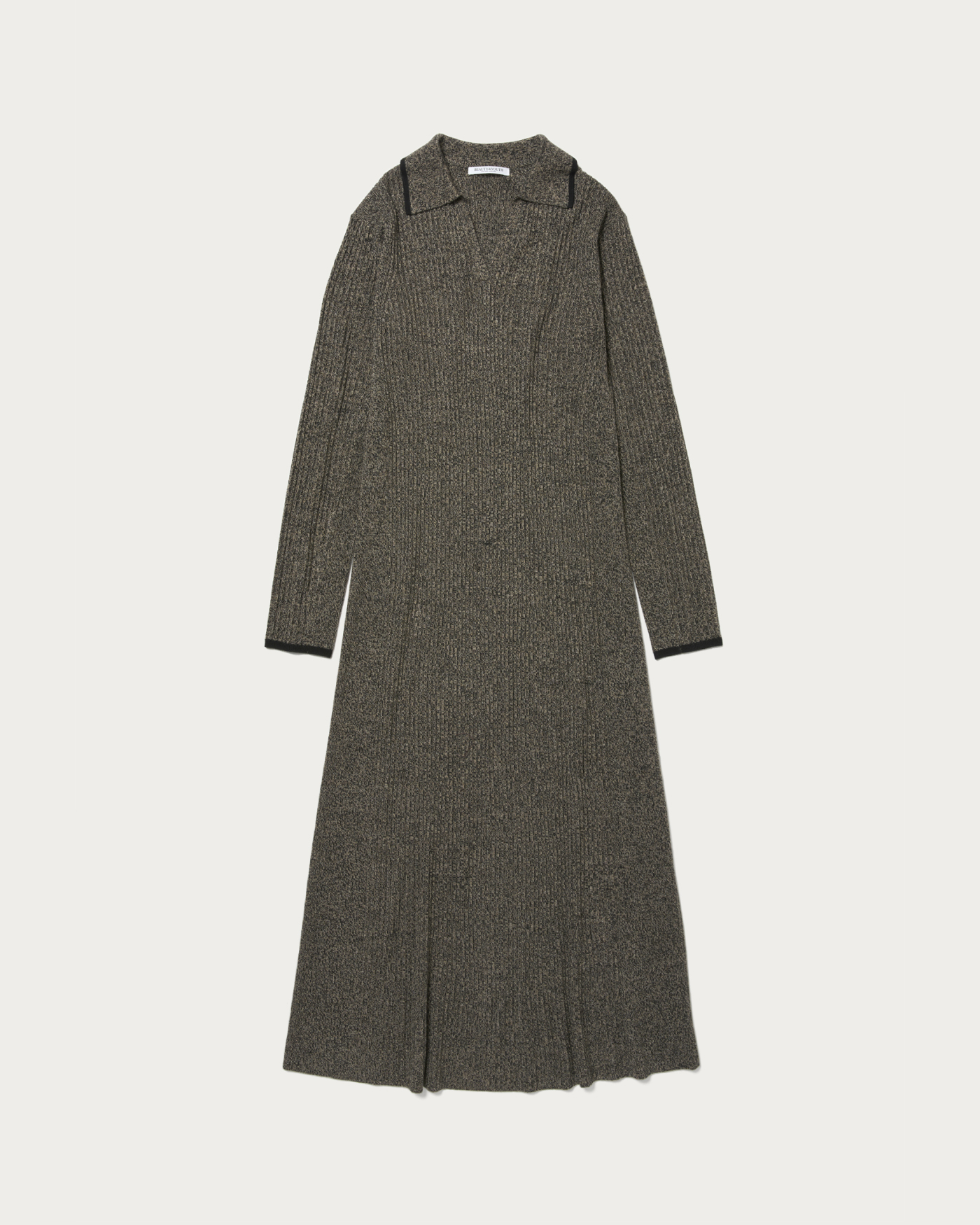 ウエストからフレアなシルエットに仕上げた、エレガントながらもカジュアルに着こなせるリブニットワンピース。ウール混でもすっきり着られる糸を二色引き揃えたリブ組織は、ランダムな色の表情が特徴。襟先と袖口の配色使いもポイントです。リバーのカバーオールといったトレンドのアウターから、カジュアルブルゾンまでさまざまなアウターとも相性の良い一枚。