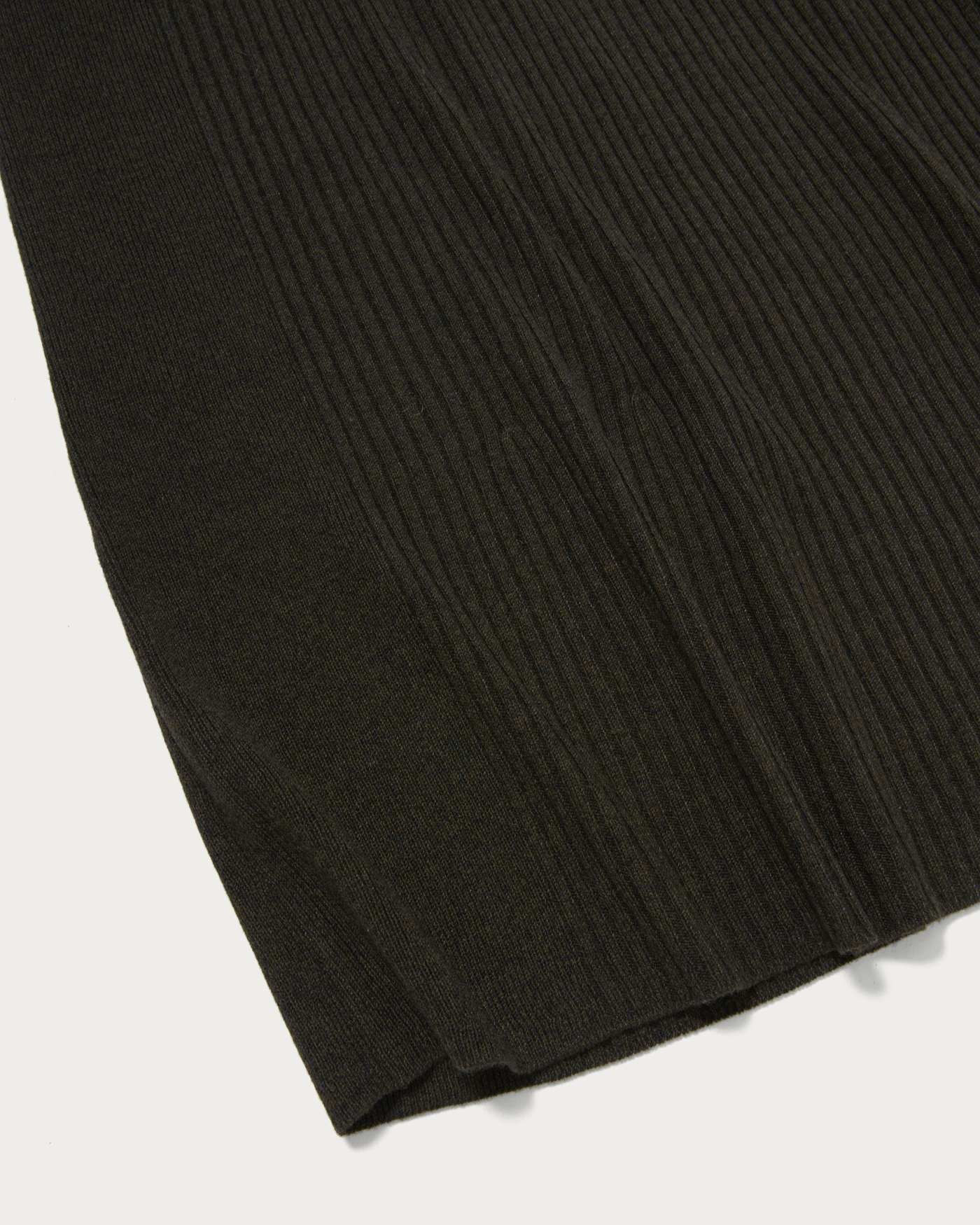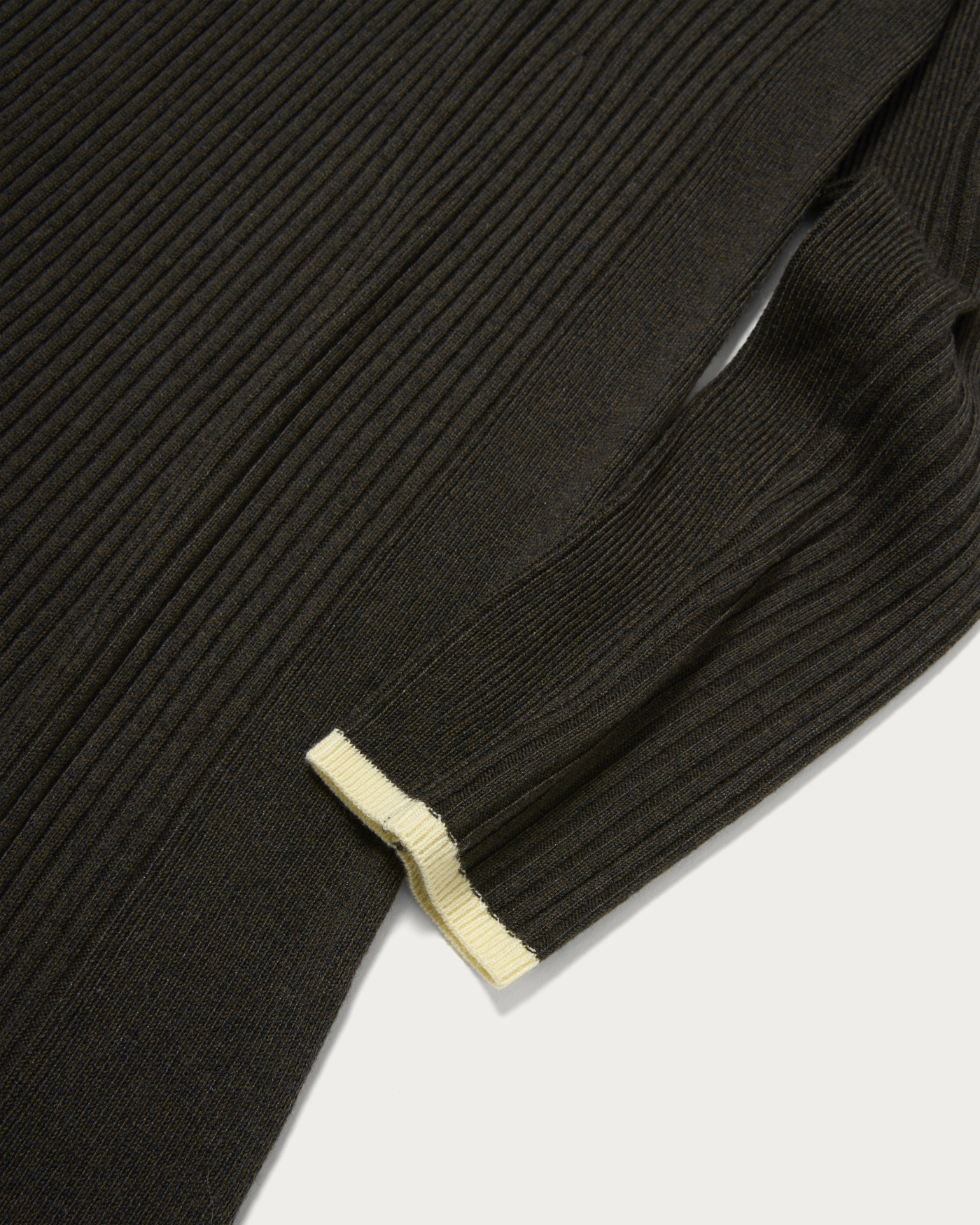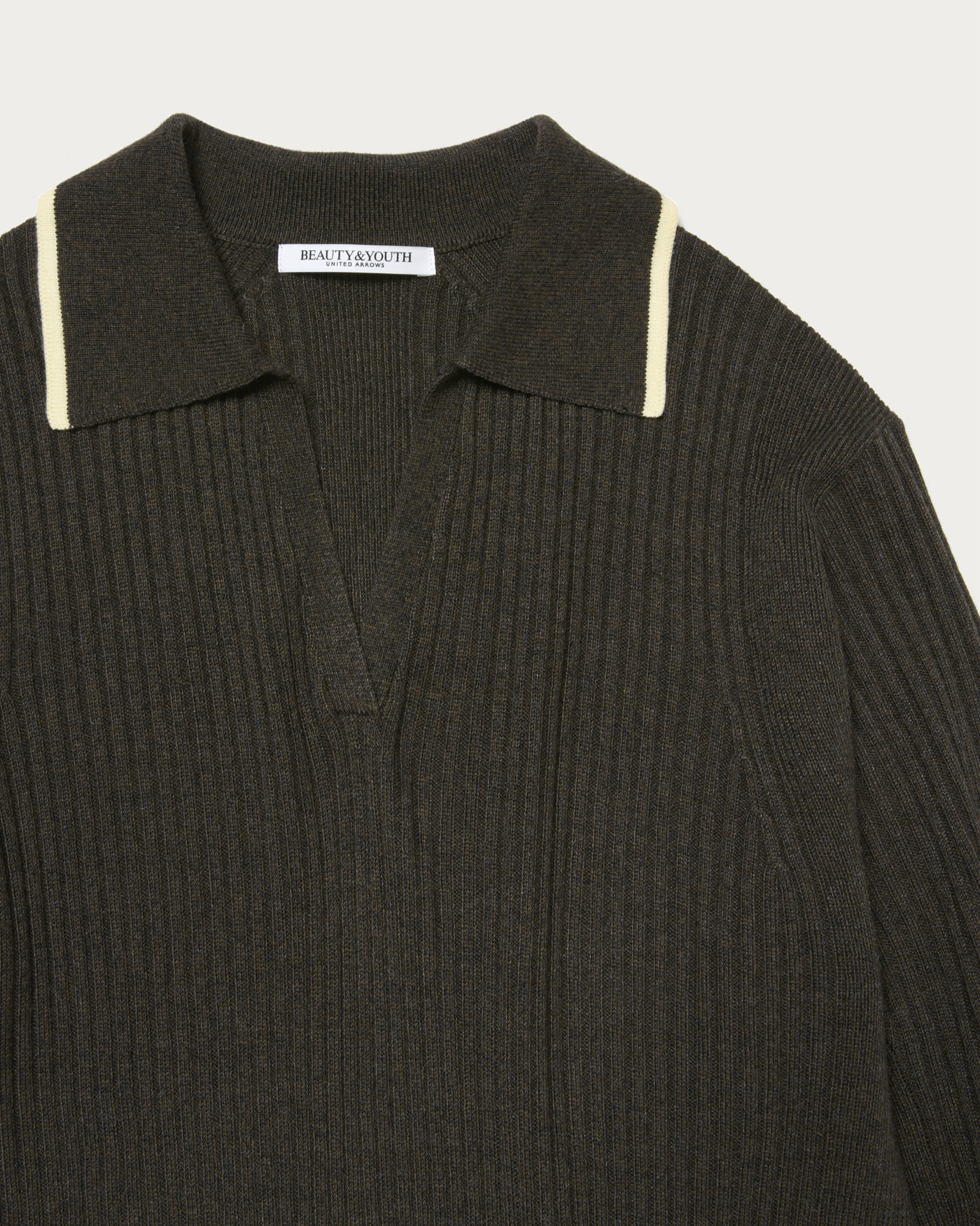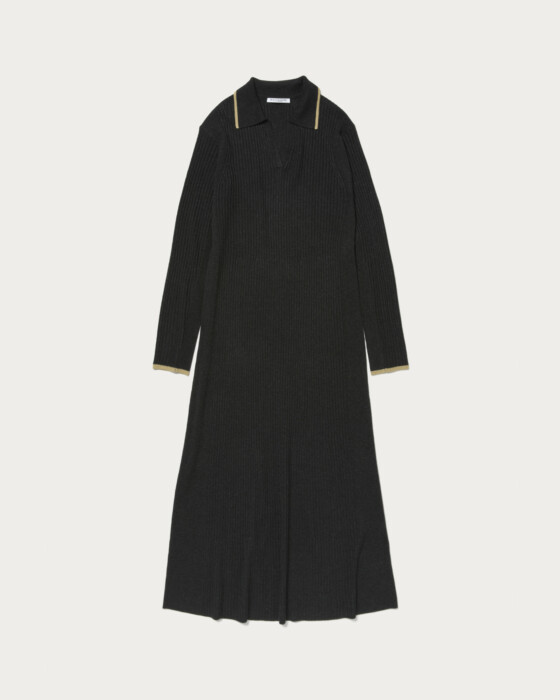 ウエストからフレアなシルエットに仕上げた、エレガントながらもカジュアルに着こなせるリブニットワンピース。ウール混でもすっきり着られる糸を二色引き揃えたリブ組織は、ランダムな色の表情が特徴。襟先と袖口の配色使いもポイントです。リバーのカバーオールといったトレンドのアウターから、カジュアルブルゾンまでさまざまなアウターとも相性の良い一枚。