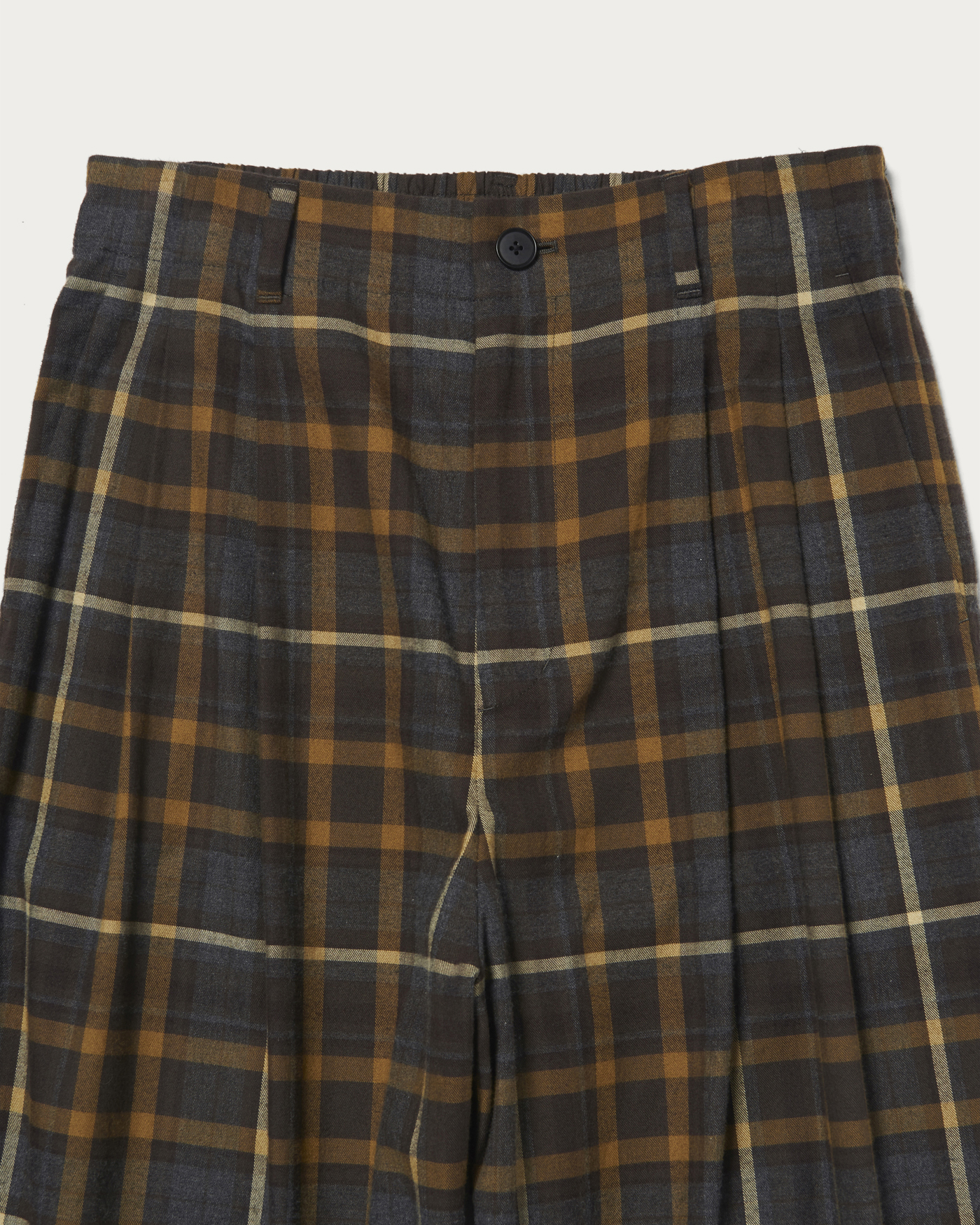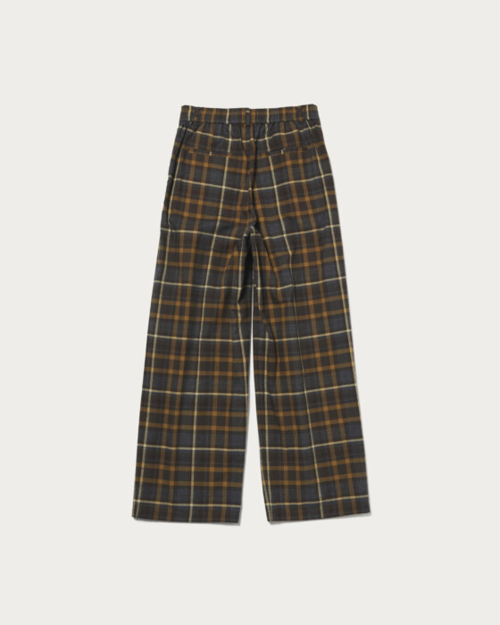秋冬のコーディネートを盛り上げてくれる、フランネルチェック素材のバックゴムパンツ。ストレスフリーな履き心地ながらもパジャマ感が出ないよう、フロントにはゴムを入れずにタックをあしらいました。この一本でスタイリングが決まる万能なボトムです。