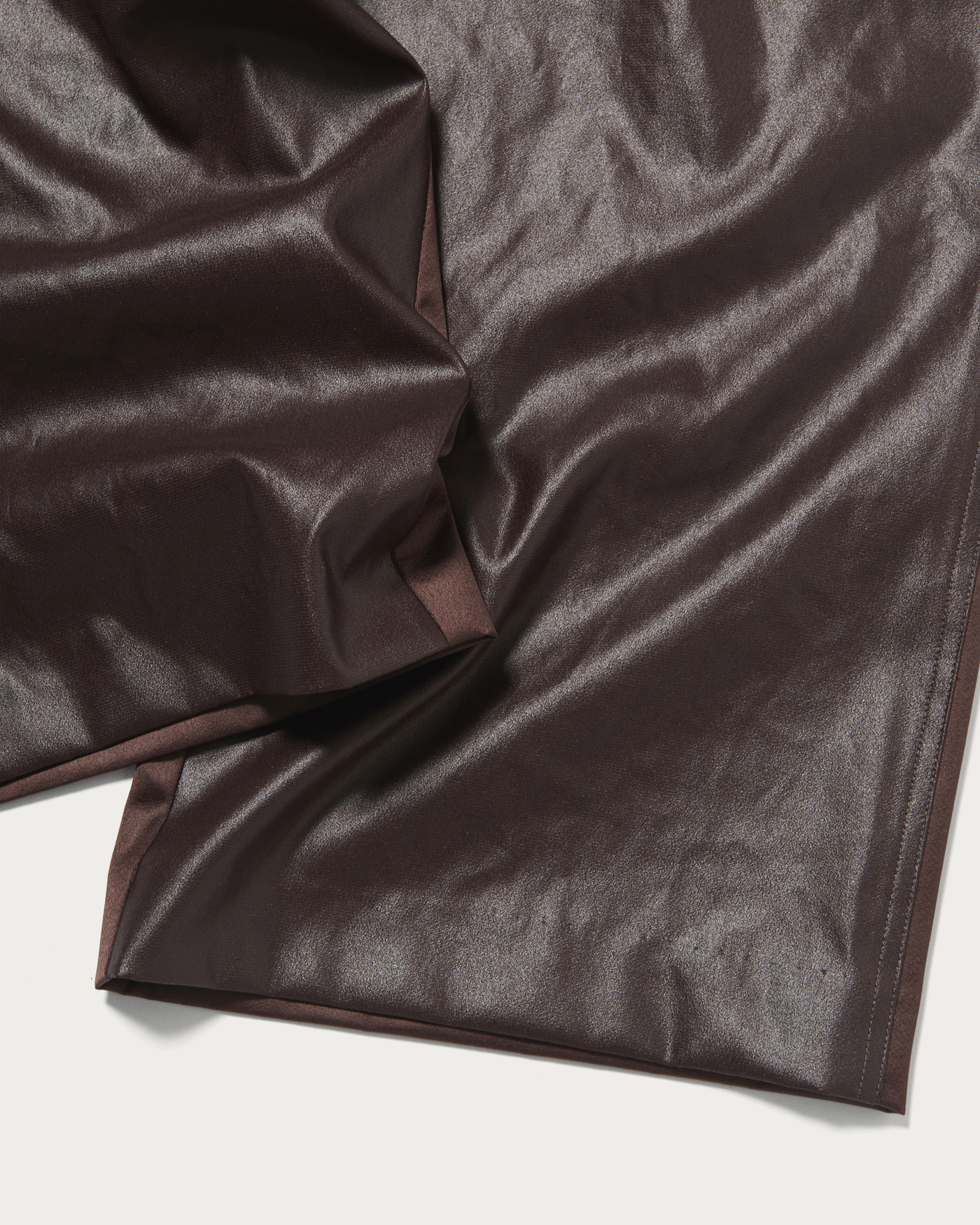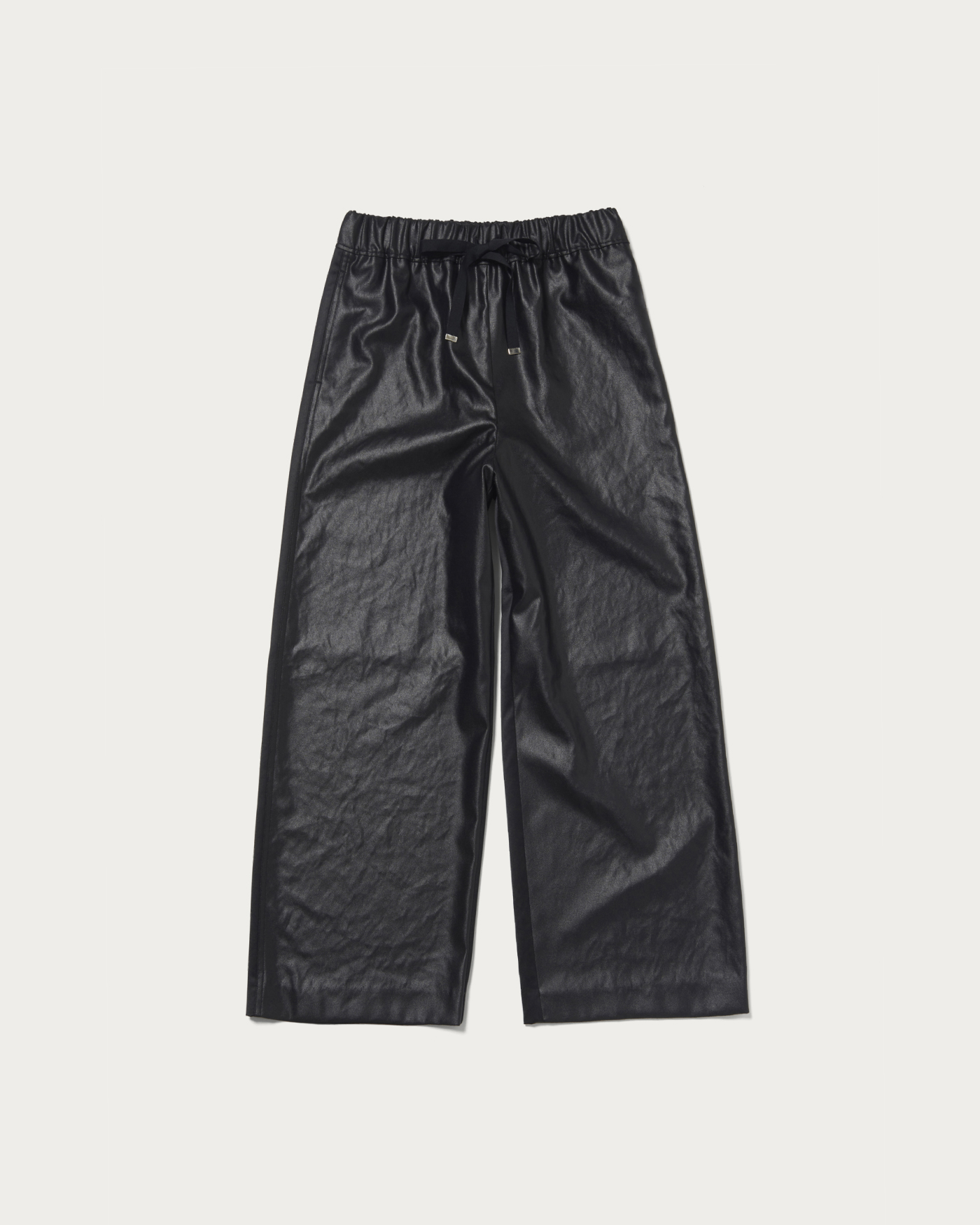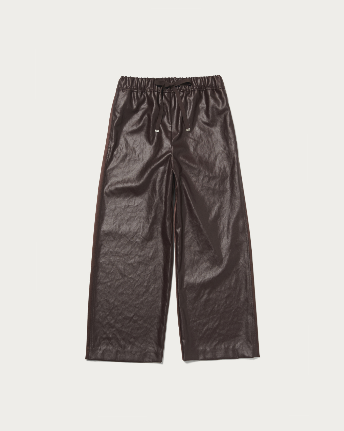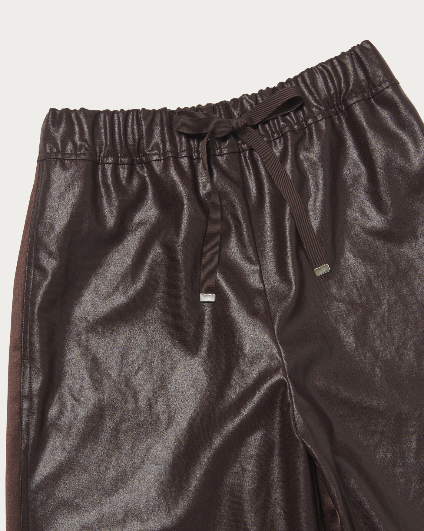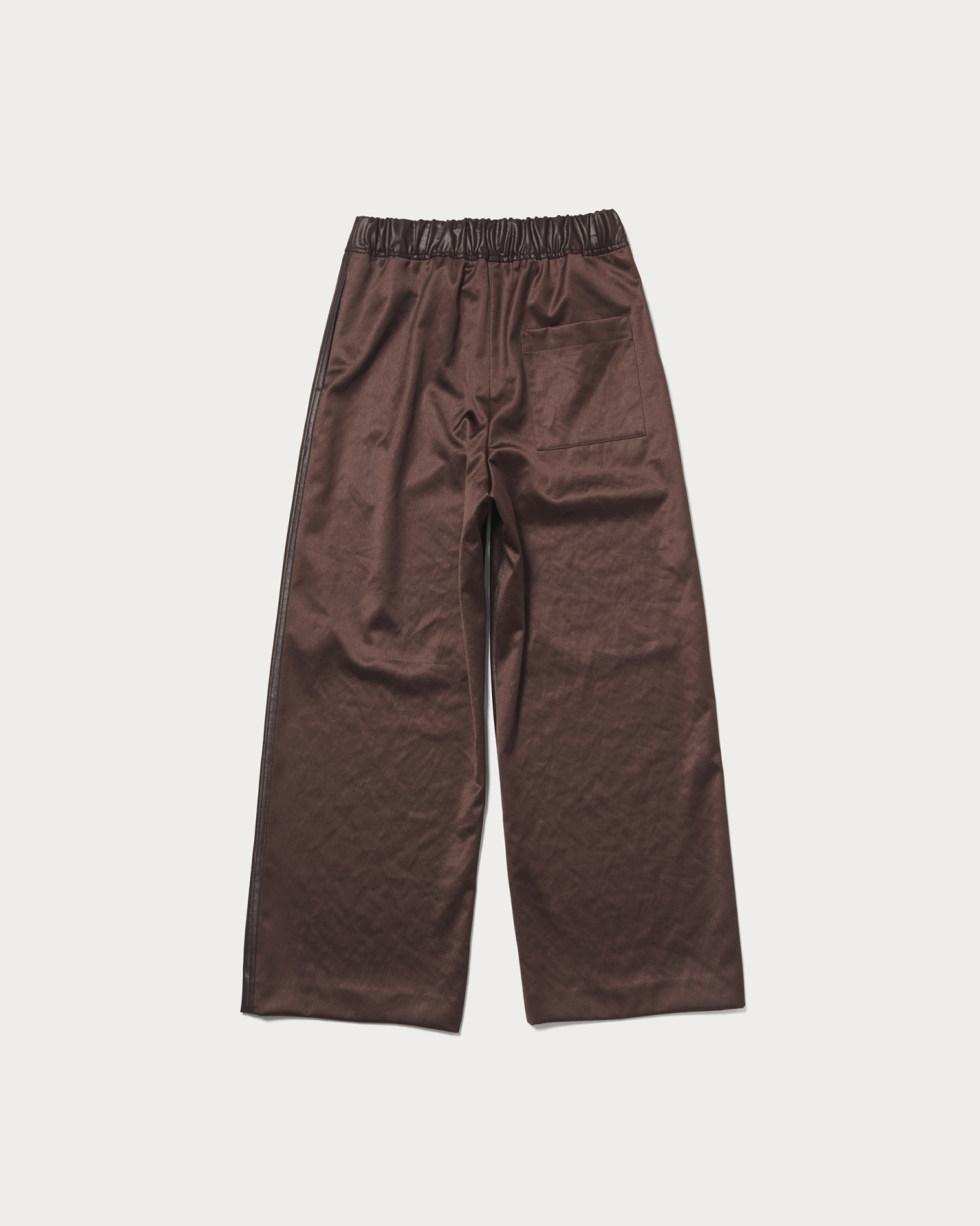 前身頃と後ろ身頃で素材の質感を変化させた、2トーンデザインのイージーパンツ。同じ素材を使用し、前身は表使い、後身は裏使いにしています。ベルト幅を太めに設定したドローストリング仕様で、紐端の平たいエンドがアクセント。ラクーン混のダブルポケットカーディガン合わせなど、リラックスしたカジュアルなコーディネートがおすすめです。