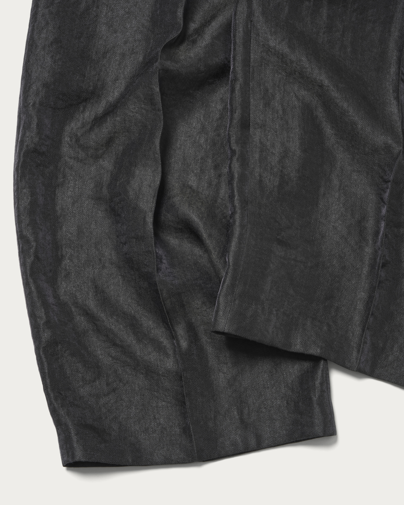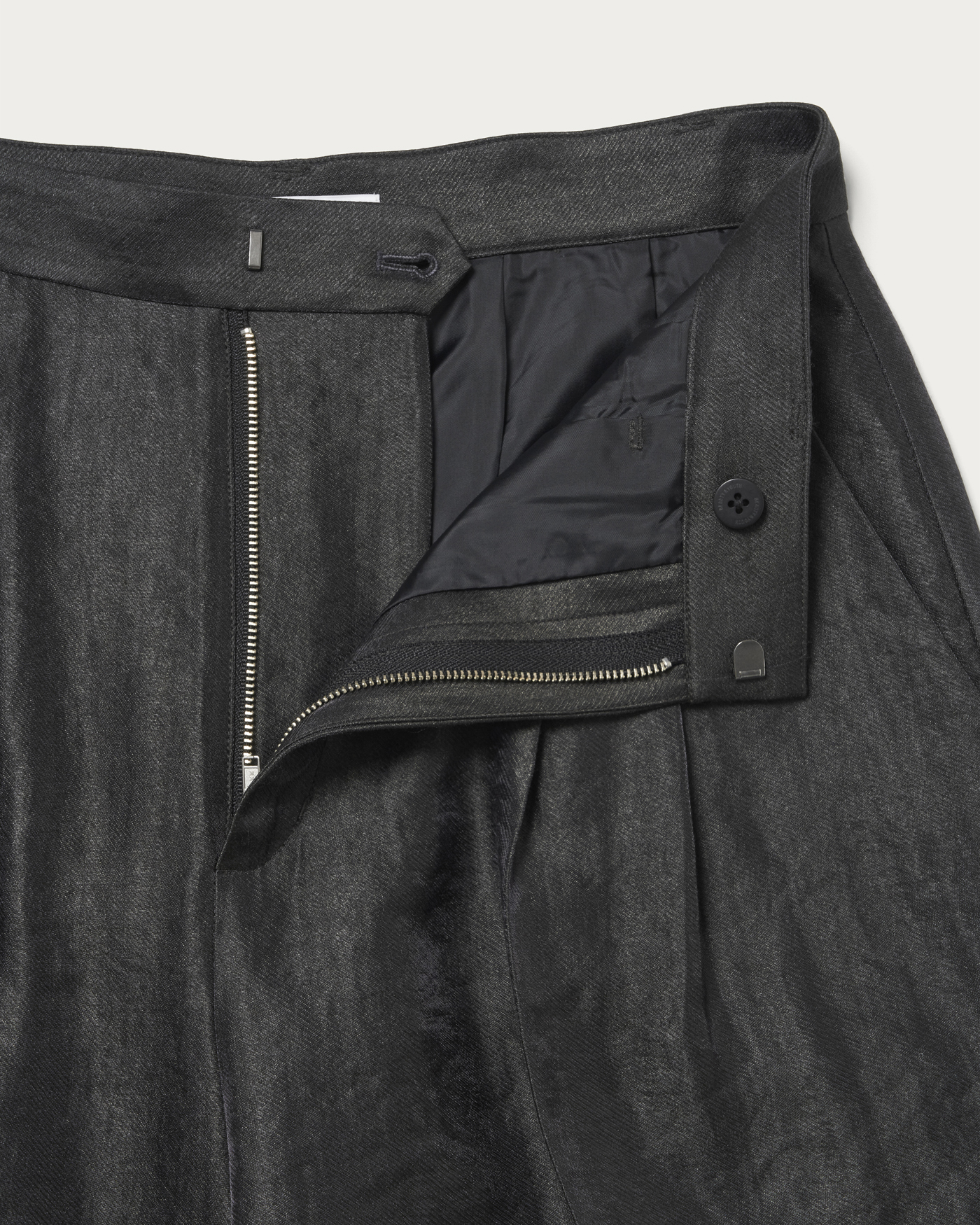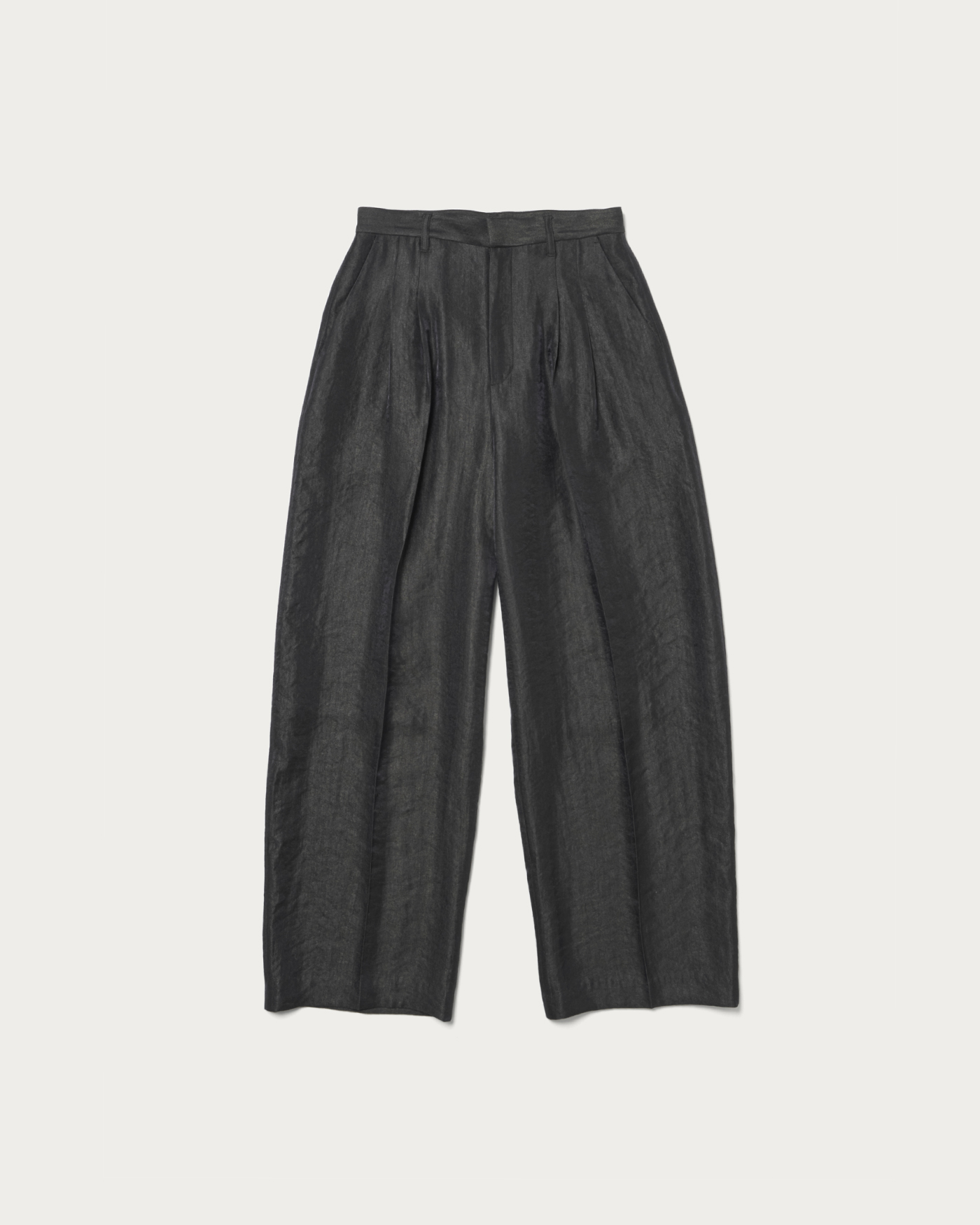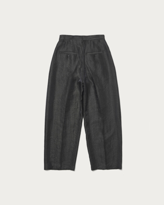 丸みのあるカーヴィシルエットのトラウザーズ。メタリックなシャイニー感ある素材には程よい肉感とハリ感があり、キレイなフォルムをキープできるのがポイントです。冬らしい温かみのあるニットとのスタイリングで、素材のコントラストをお楽しみください。