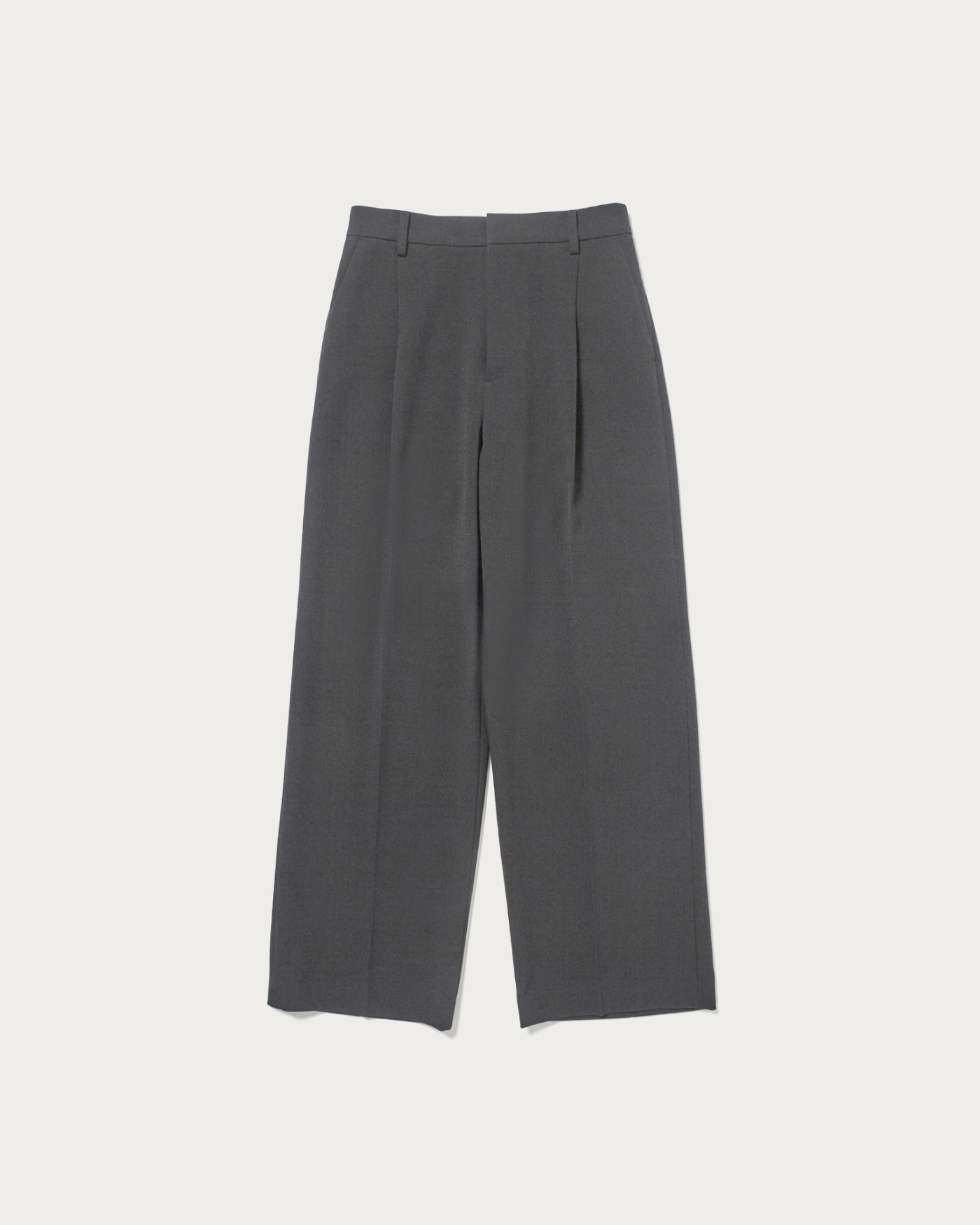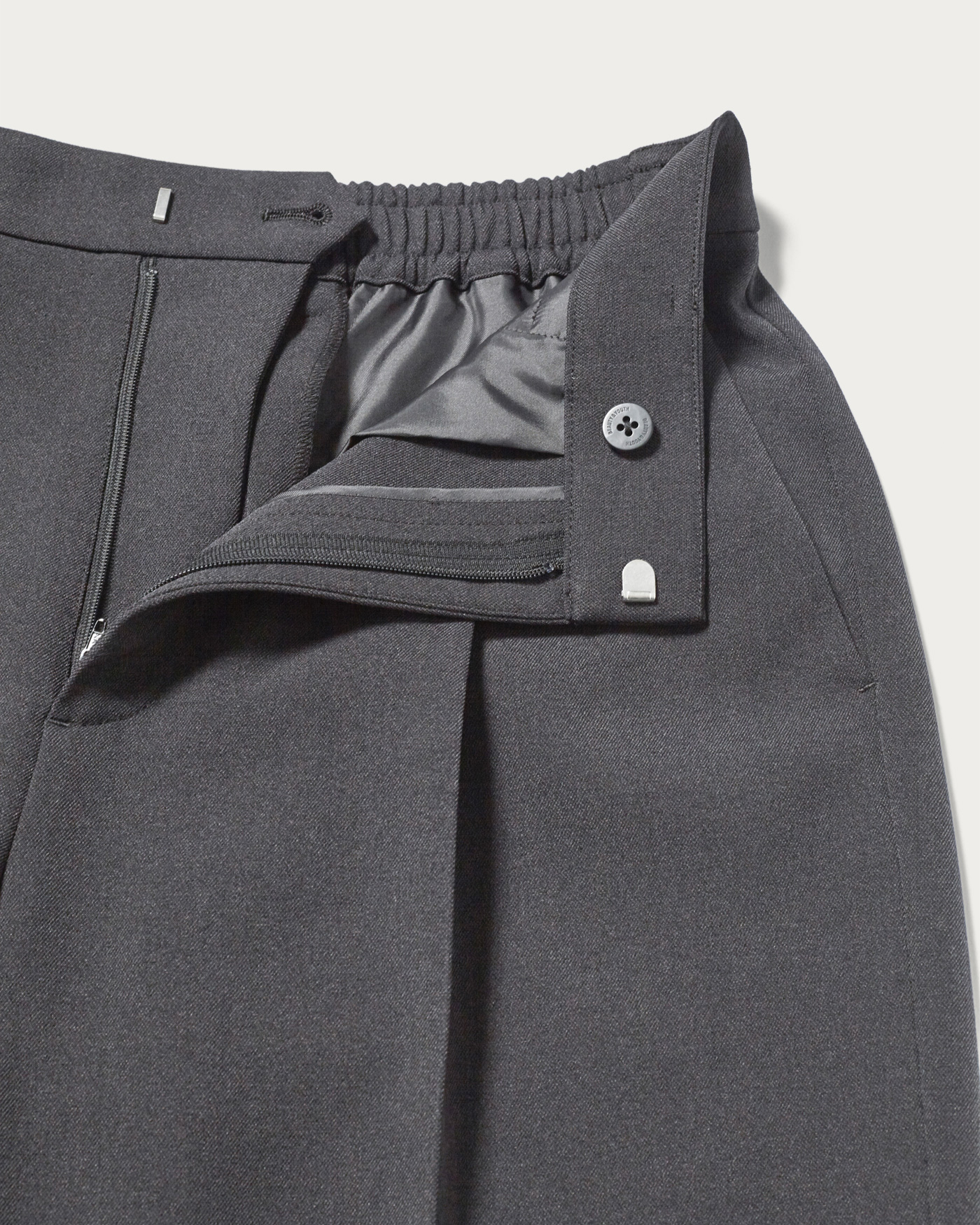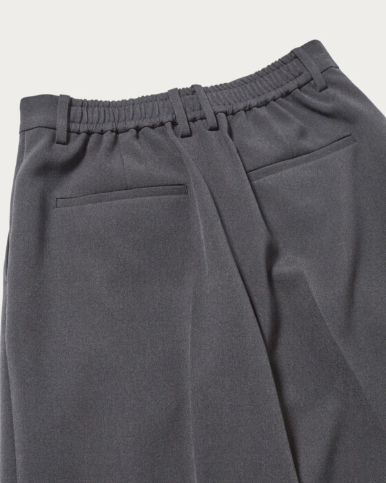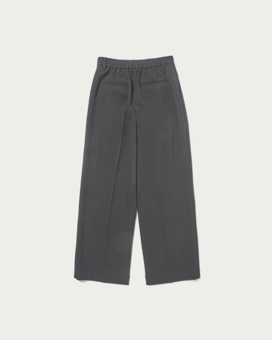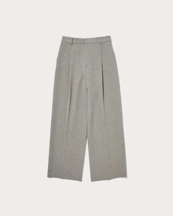 25SSではリネンライクな素材でお作りしたパンツを、今シーズンは梳毛調のポリエステル糸を使用した、クリアで秋冬らしい素材にアップデート。数種類の糸を撚糸することで、奥行きのある色みを表現しました。ポリウレタン混のため、素材にふくらみとほどよい伸びもあり、履き心地も抜群です。