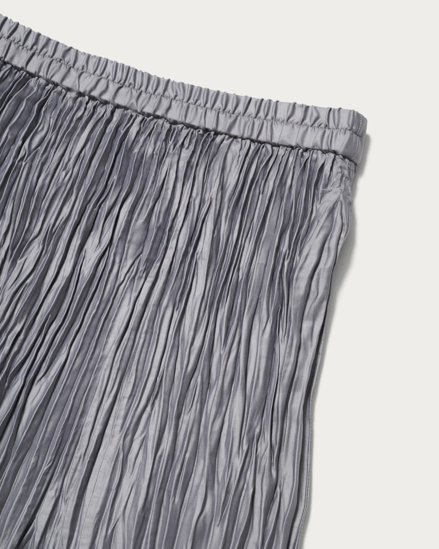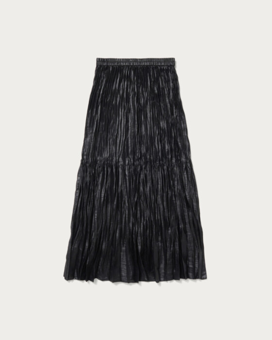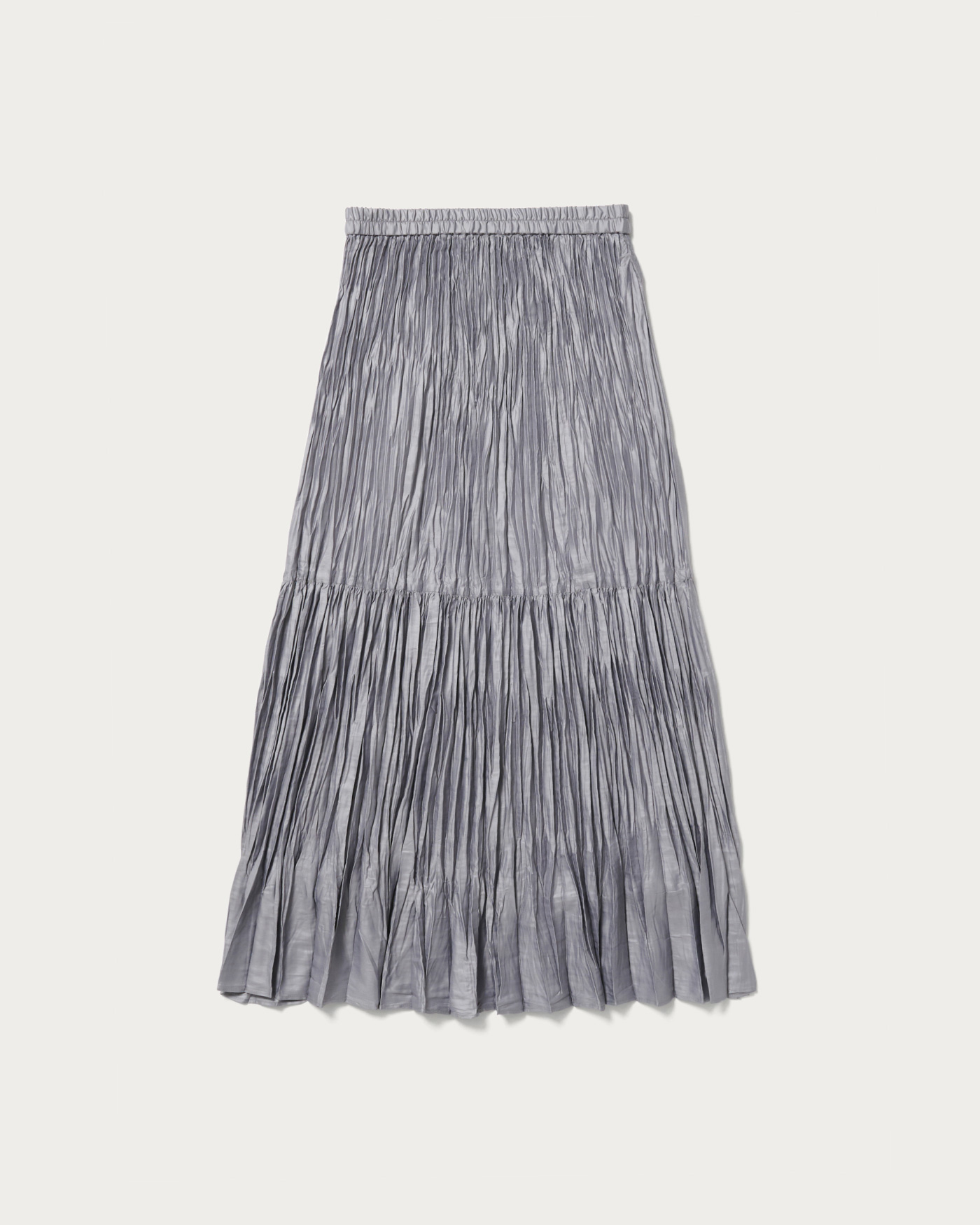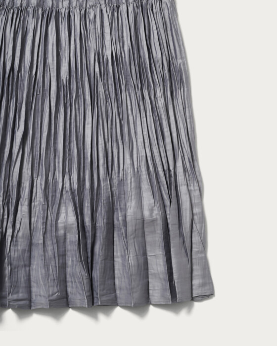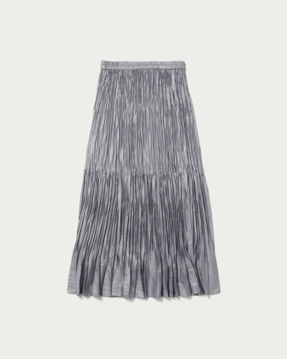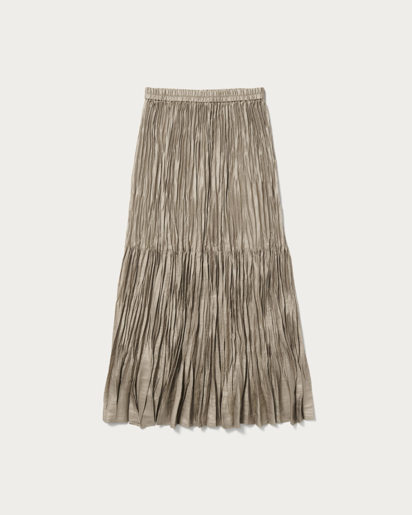 上品な光沢感が印象的なタフタ素材のランダムプリーツスカート。裾の分量を抑えたことで、カジュアルな着こなしに取り入れやすいデザインに仕上げました。ウエストゴムのはき心地の良さもデイリーに嬉しいポイント。ウールコートを合わせて素材のコントラストを楽しんだり、足元にはブーツを合わせたり、秋冬ならではのコーディネートをぜひ。ベージュカラーが新色です。
