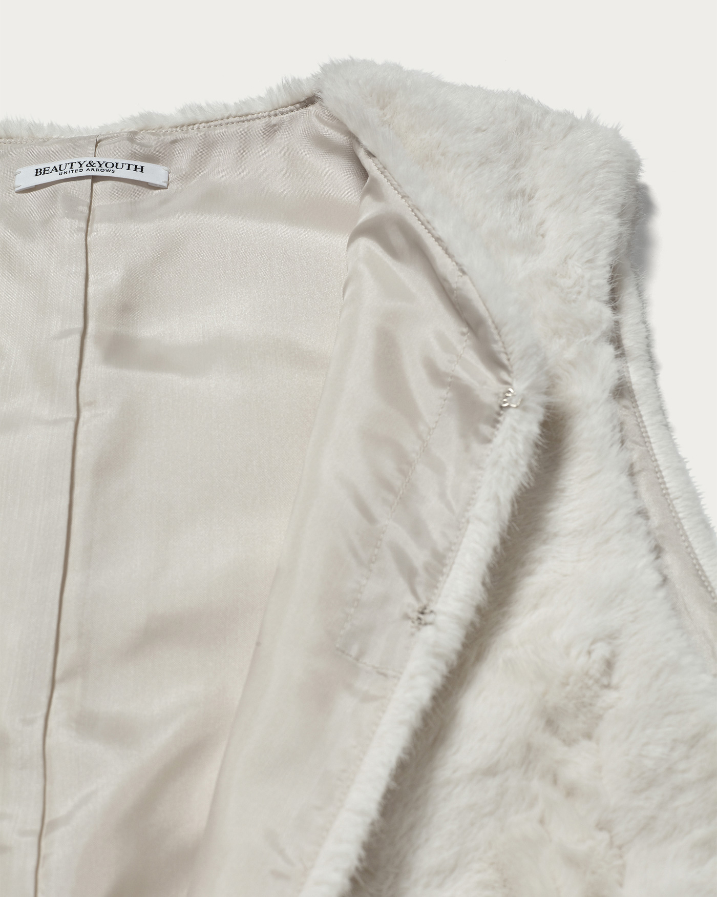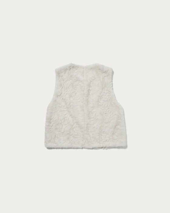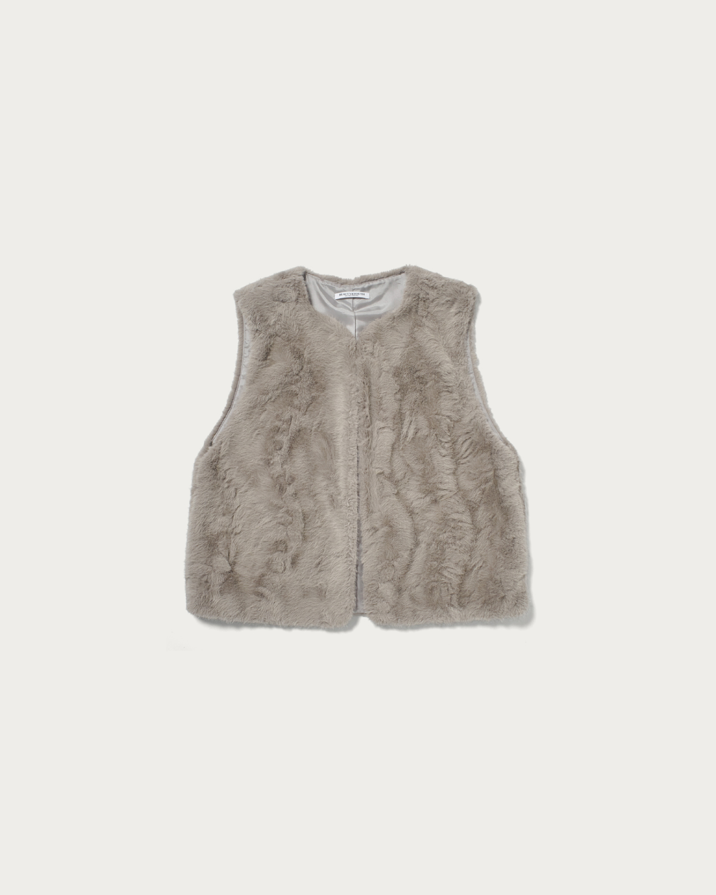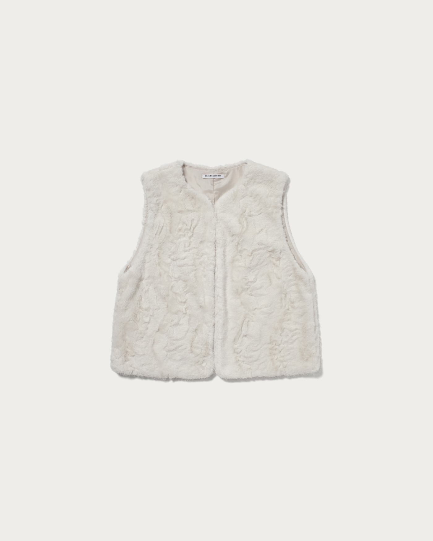 昨シーズンもご好評いただいた、シーズンムードを高めてくれるふわふわのフェイクファーベスト。今回は少しうねったような柄感のあるポリエステル素材を使用し、形はシンプルにゆったりと羽織れるシルエットに仕上げています。オーバーサイズのフットボールTなどにレイヤードした、カジュアルに落とし込んだスタイリングがおすすめです。