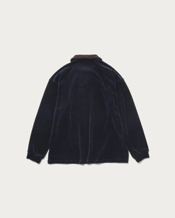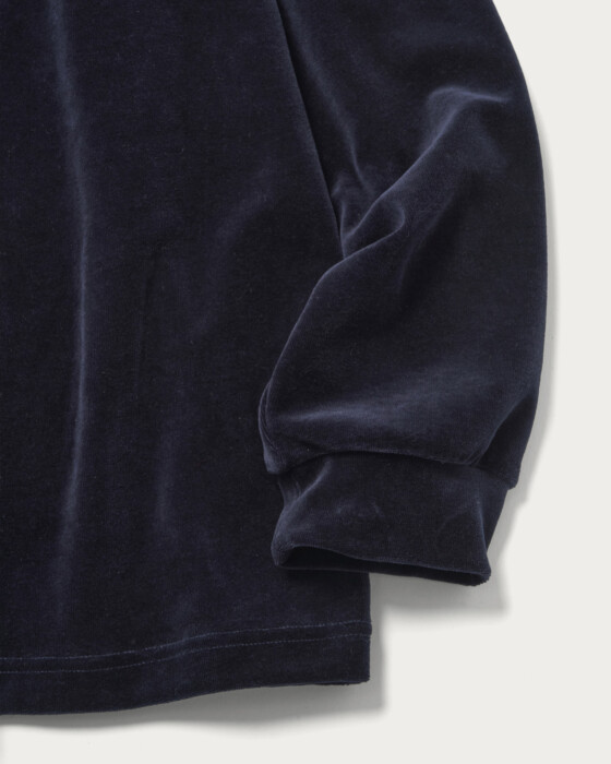 オーガニックコットン100%の中肉ベロアジャージのスキッパーシャツ。ベロアならではの微光沢感と滑らかな起毛が心地良い素材。ファッション感とリラックス感を両立させたほど良くゆとりのあるシルエット、一枚着としてもおすすめのアイテムです。左胸に配したショップロゴの刺繍もワンポイントになっています。ユニセックスで着用いただけて一枚着からインナー使いまで活躍するアイテムです。