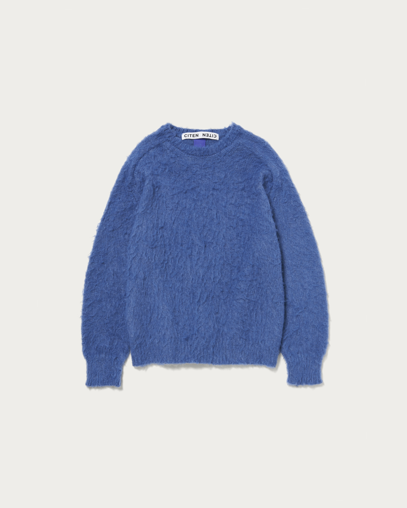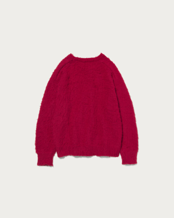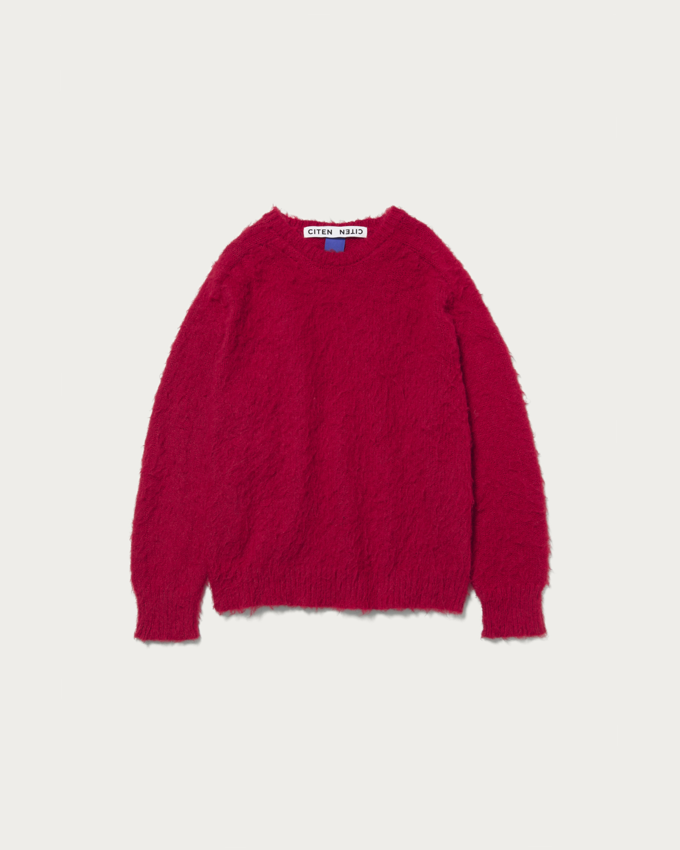 カラーにインパクトがあるデイリーユースにぴったりのニットです。起毛の加工をしてフワフワのシャギーニットに仕上げました。ほど良くルーズなシルエットで何にでも合わせやすいサイズ感です。脇に入ったスリットと変形ラグランの切り替えもデザインポイント。