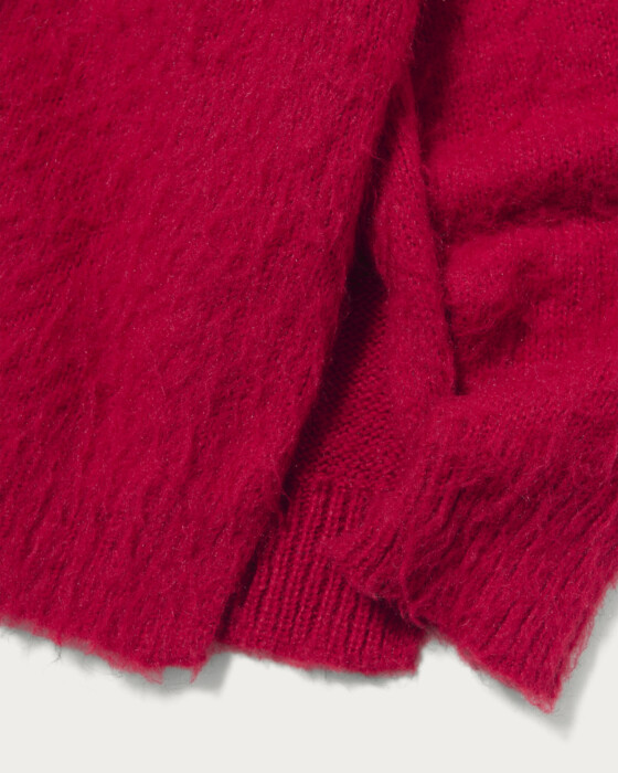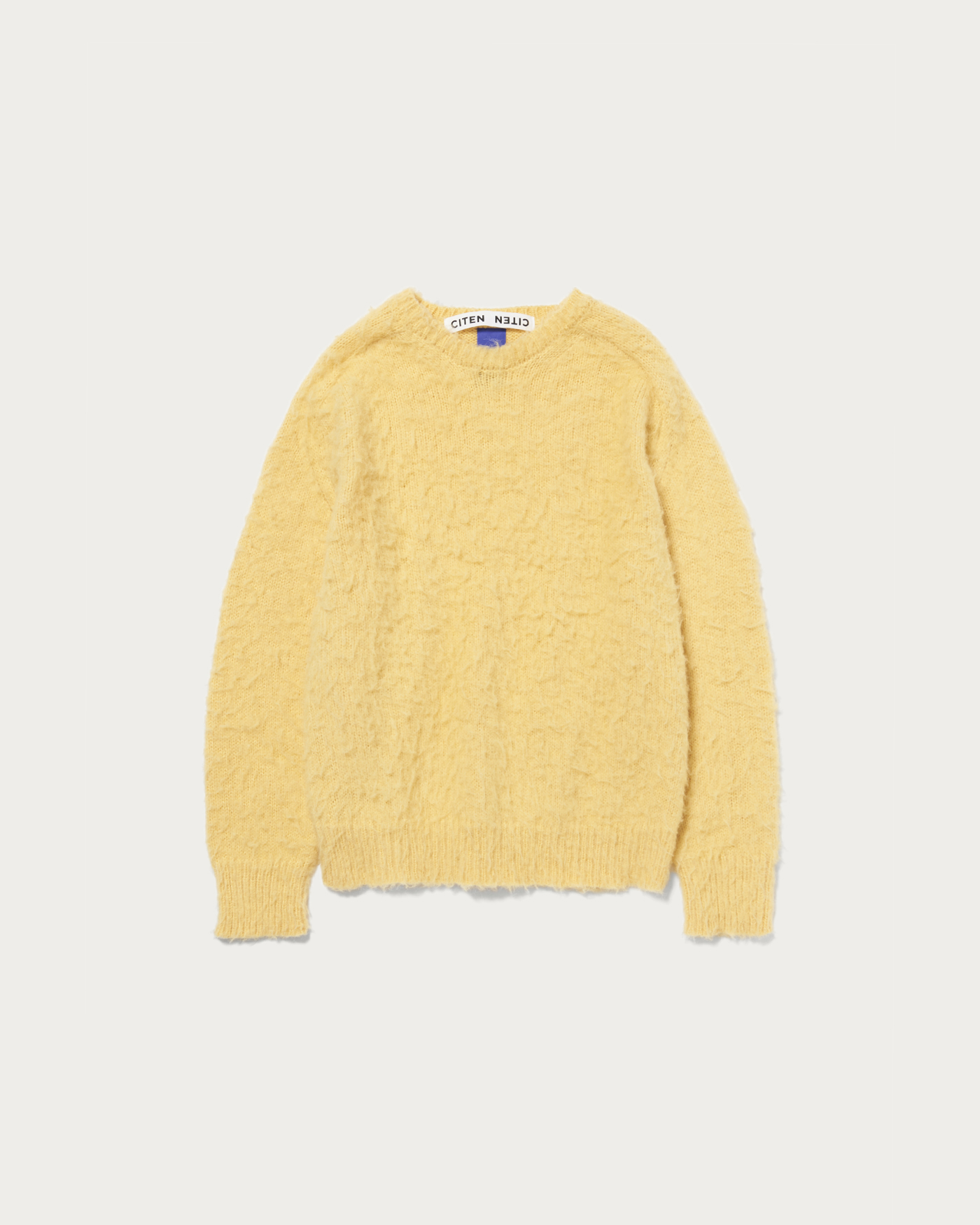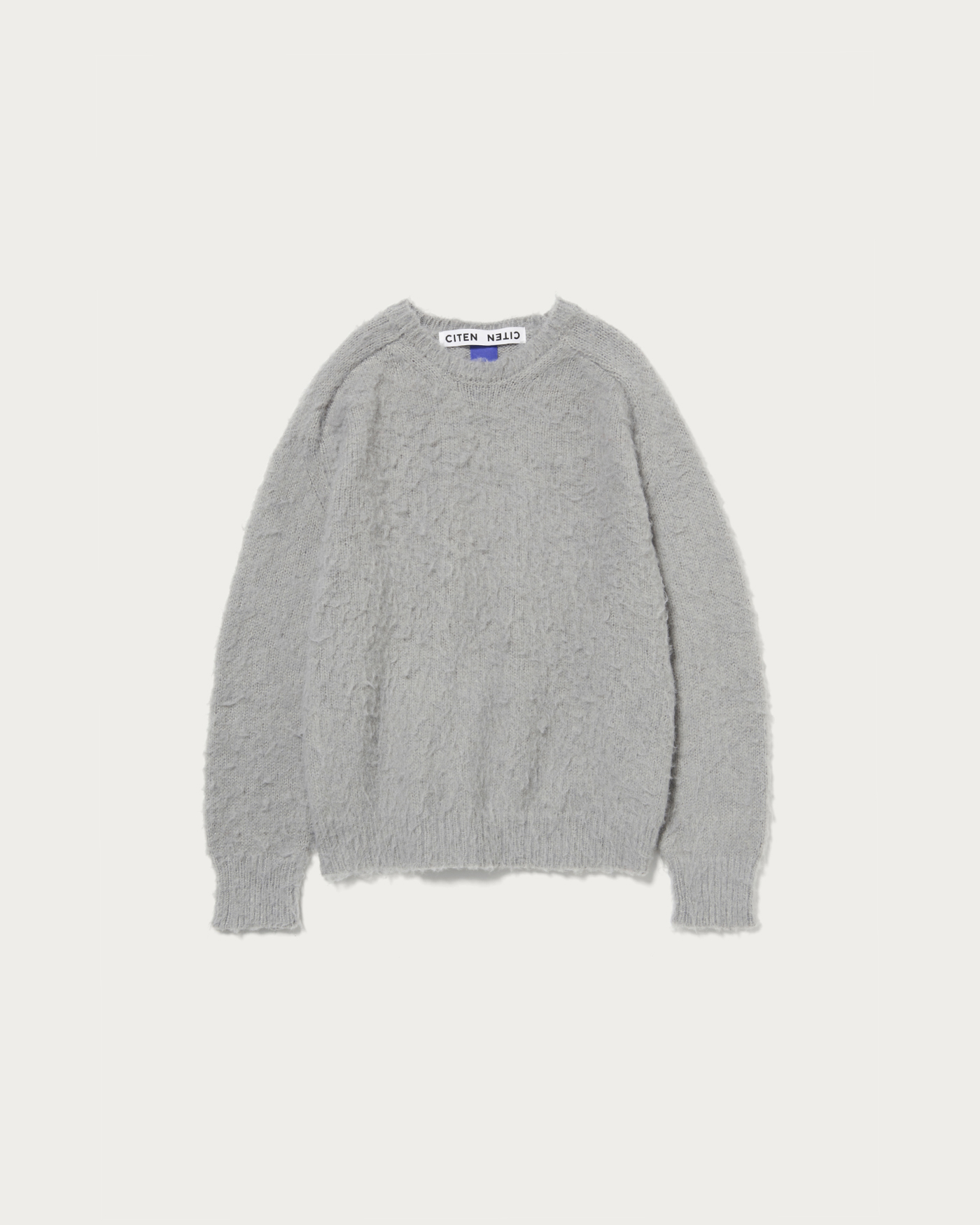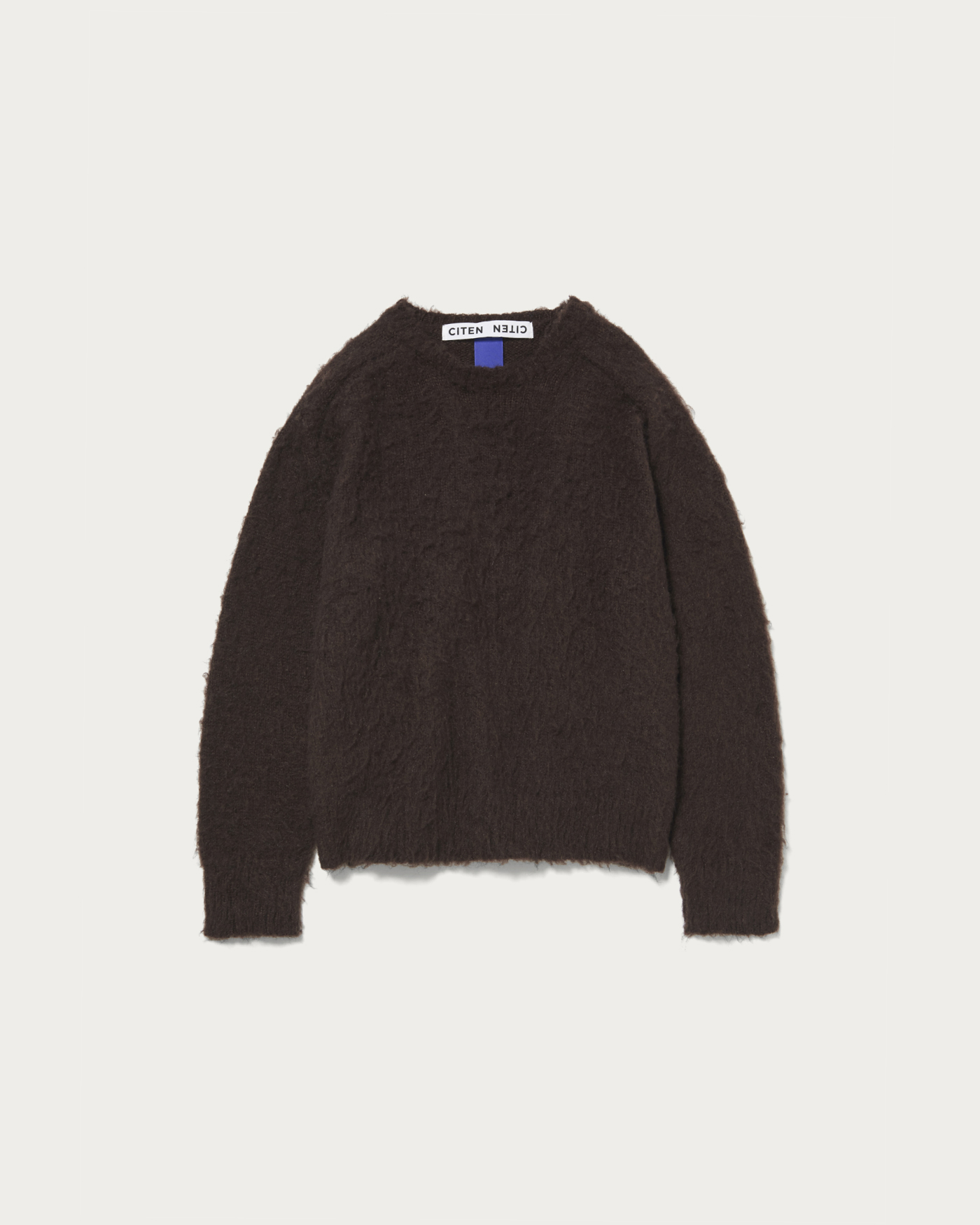 カラーにインパクトがあるデイリーユースにぴったりのニットです。起毛の加工をしてフワフワのシャギーニットに仕上げました。ほど良くルーズなシルエットで何にでも合わせやすいサイズ感です。脇に入ったスリットと変形ラグランの切り替えもデザインポイント。