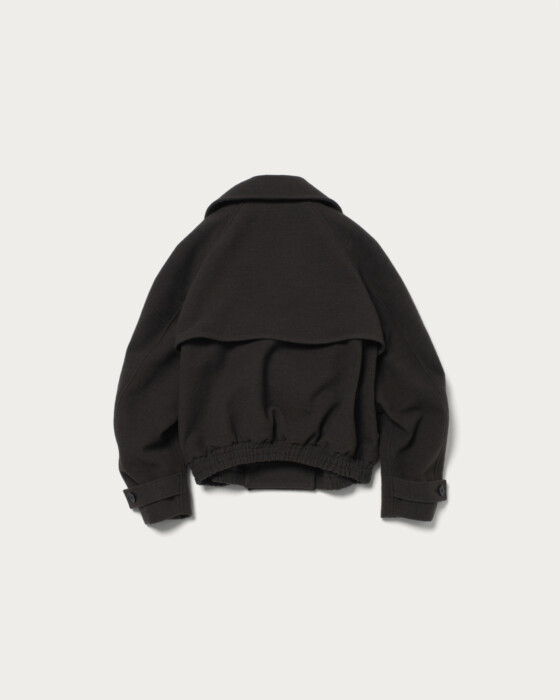 大きめのラペルやシルエットにこだわったトレンチコート風ブルゾン。切り替えによる構築的な袖のフォルムとバックスタイルのヨークデザインもポイントです。袖巾を広めに設計しているので、インナーにボリュームあるニットやスウェットも着用可能。程よいカジュアル感と品の良さをあわせ持ち、様々なスタイルにマッチします。