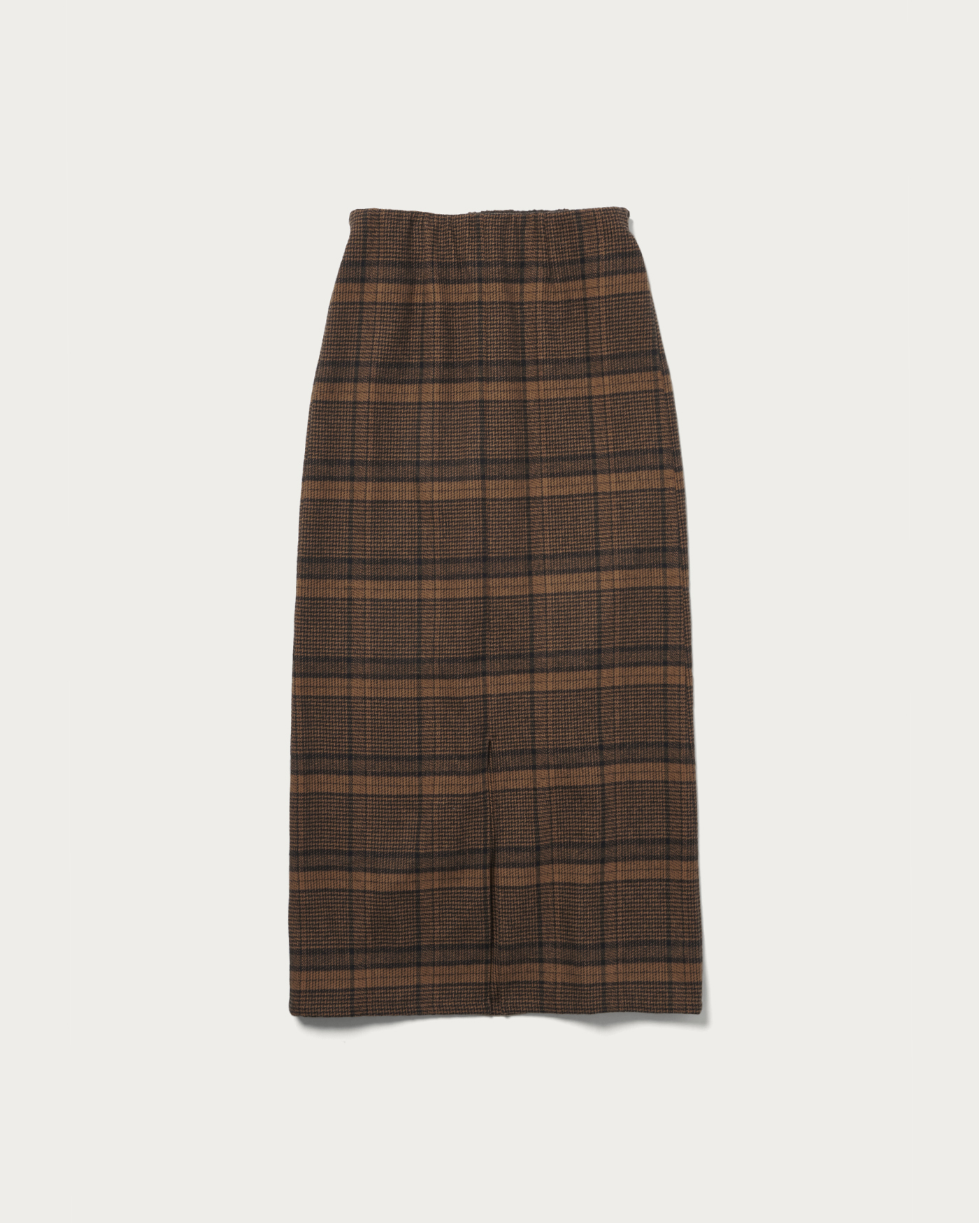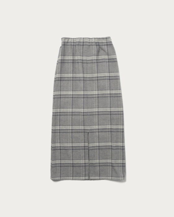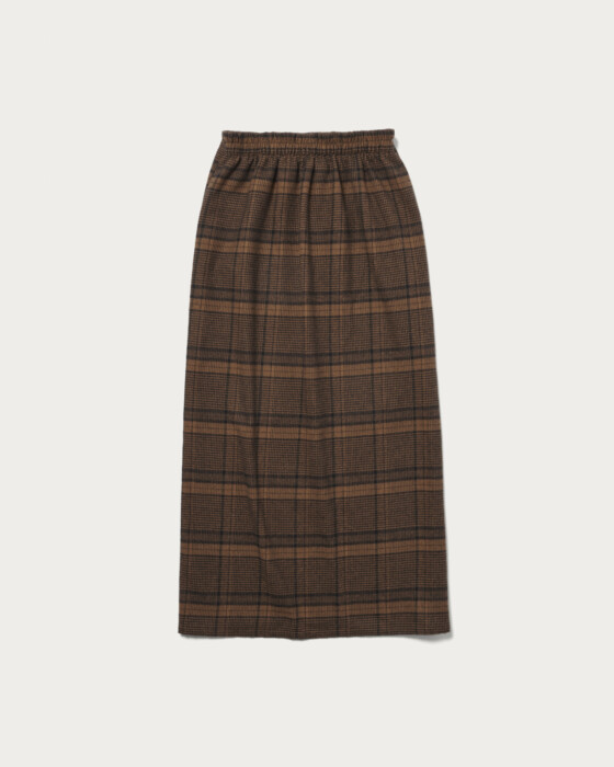ヴィンテージライクな生地の風合いでクラシカルな雰囲気にしてくれるオリジナルのチェック柄のナロースカート。程よいゆとりのあるサイジングで前はすっきり見え、後ろはウエストゴム仕様で楽な穿き心地です。上品でスタイリングの主役になる一着です。秋冬ムードなカラー展開も魅力的です。