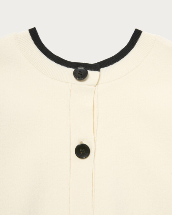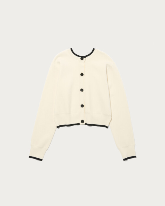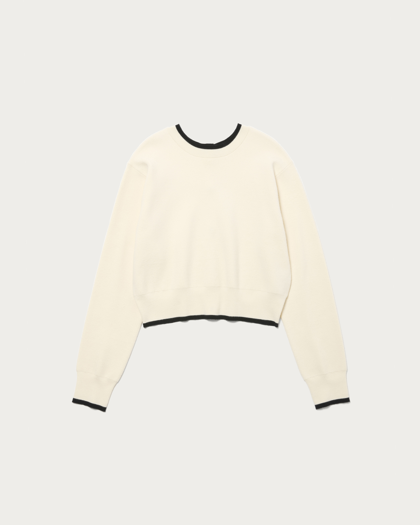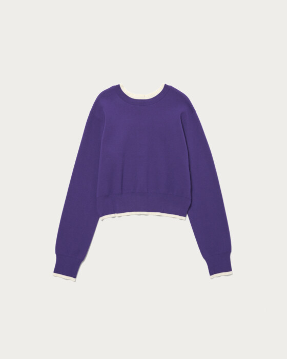 プルオーバーとカーディガンの2WAYで着られるスウェットライクなニット。配色のラインや前立てのアウトリンキング、配色ボタン等のディテールにこだわりお作りしました。もちもちしたタッチが特徴の糸をスウェットライクなスムース編みにしています。程よい厚みでフォルムがきれいにでるのがポイント。