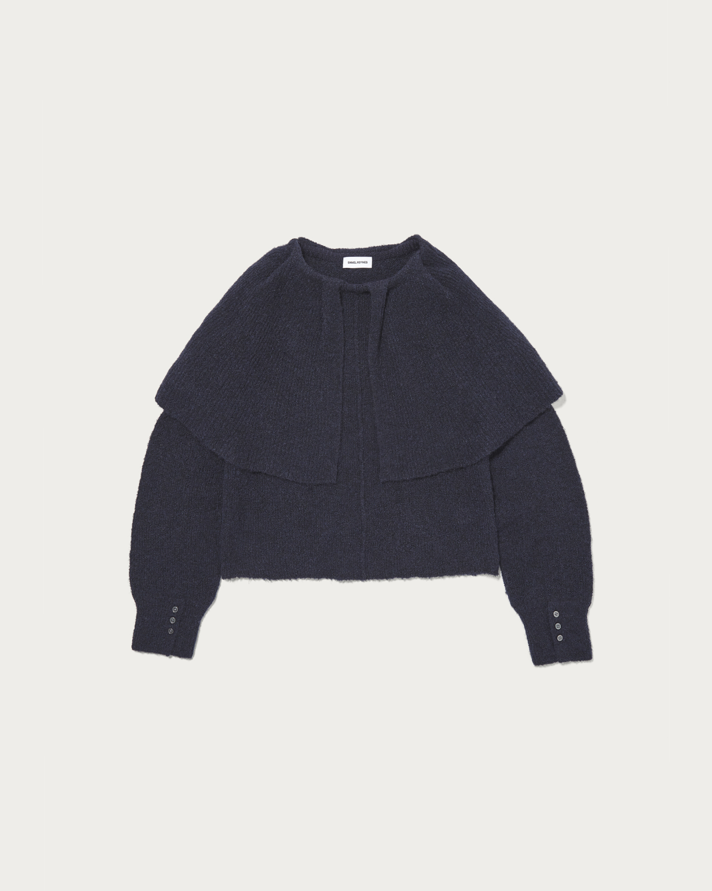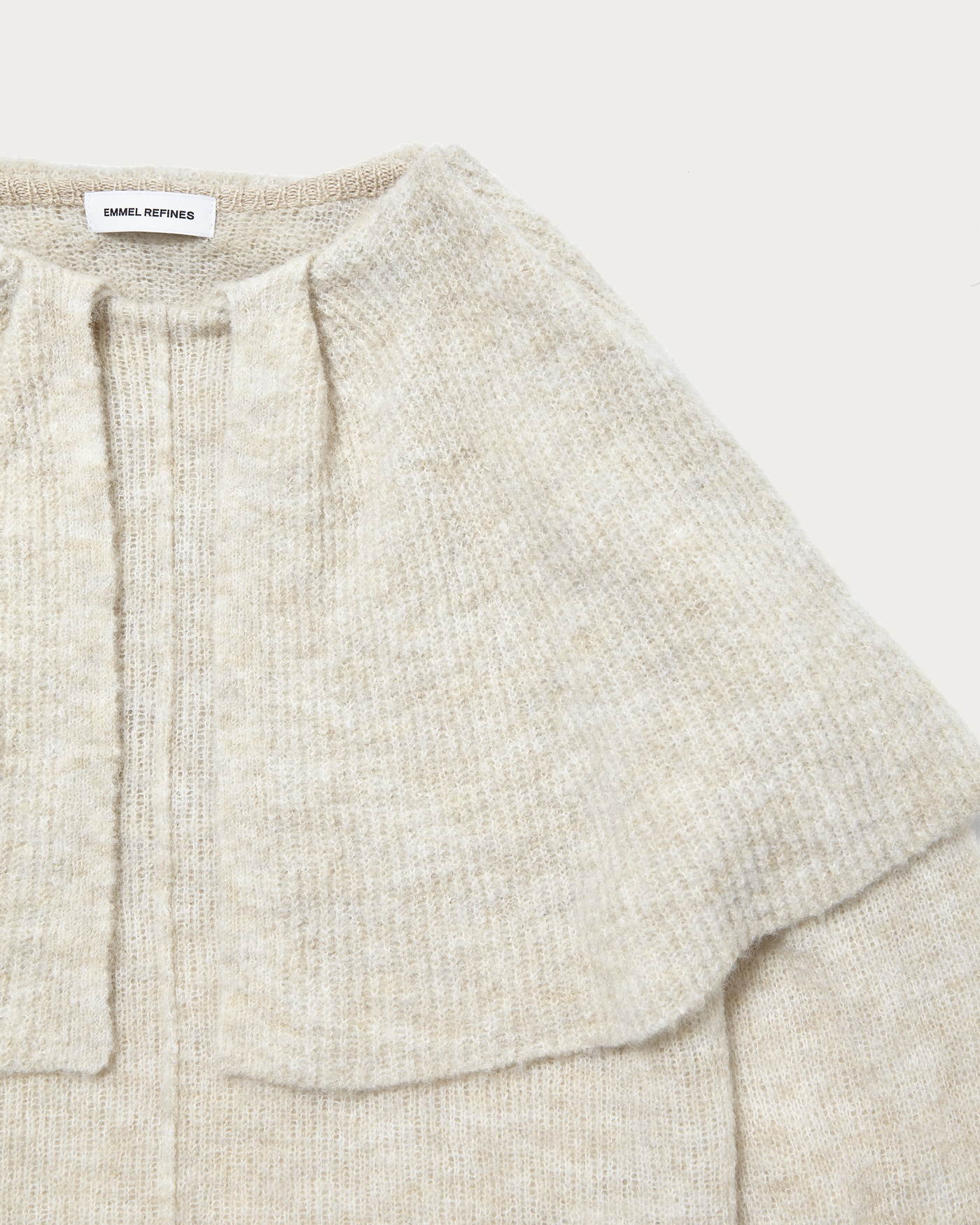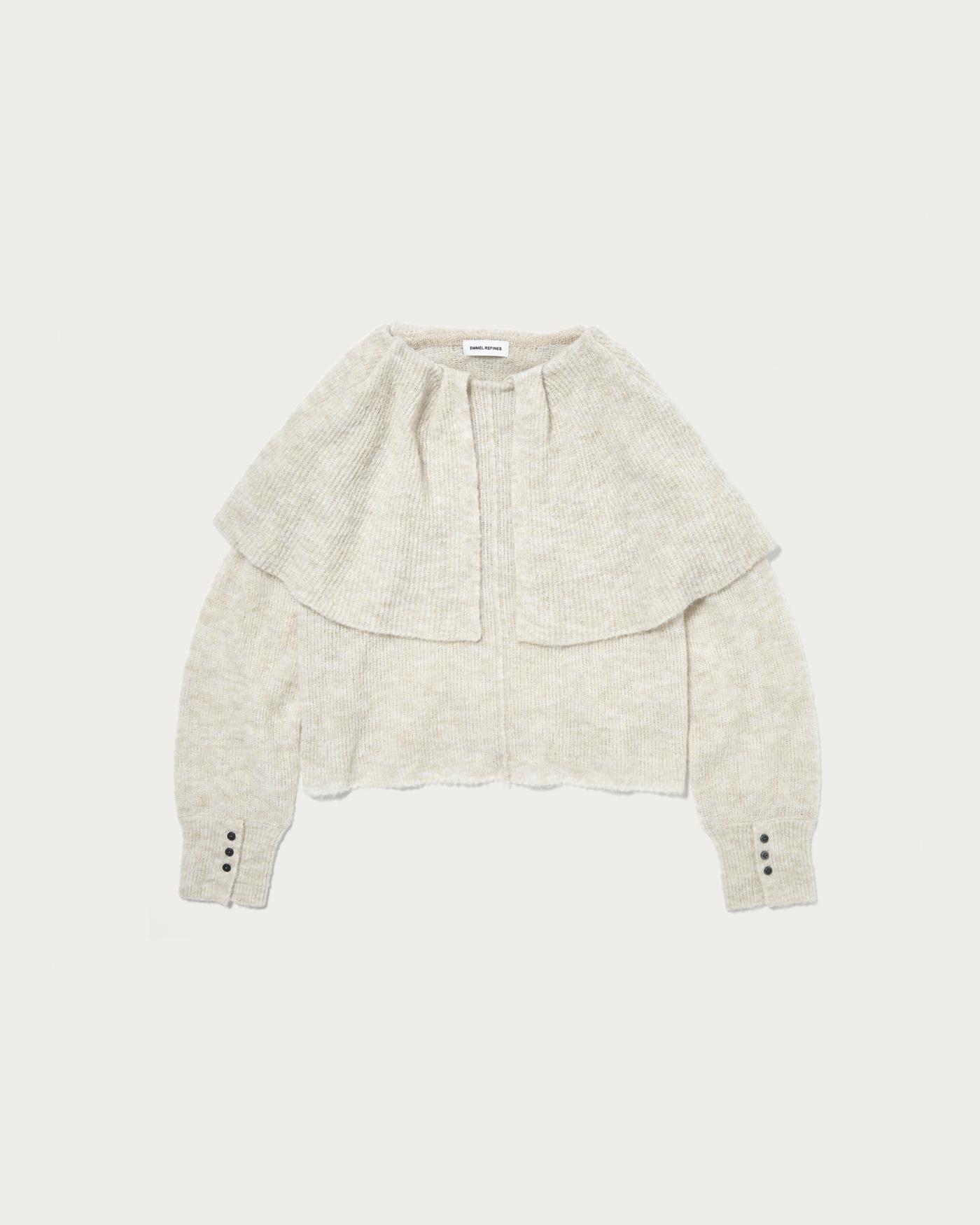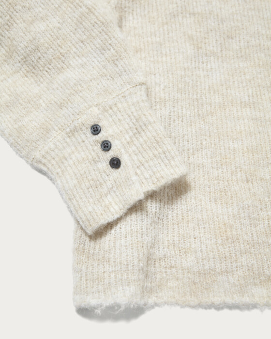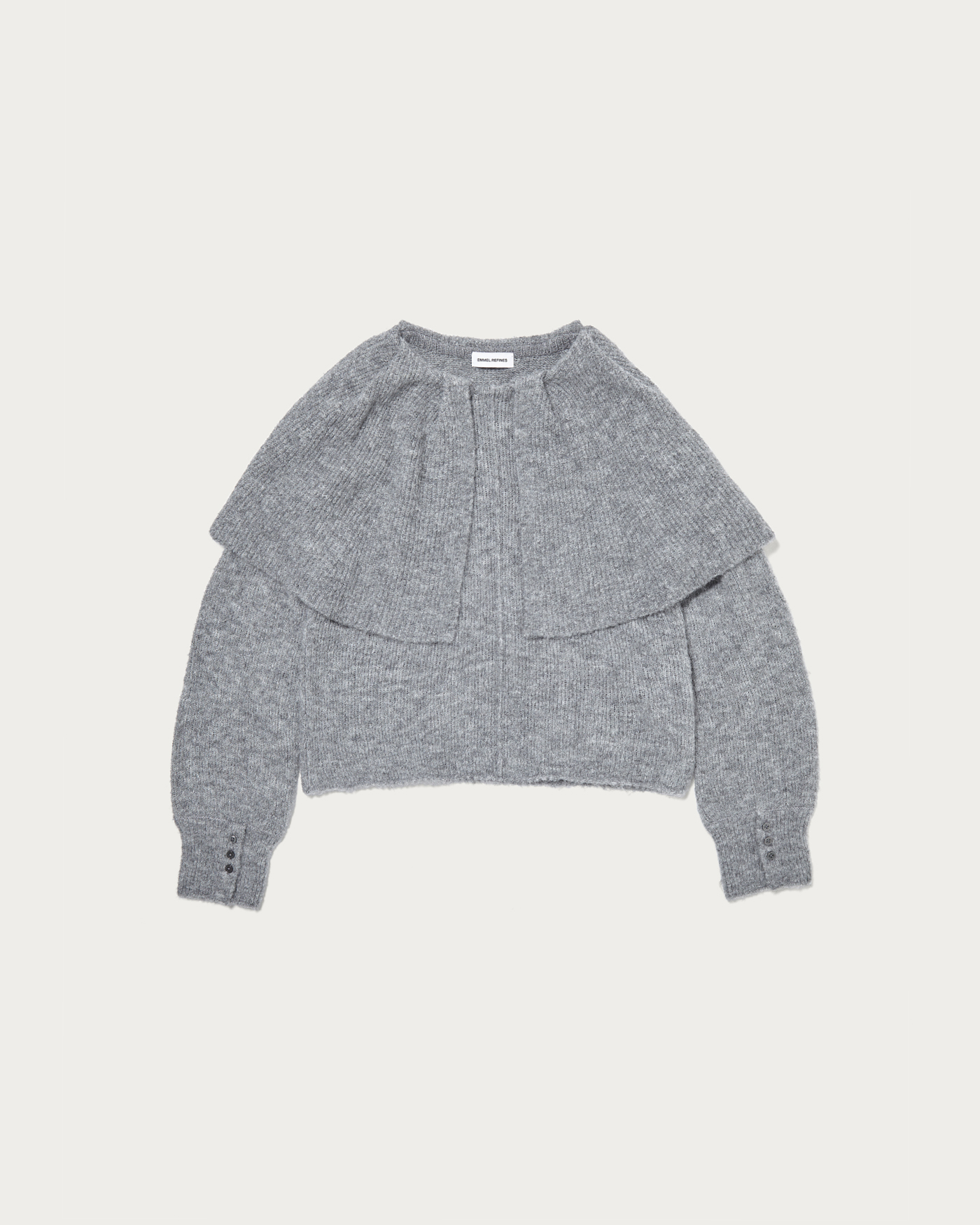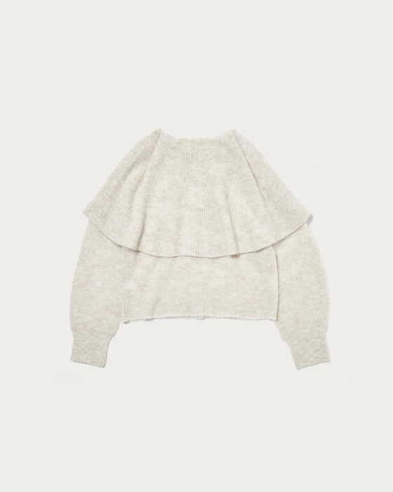 ケープ風の襟が顔周りを華やかに見せてくれるニットプルオーバー。糸自体をゆるく編むことで、少し抜け感のある風合いに仕上げています。柔らかな雰囲気できれいめすぎず、カジュアルに着こなしていただける一枚。度目を甘くゆるめに編んだ、絶妙な抜け感の柔らかな編地を使用。